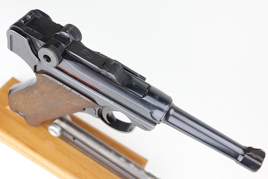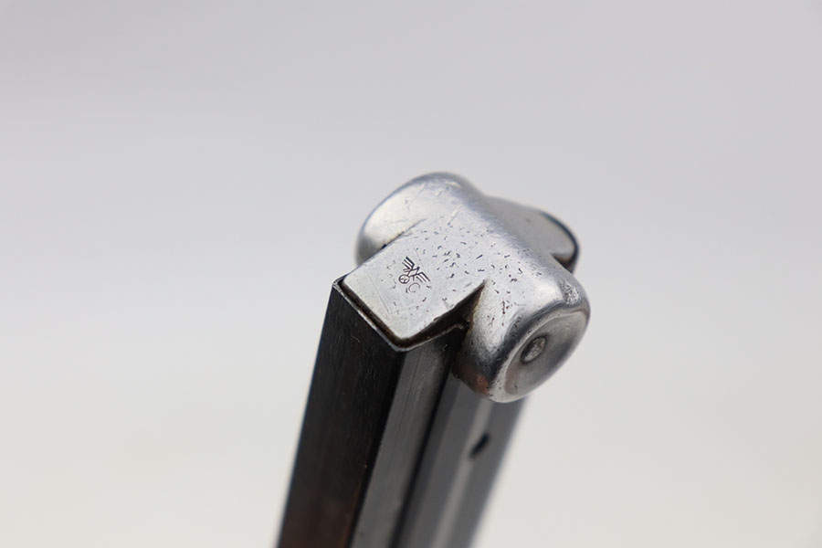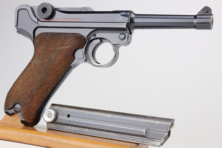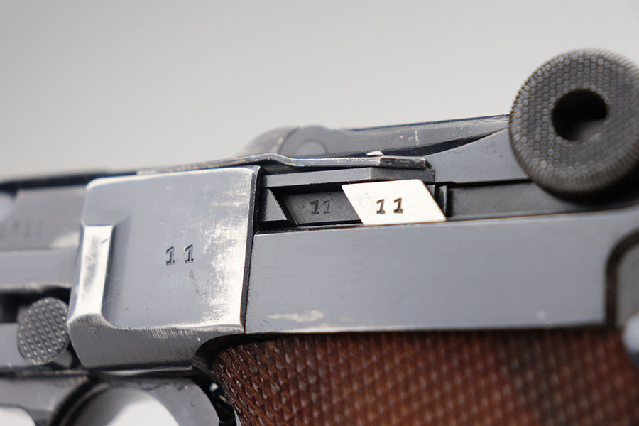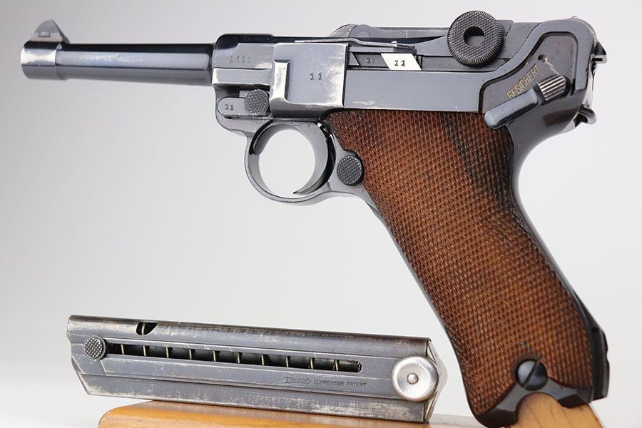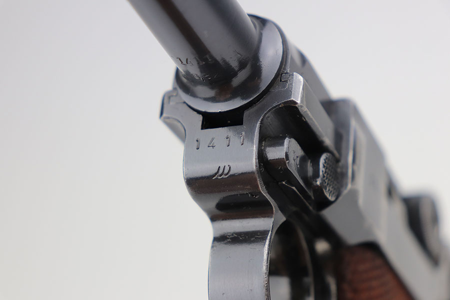 2/1/21 – This is a very rare and original Mauser Luger that was issued to the German Police in 1939, and is marked with Eagle/C proof on receiver. It’s all matching and original with nearly all the bluing loss on the sideplate and left side of barrel. It’s otherwise in excellent condition. There were only about 1,300 of this variation produced. Excellent grips with no defects. Magazine is also Eagle/C proofed and unnumbered.
