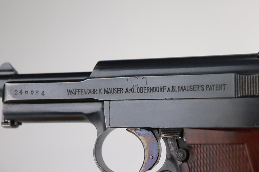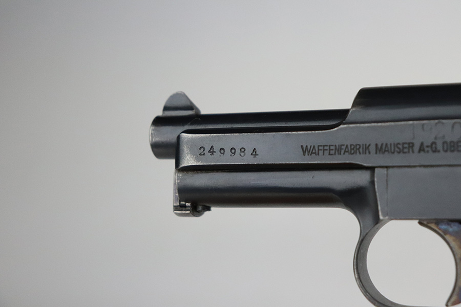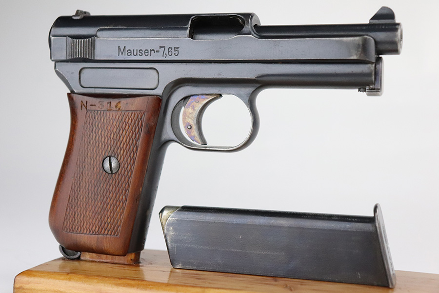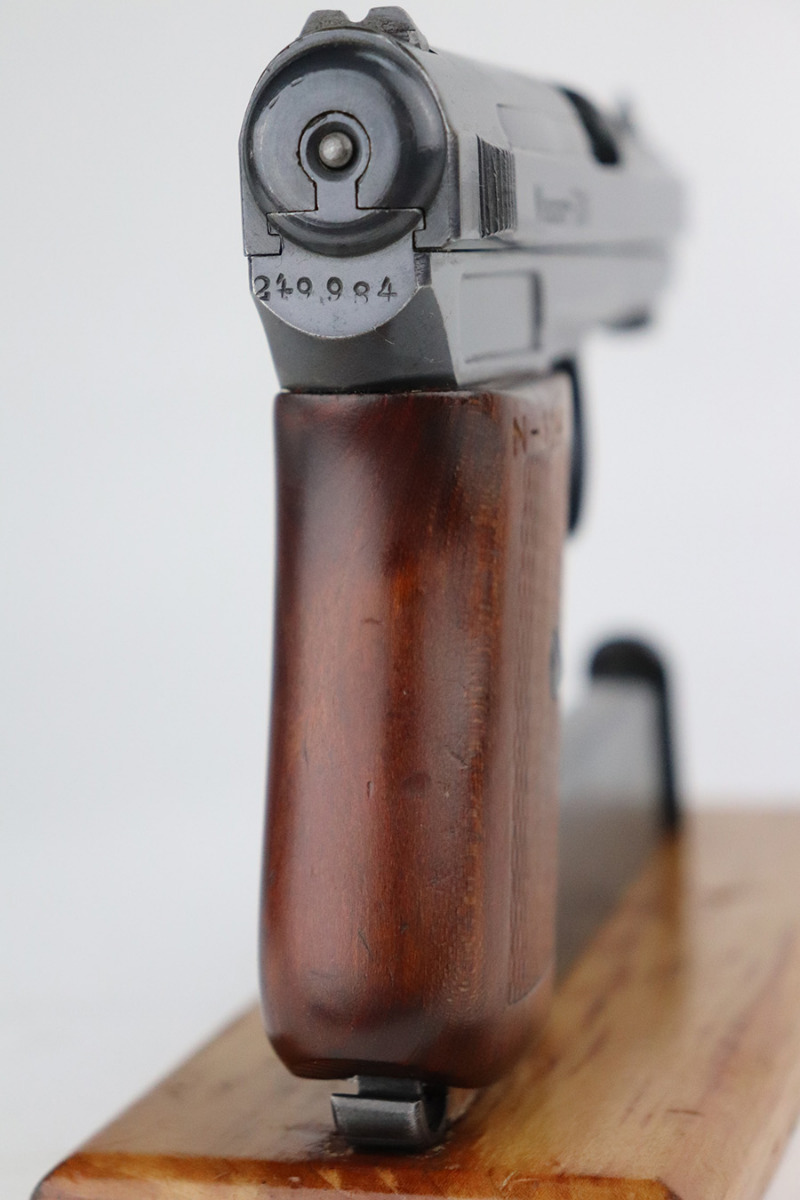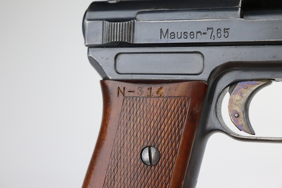 7/22/21 – This is an excellent Mauser Model 1914 that was issued to the Duisburg-Hamborn Police following the Treaty of Versailles. It has about 95% of the blue remaining with wear on the high edges and minor spots of bluing loss on the front strap and trigger. Shiny bore with good rifling. The magazine is police-numbered on the base but it’s mismatched to this pistol. Front strap is marked S.D.IV.1.7.R.29, and the grip has N-314 stamped into it but unsure the significance of this marking.