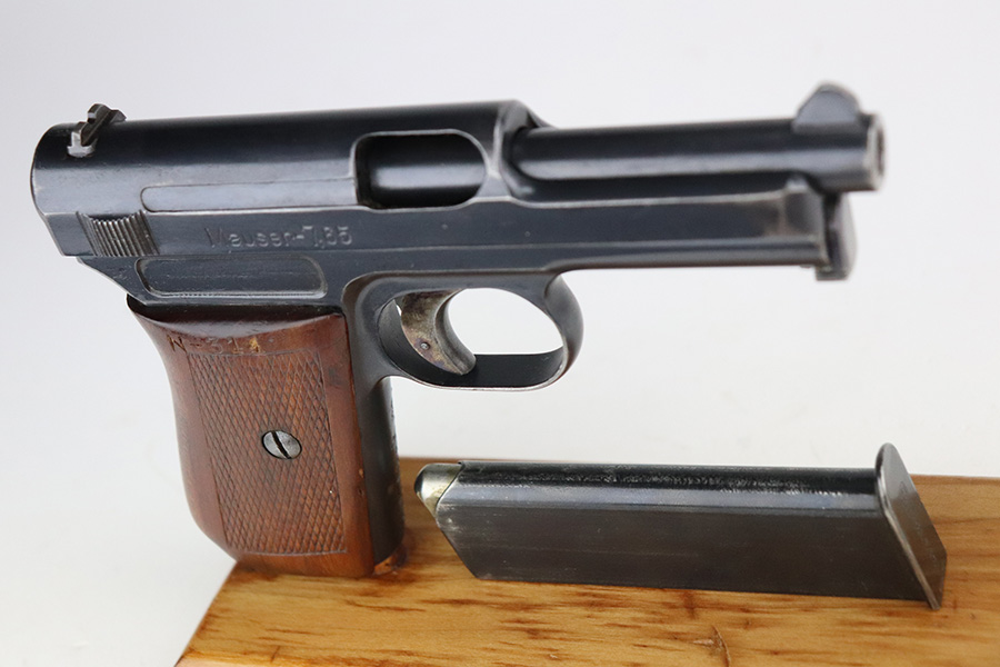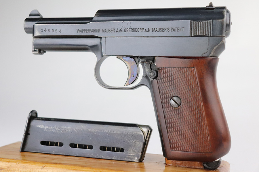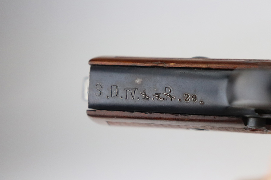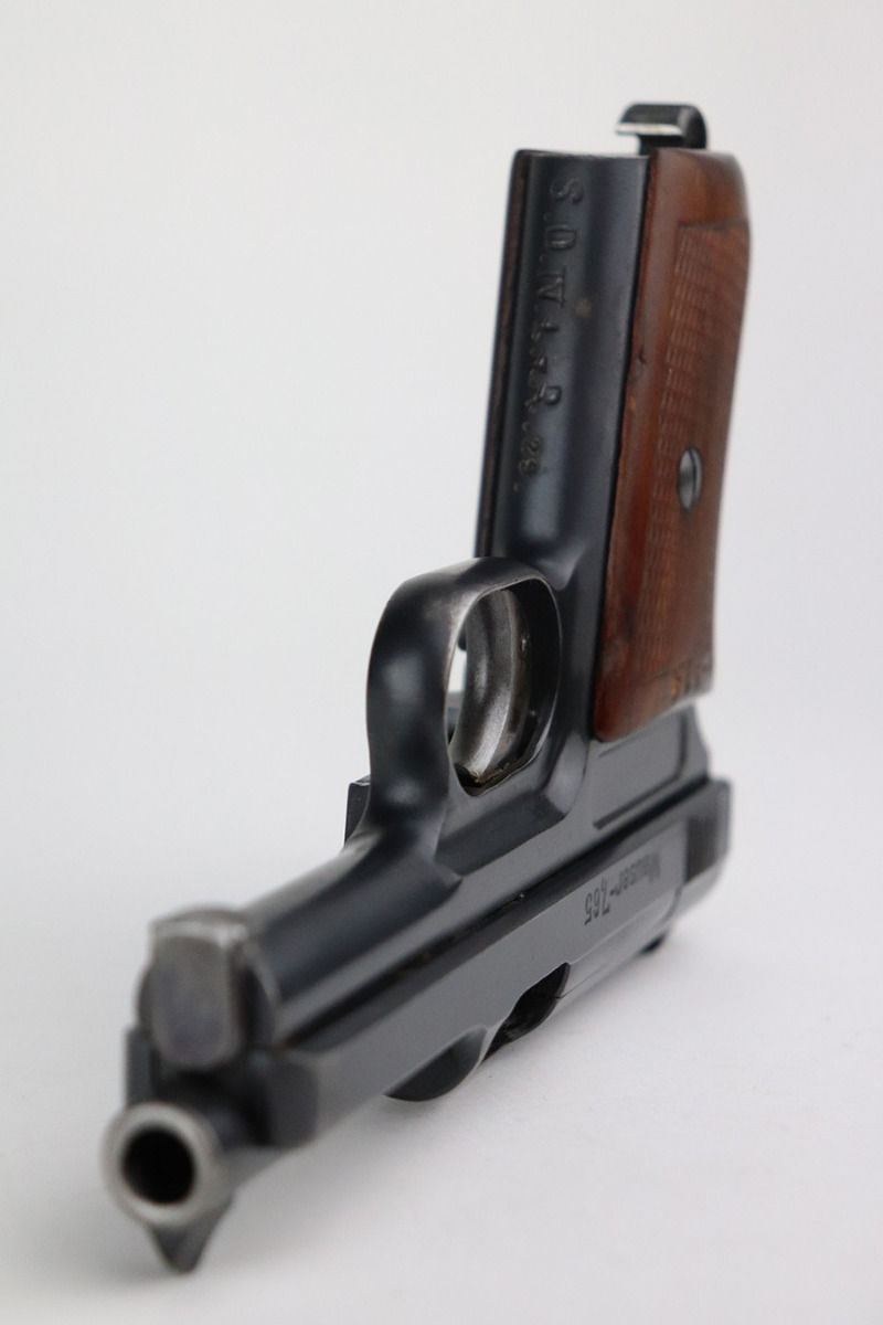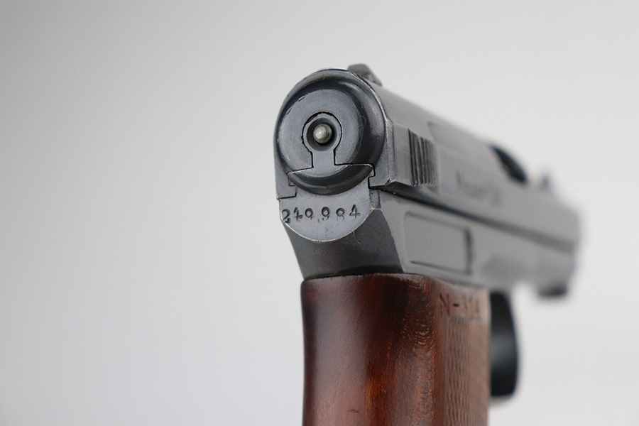 7/22/21 – This is an excellent Mauser Model 1914 that was issued to the Duisburg-Hamborn Police following the Treaty of Versailles. It has about 95% of the blue remaining with wear on the high edges and minor spots of bluing loss on the front strap and trigger. Shiny bore with good rifling. The magazine is police-numbered on the base but it’s mismatched to this pistol. Front strap is marked S.D.IV.1.7.R.29, and the grip has N-314 stamped into it but unsure the significance of this marking.