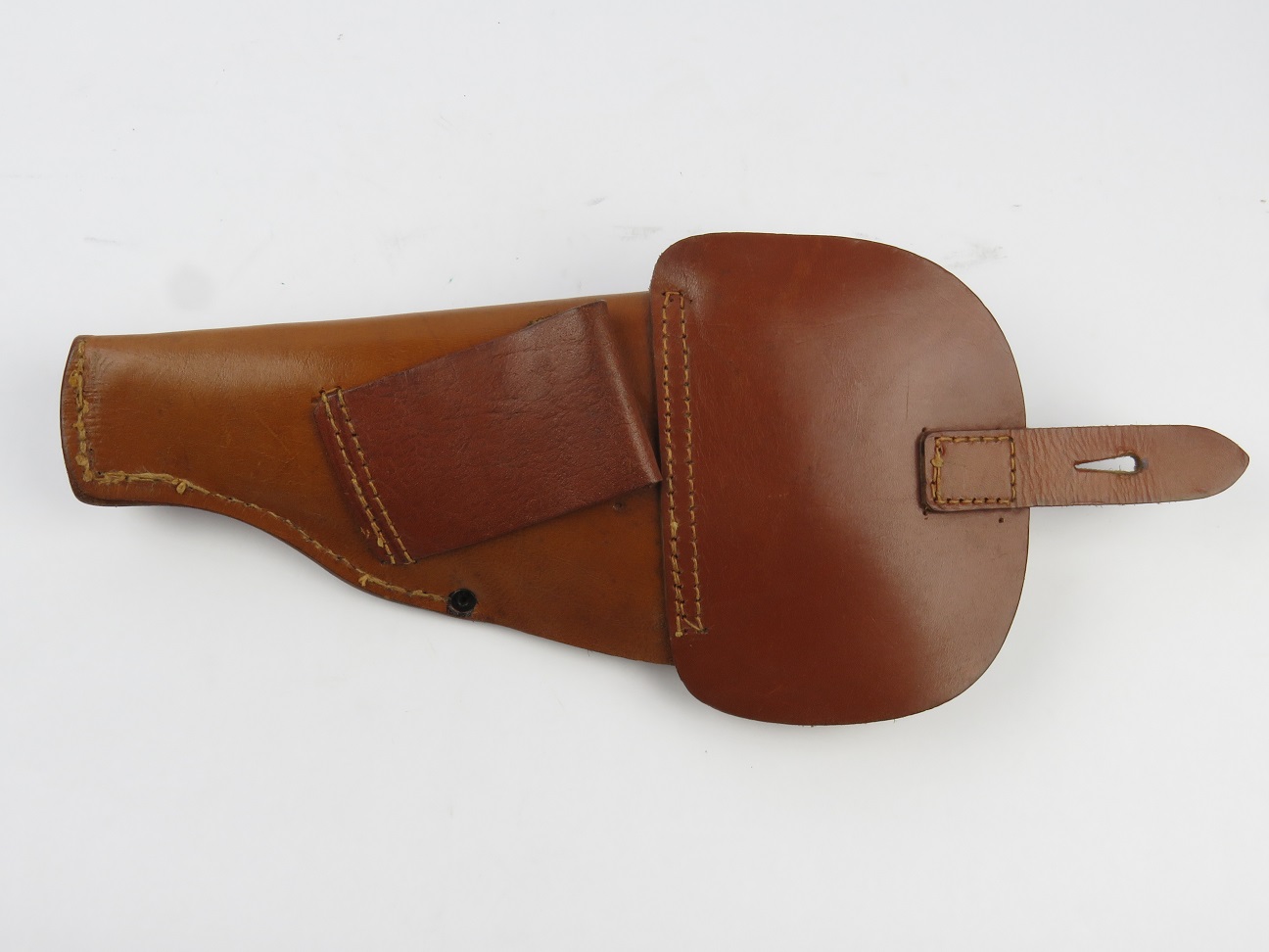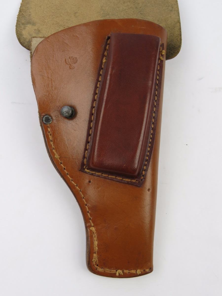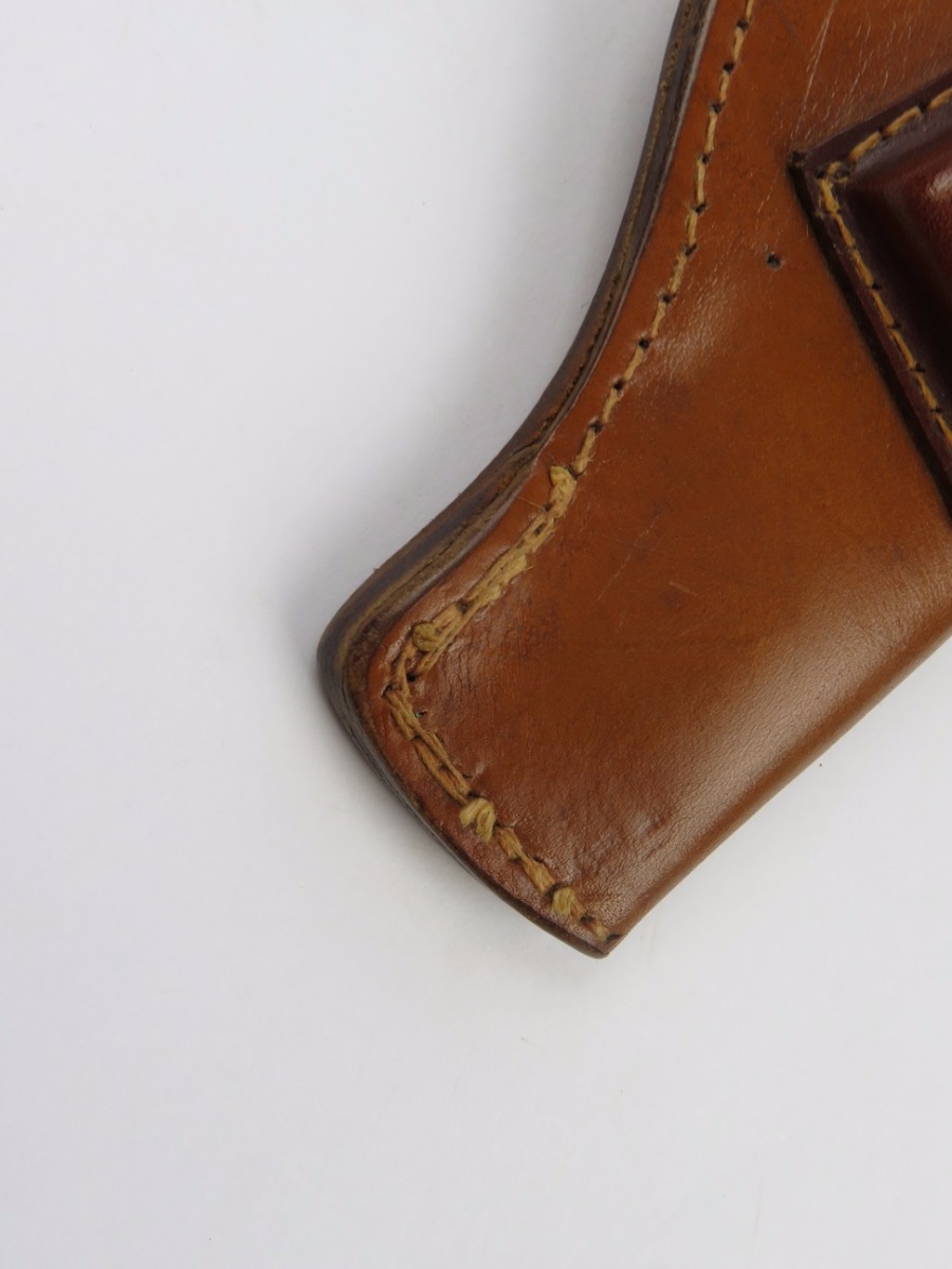 7/26/17 – This is an excellent, unissued condition Mauser police pistol holster from WW2. The holster is stamped with a police eagle mark, and no other markings. The leather is very clean and strong. The stitching is all original and excellent. The base of the holster is double and triple stitched, and I’m not sure why. However this appears all original and correct. Fits a model 1934 or similar sized pistol.