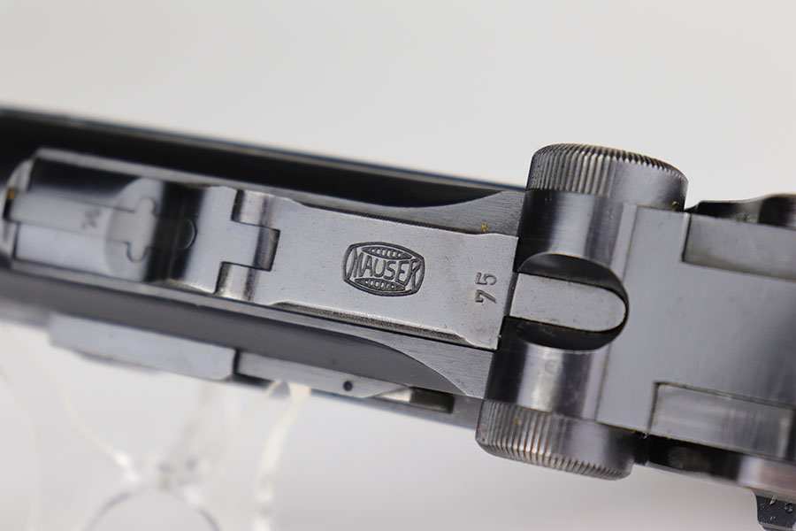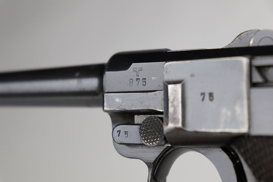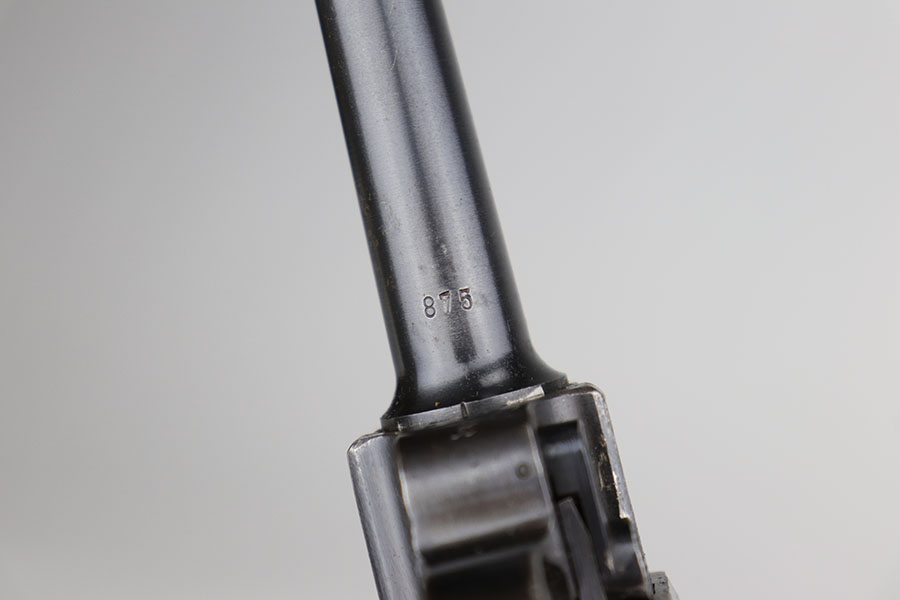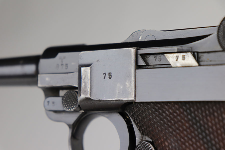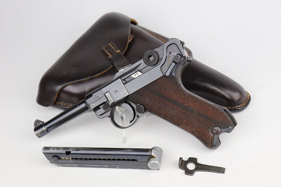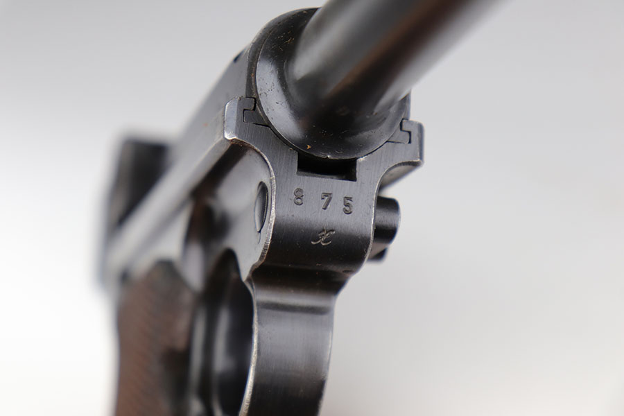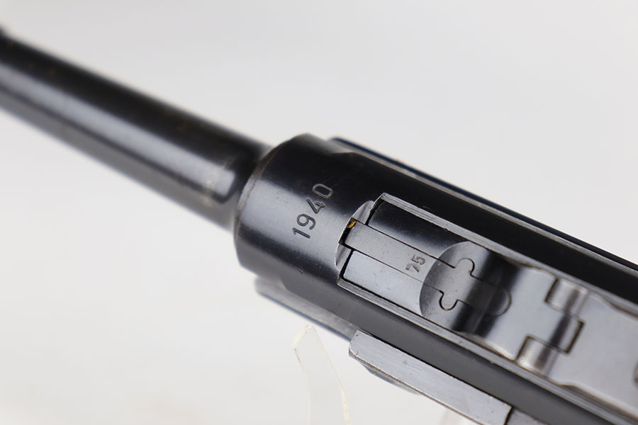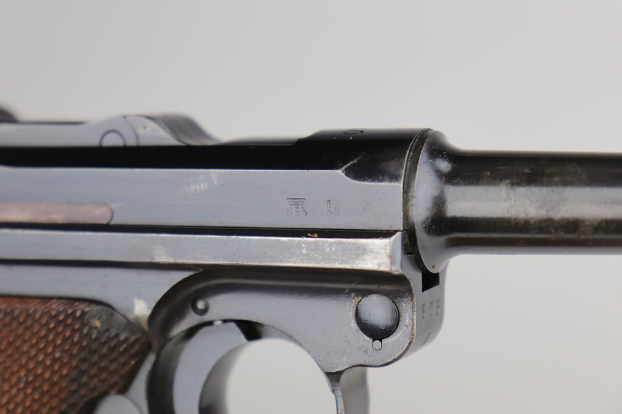 8/12/20 – This is a super rare Mauser Banner Luger that was issued to the German police but later diverted to the military before the order was completed. This variation is documented in Hallock’s book on the Luger, and this particular pistol was also shown to Hallock (we will include a printout of the email discussion). You’ll notice that this small order of pistols, from serial 602x-1547x, have only two military inspection marks on the receiver. This one, along with most observed examples, is drilled for the sear safety but there is not one installed. The magazine is matching numbered to the pistol in the police style. Hallock’s opinion is that this block of Lugers was rejected by the Heerswaffenamt inspector for unknown reason. This particular pistol has some wear on the sideplate, muzzle and right side of barrel. Majority of the finish loss is on the straps though. Excellent bore and grips, which are not marked. Listing includes an unmarked tool, and an excellent 1940 dated holster with Karl Bocker maker mark.