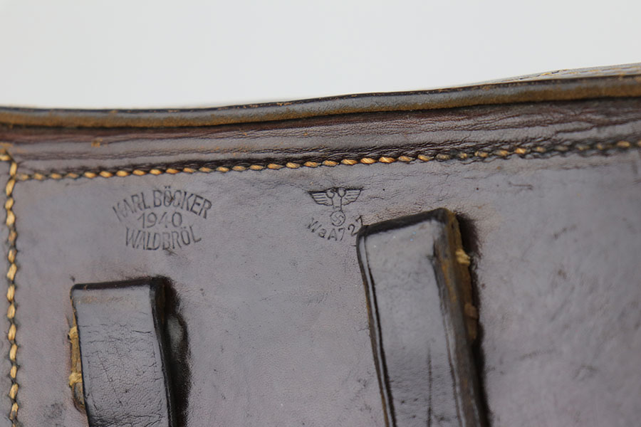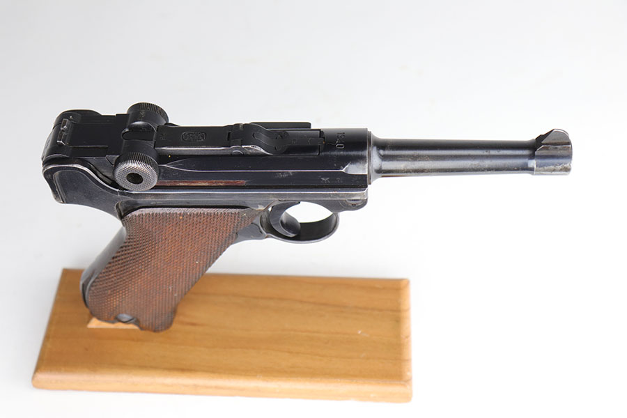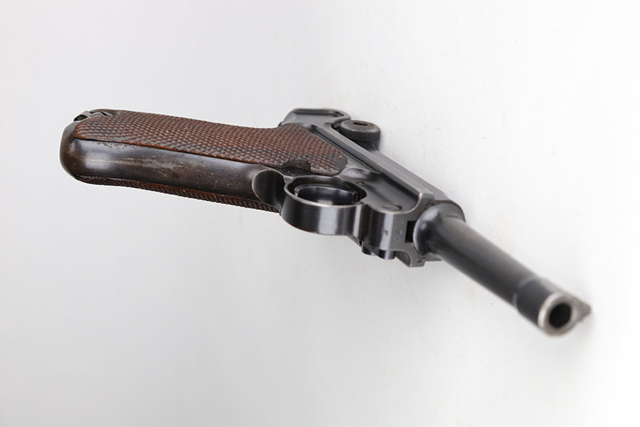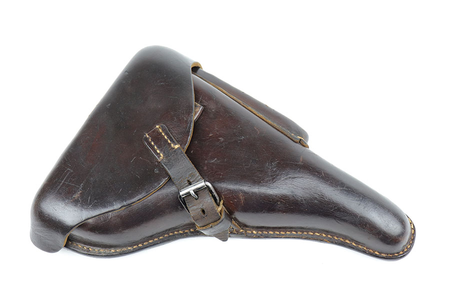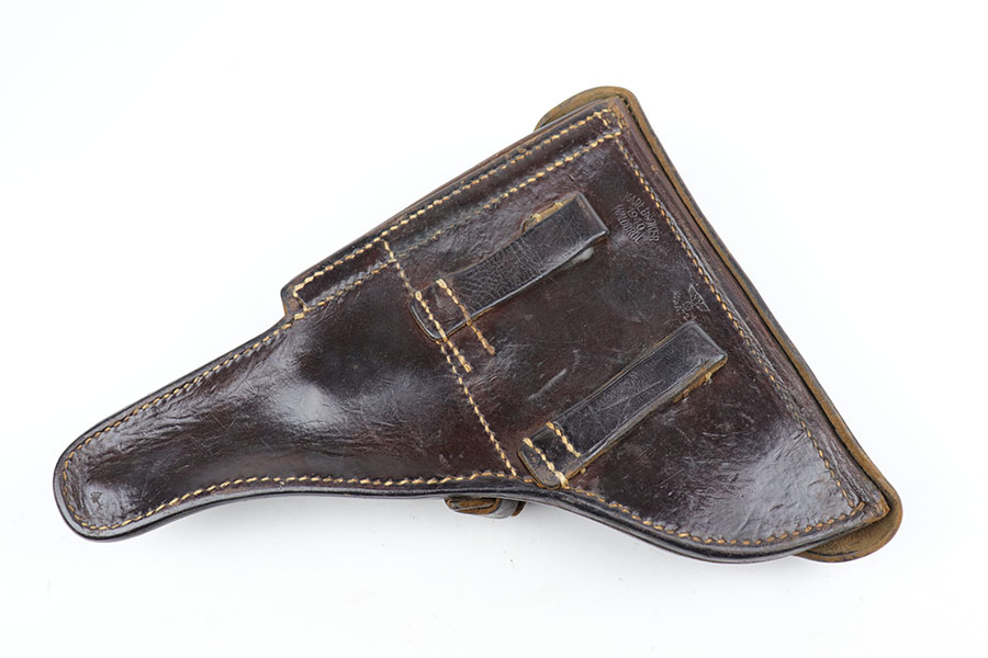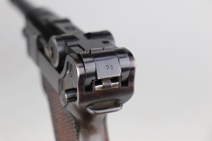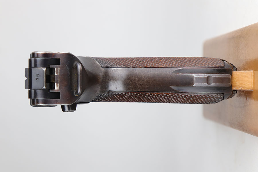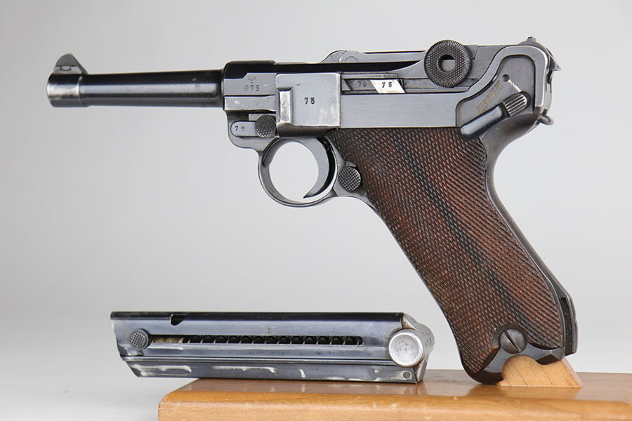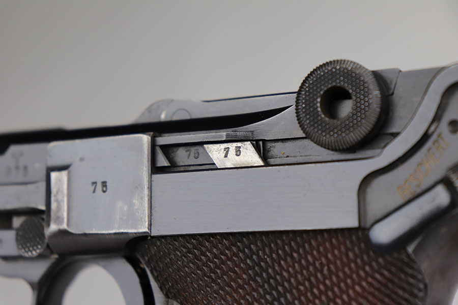 8/12/20 – This is a super rare Mauser Banner Luger that was issued to the German police but later diverted to the military before the order was completed. This variation is documented in Hallock’s book on the Luger, and this particular pistol was also shown to Hallock (we will include a printout of the email discussion). You’ll notice that this small order of pistols, from serial 602x-1547x, have only two military inspection marks on the receiver. This one, along with most observed examples, is drilled for the sear safety but there is not one installed. The magazine is matching numbered to the pistol in the police style. Hallock’s opinion is that this block of Lugers was rejected by the Heerswaffenamt inspector for unknown reason. This particular pistol has some wear on the sideplate, muzzle and right side of barrel. Majority of the finish loss is on the straps though. Excellent bore and grips, which are not marked. Listing includes an unmarked tool, and an excellent 1940 dated holster with Karl Bocker maker mark.