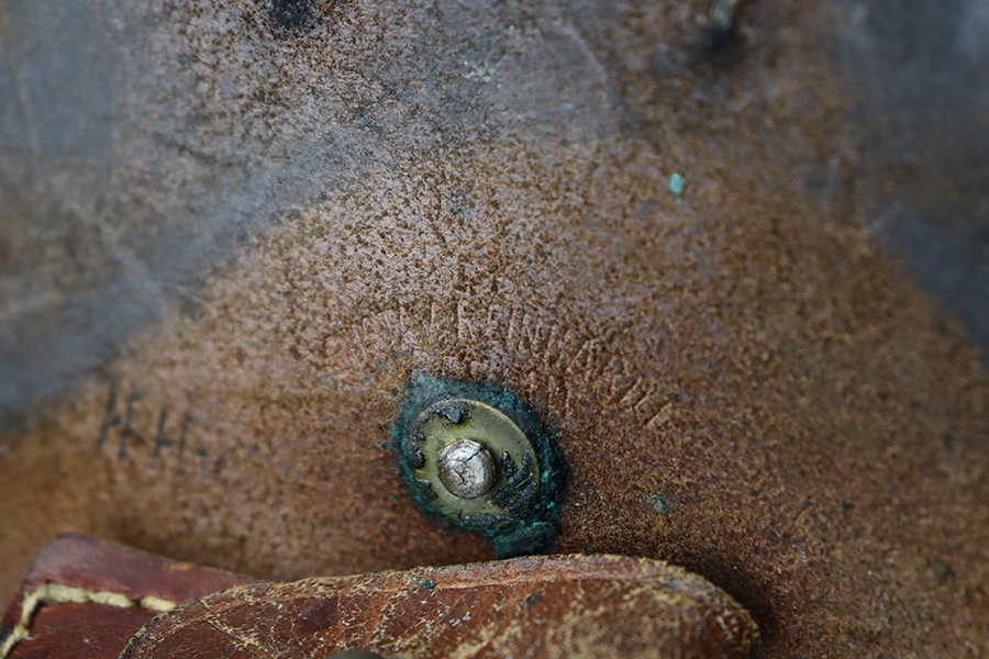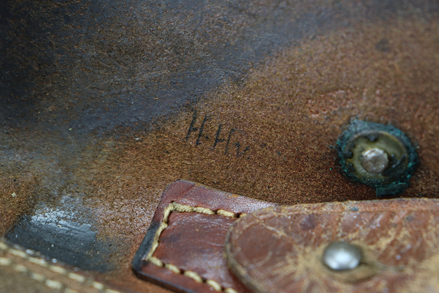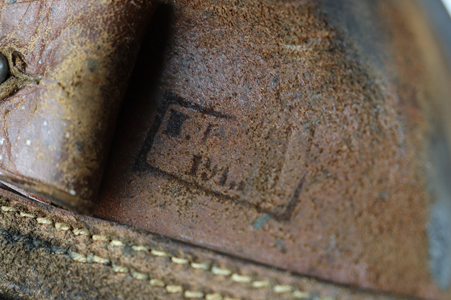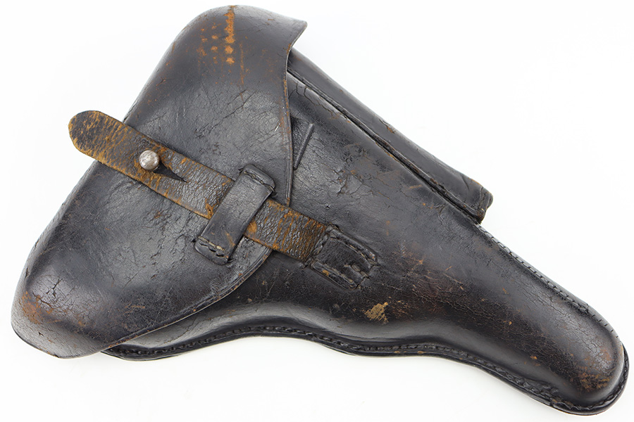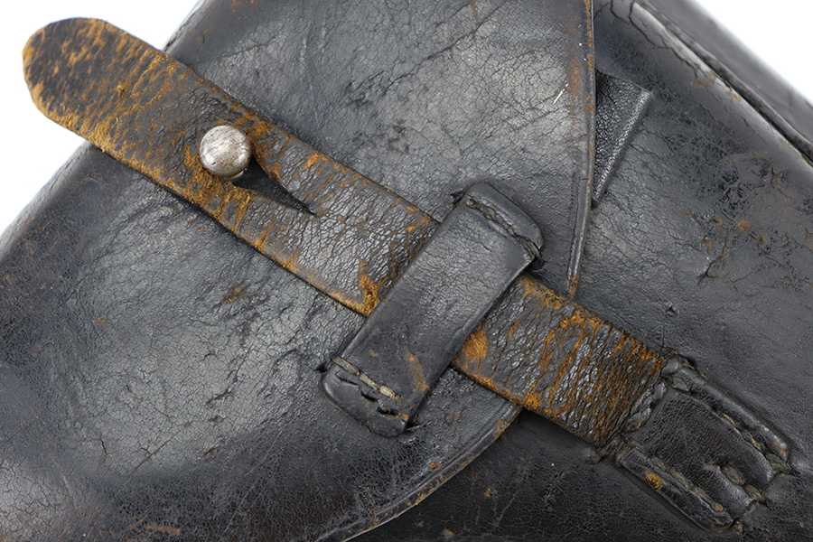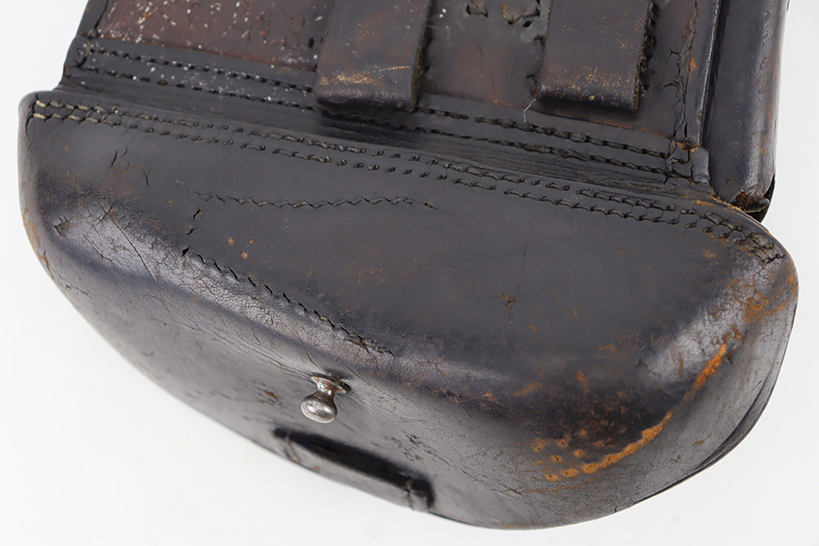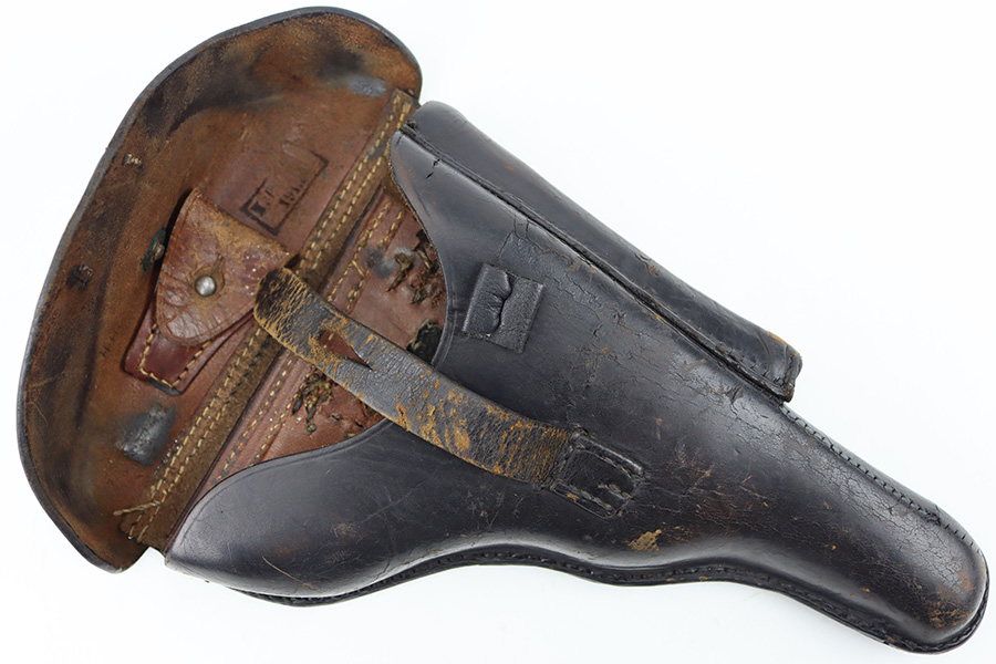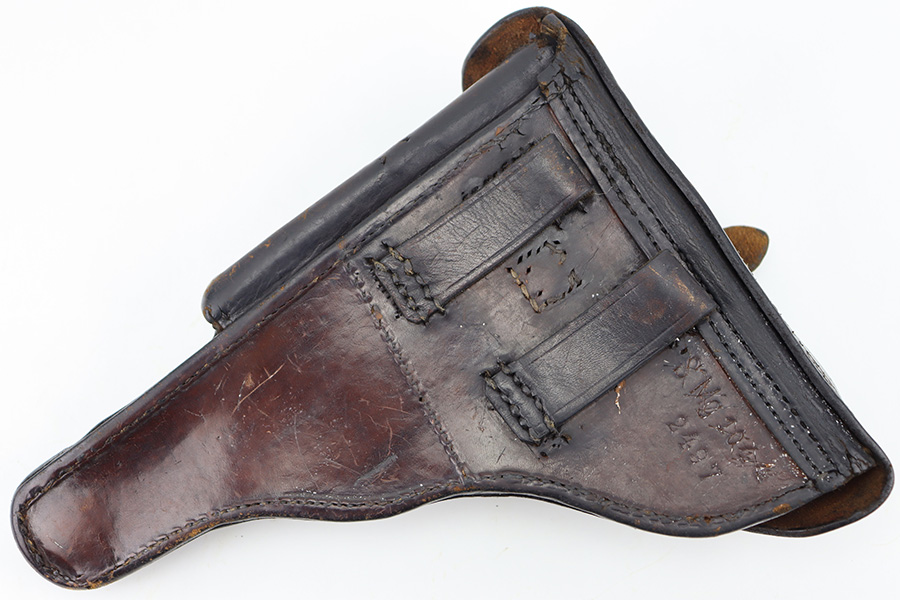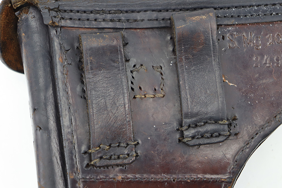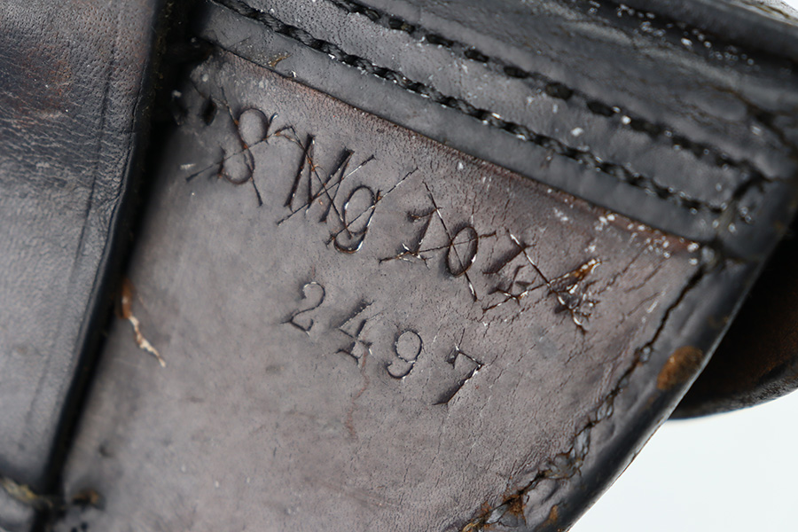 1/2/24 – This is a WW1 era Artillery Luger holster that was later modified (either at the end of WW1 or post-WW1 Weimar era) for use by the Police. This is indicated by the extra holes where stitching was on the back leather and side leather, below the magazine pouch. The holster would have been shortened and re-stitched for use with Police Lugers. The belt loops currently present on the holster were added at this time of modification as well. The back leather shows a unit marking and number. The interior leather has a WW1 era maker and date stamp, likely from when this was part of an Artillery Luger holster. The leather is soft and pliable, with normal wear throughout. Priced according to condition. An interesting example which helps show how the Germans adjusted post-WW1.