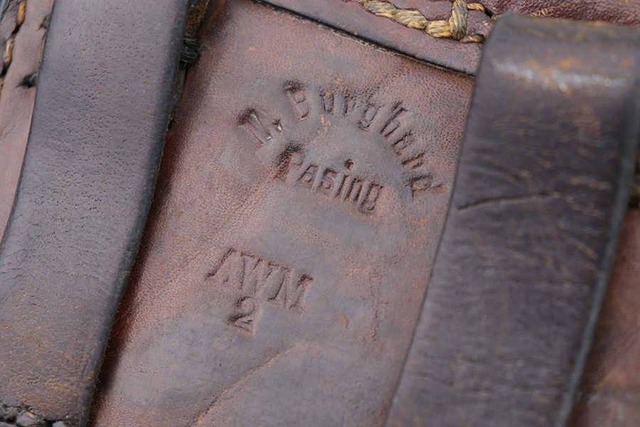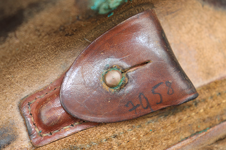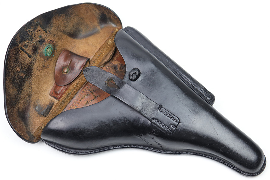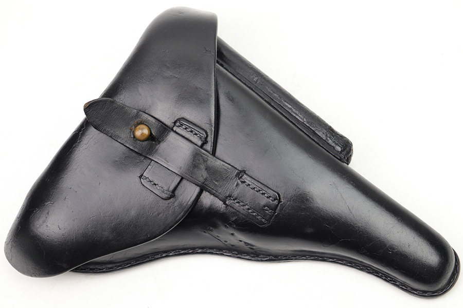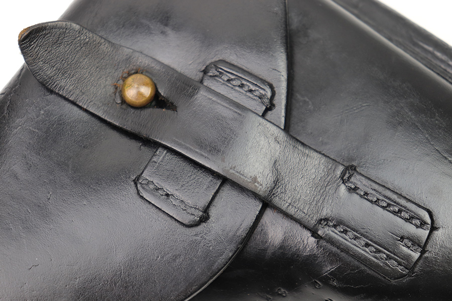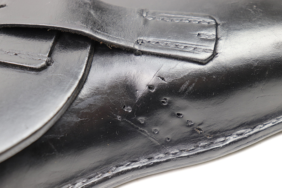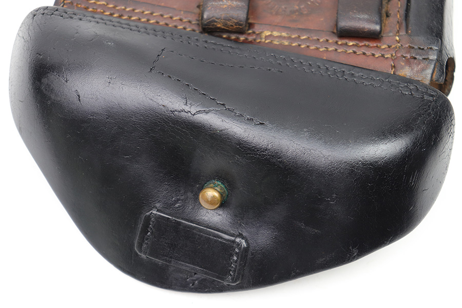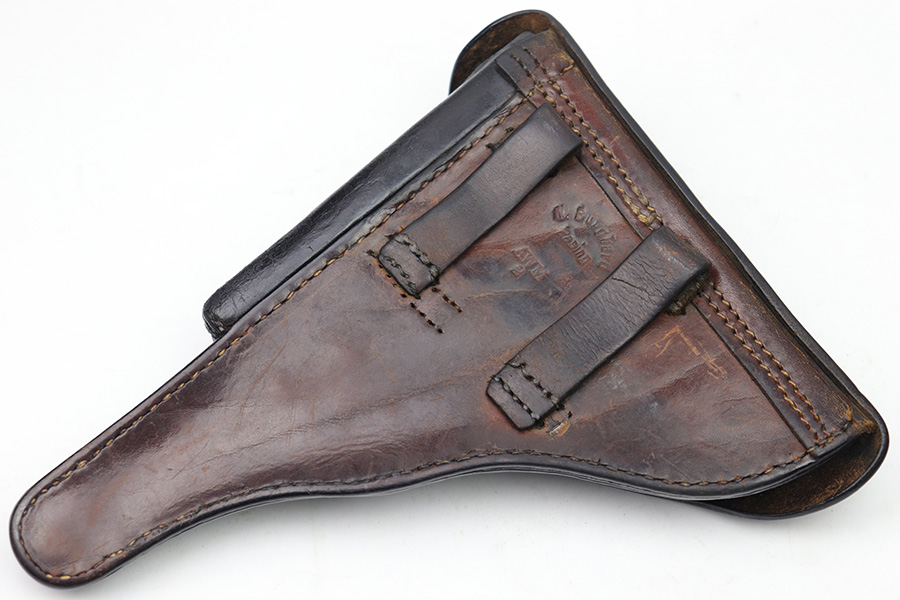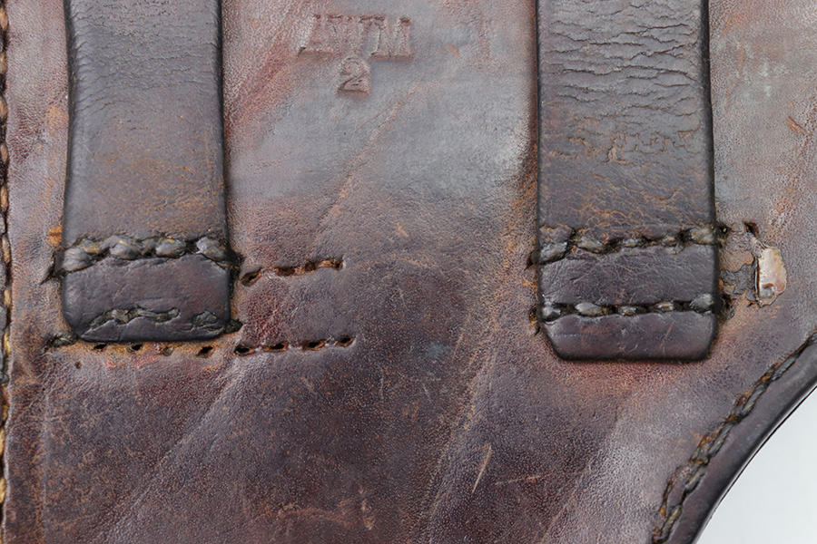 2/7/23 – This is an original WW1 production Luger holster that was later modified by the German police. The holster has black dyed leather on the front, and the back leather is still brown, as shown. The back leather is maker stamped “N. Burghard” and is also stamped “AWM 2”. We think these are original stamps as part of a WW1 production holster. The front leather shows evidence that the closure strap was moved, and a police luger holster lid was added. The police often modified holsters from WW1 and this is a prime example. The interior leather is stamped “L.S.P. V. 2” which could be a unit stamp, but we’re not sure. The stitching is tight throughout the holster, but there are missing / replaced stitching on the closure strap and back belt loops. The leather is soft and pliable but has no major issues and is completely intact.
