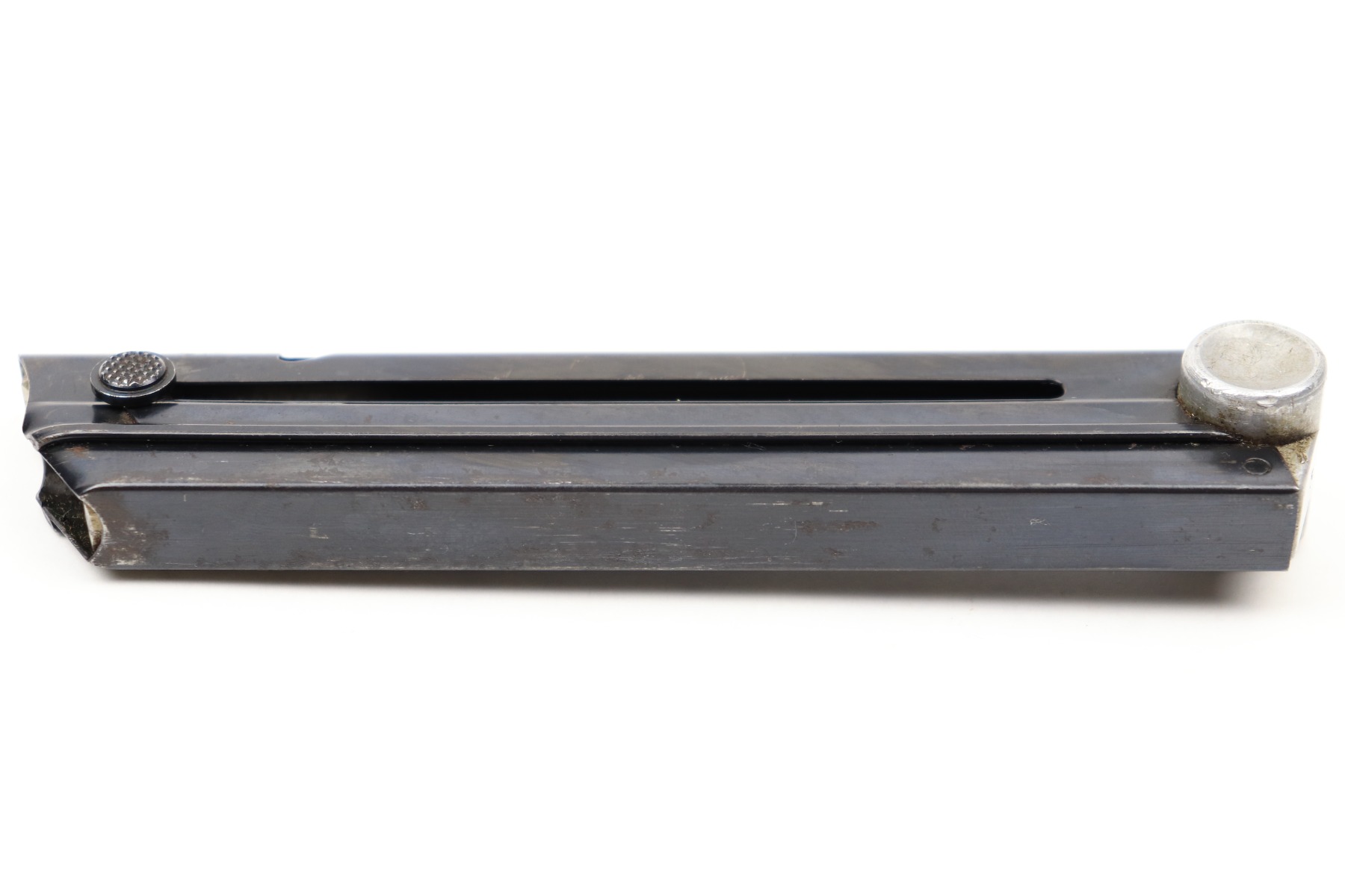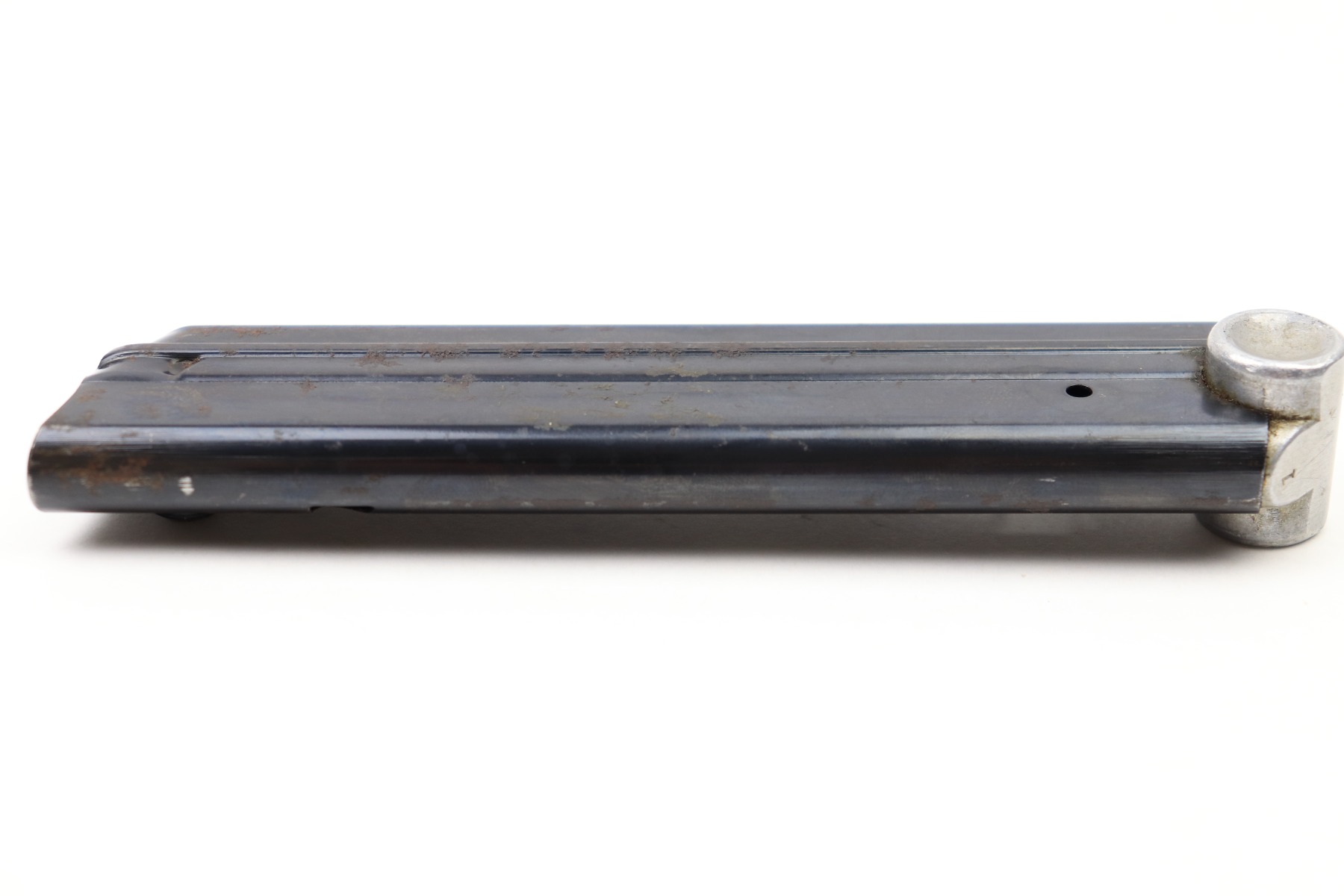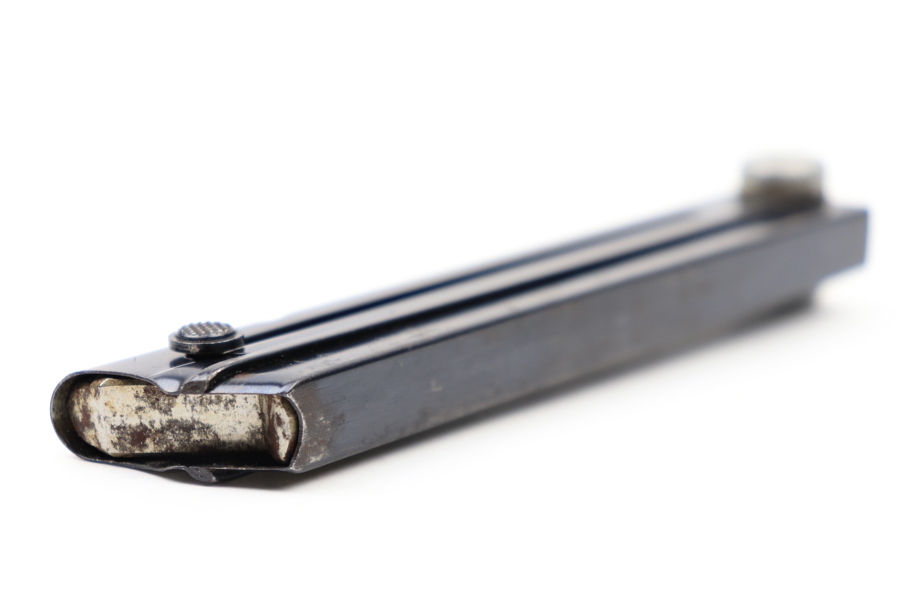 6/28/22 – This is an original WW2 era Luger magazine. The magazine has a blued tube and aluminum base. The base is serial numbered with a “1” above the serial number, which is a police style marking. The tube has some mild surface patina and some rough surface rust / textured areas on the left side among the blued finish. Spring is strong and functional.