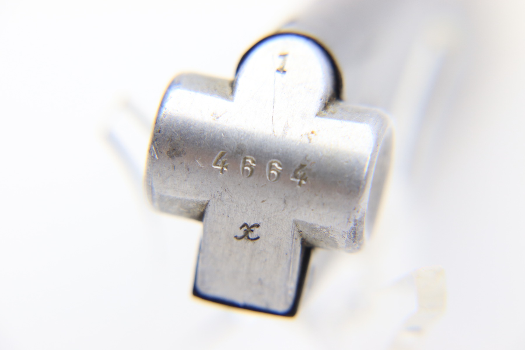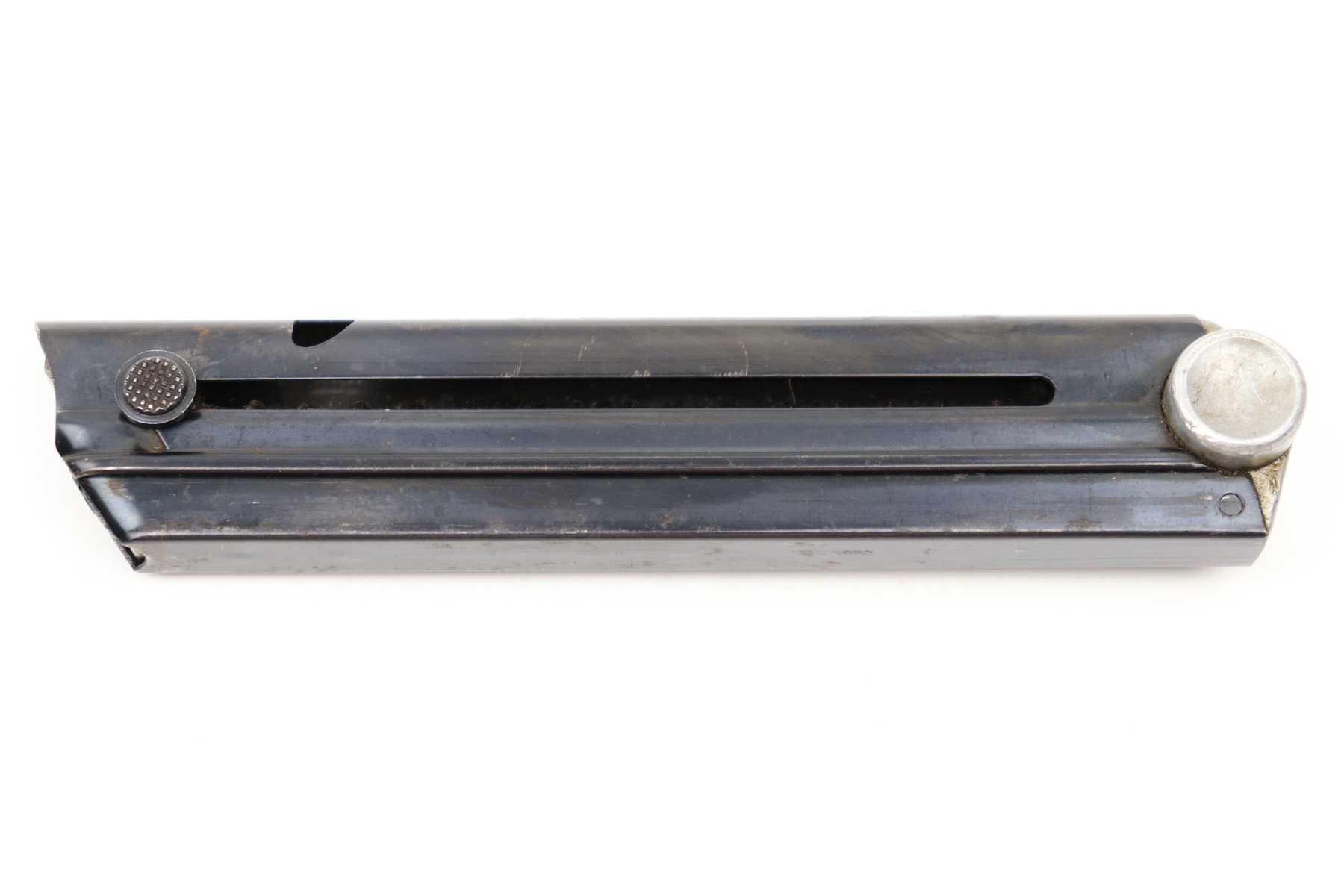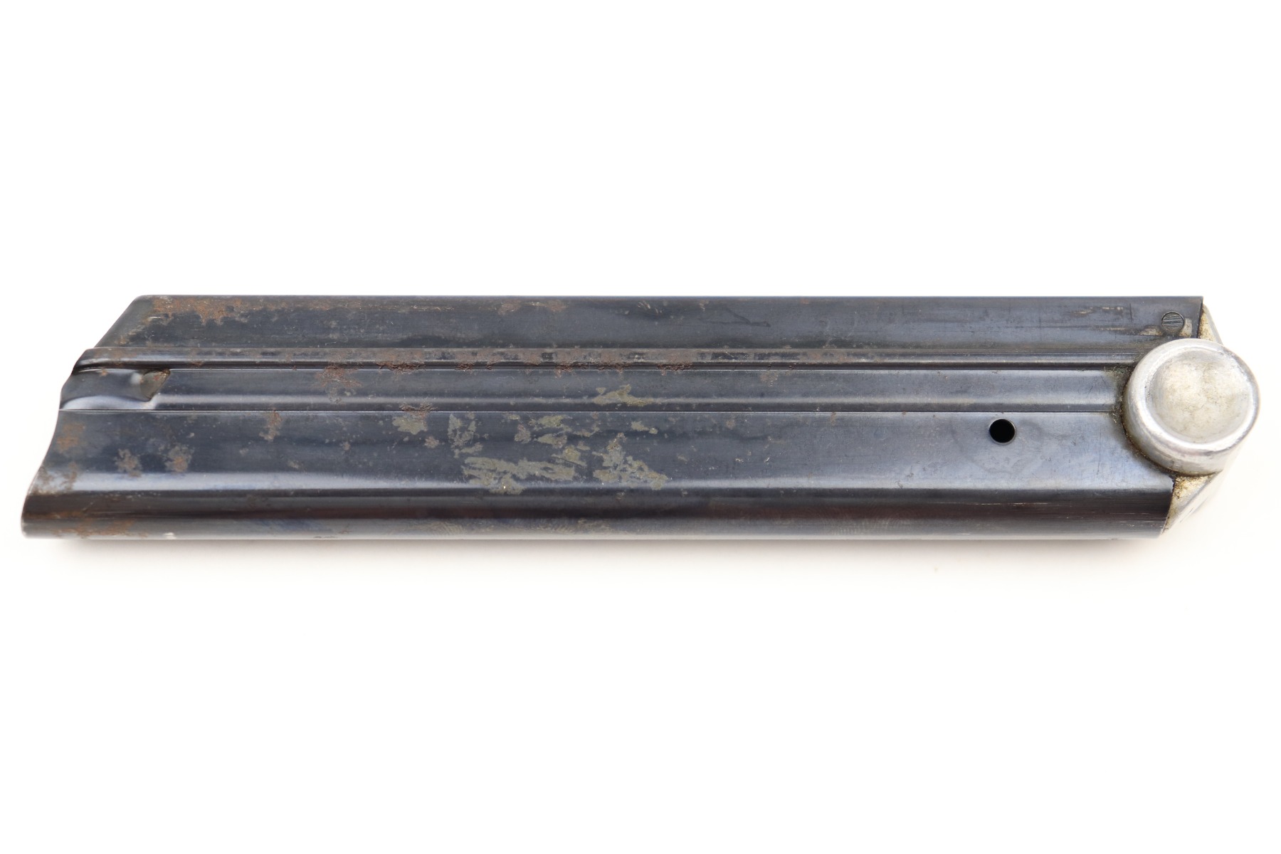 6/28/22 – This is an original WW2 era Luger magazine. The magazine has a blued tube and aluminum base. The base is serial numbered with a “1” above the serial number, which is a police style marking. The tube has some mild surface patina and some rough surface rust / textured areas on the left side among the blued finish. Spring is strong and functional.