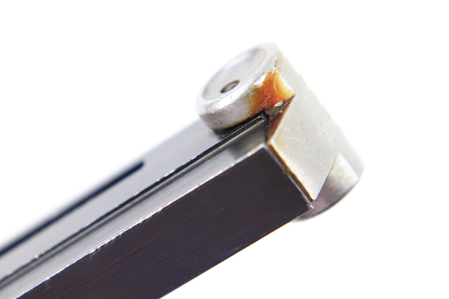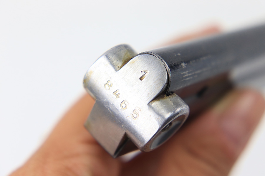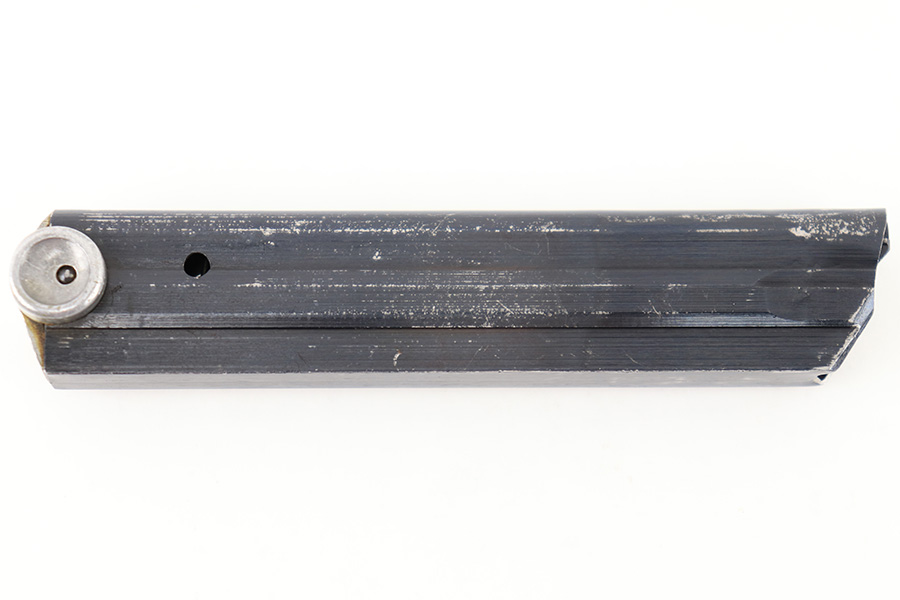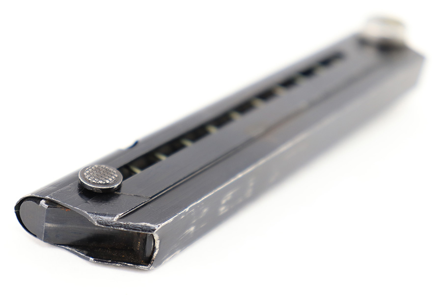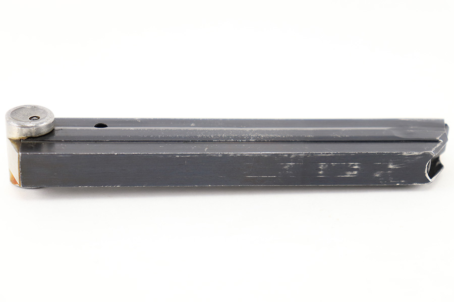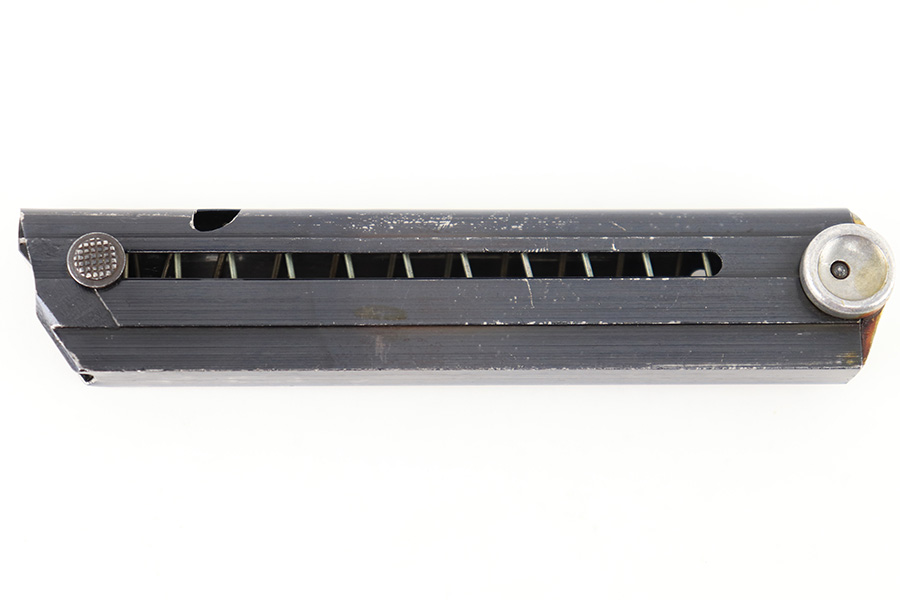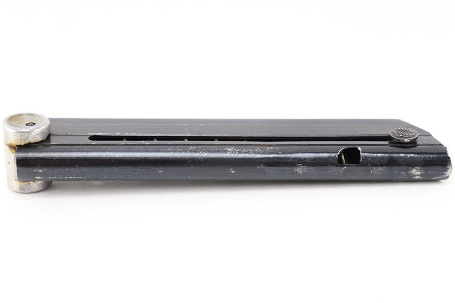 8/14/23 – This is a WW2 production Police Numbered Luger magazine. The magazine has a blued tube with no markings or stamps, and an aluminum base. The base is serial numbered with a “1” above the serial, which is a police style of numbering. The tube has some mild finish loss but no major issues. The spring is strong and functional.