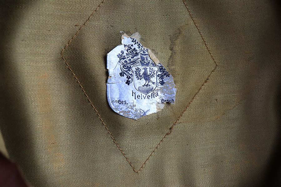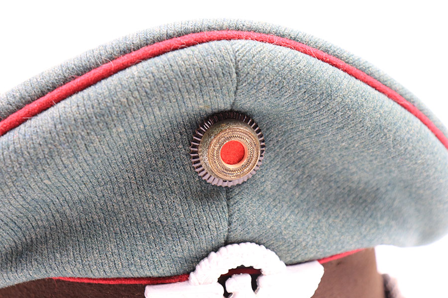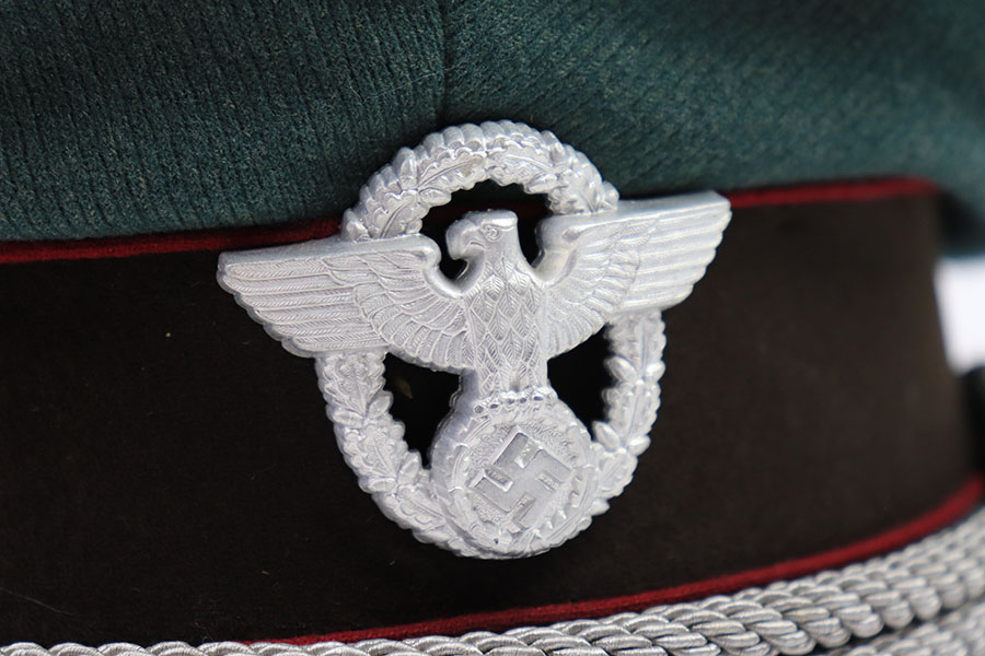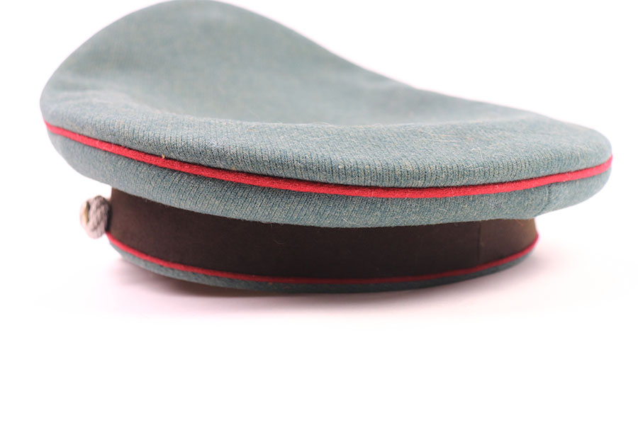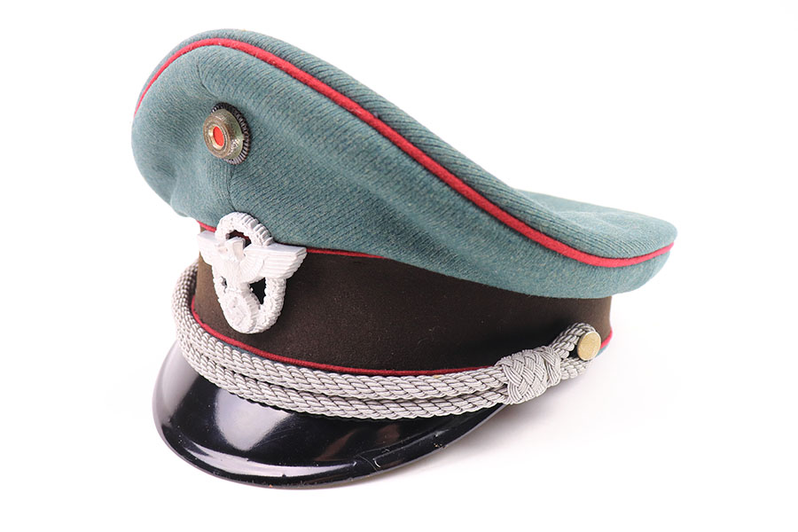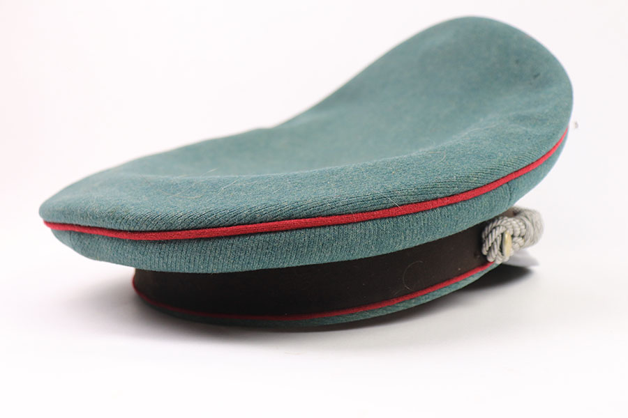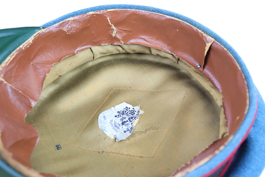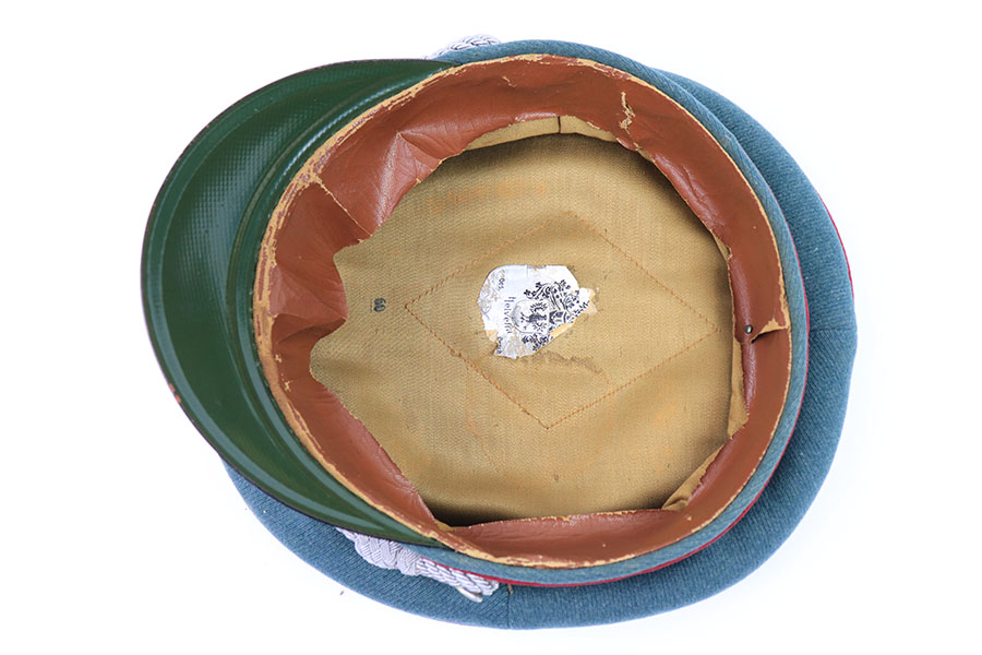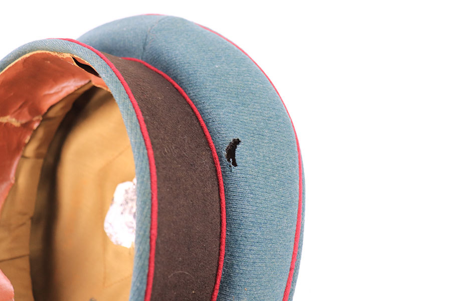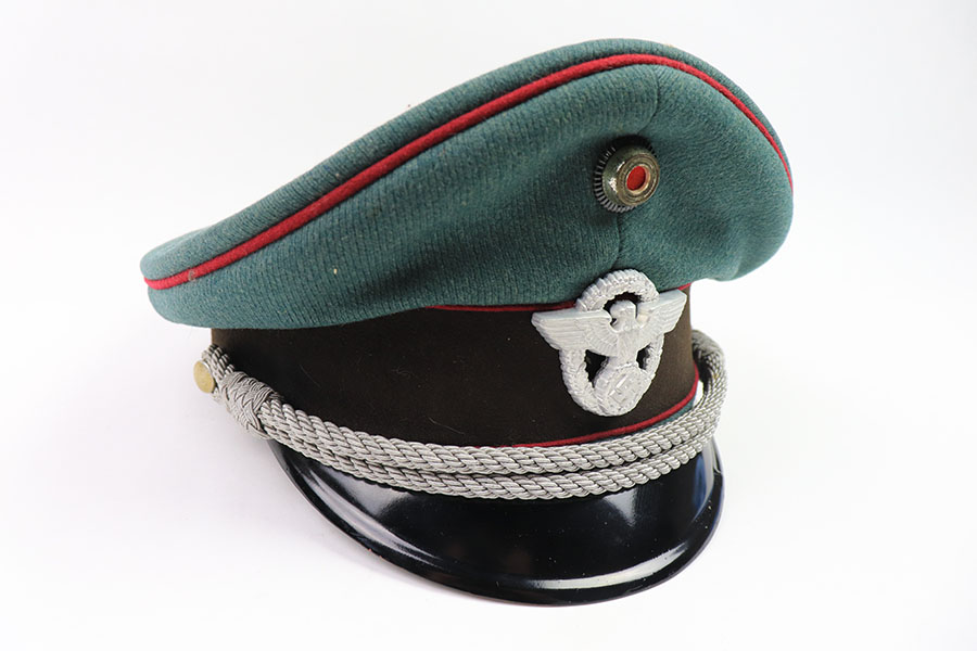 7/19/21 – This is an excellent condition Nazi Police Officer’s Visor Cap. The cap has green wool with maroon red piping. The eagle emblem on the front of the visor is excellent and clean. Some mild patina on the front pip. The chin strap is excellent and clean. The wool has one notable moth hole, as shown in photos. The interior has some mild signs of aging and light surface cracking on the leather brim. Overall an excellent example.