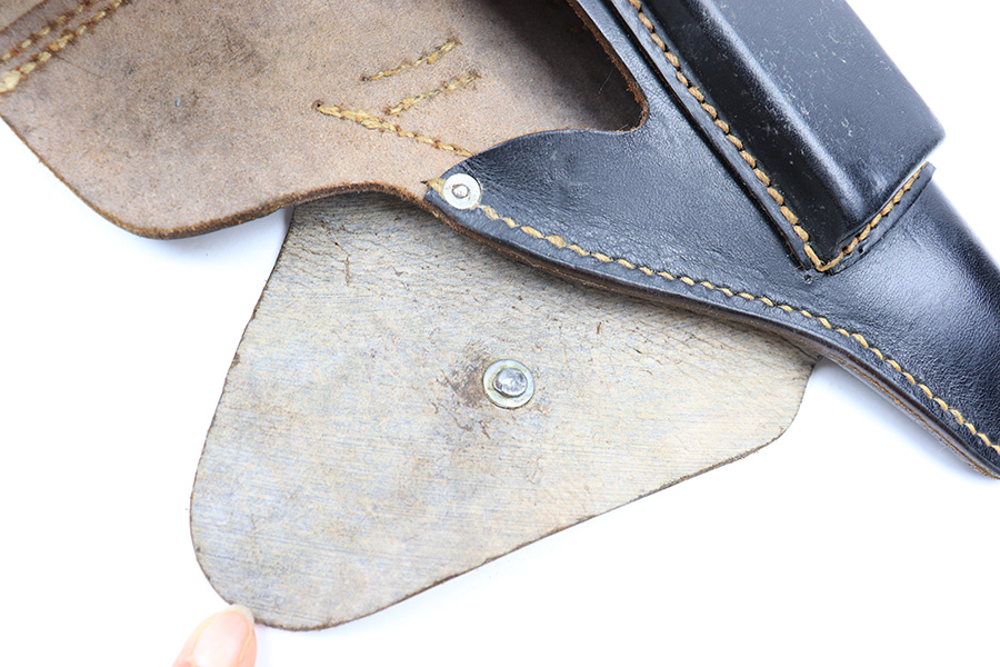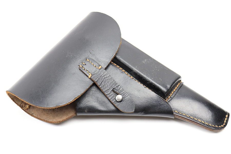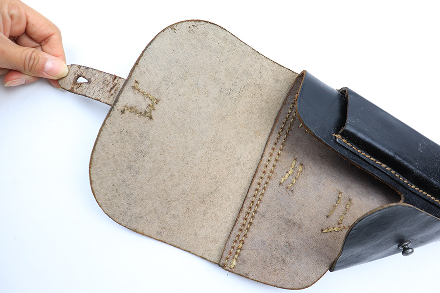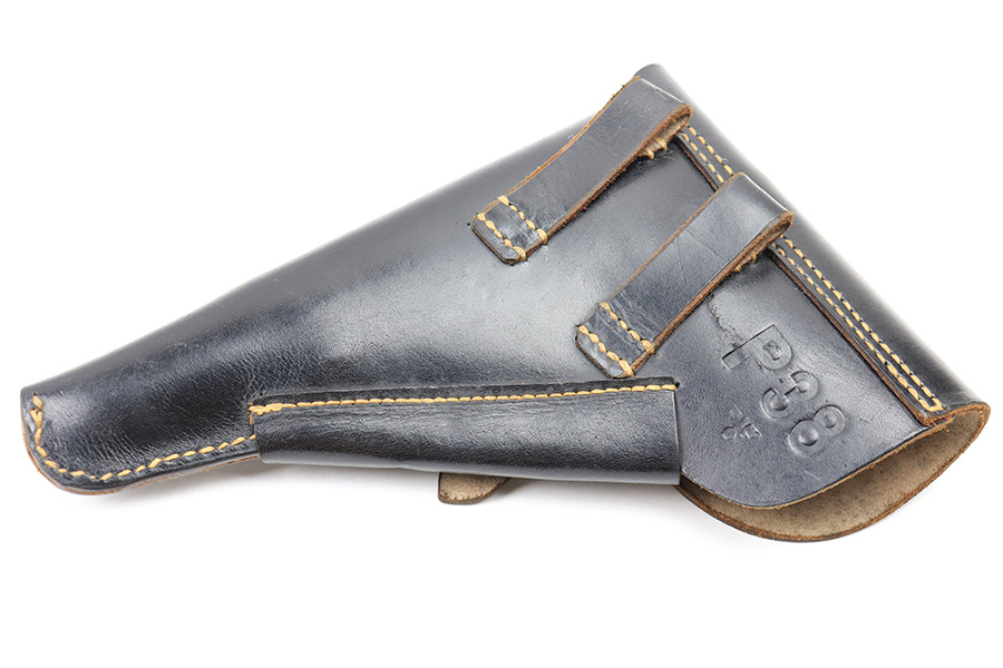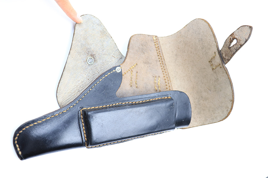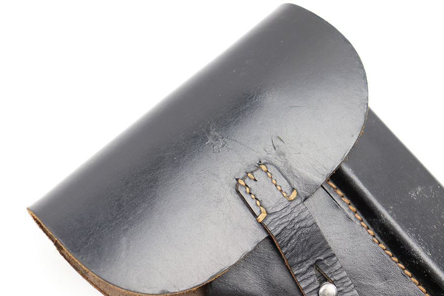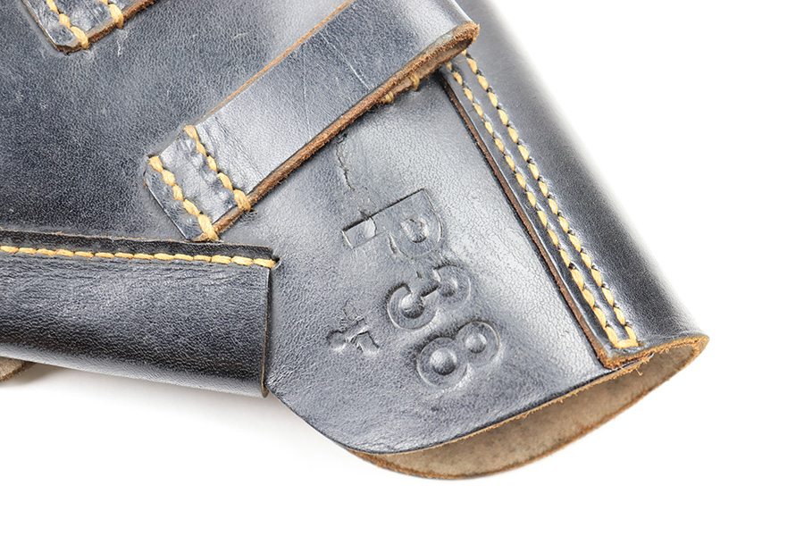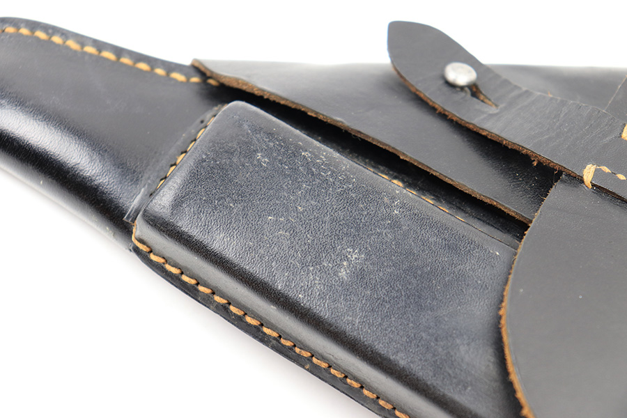 6/23/22 – This is an original WW2 production Police P.38 holster. The holster is the later wartime soft shell style with a P.38 stamp and police eagle proof stamp on the back leather. There is no maker stamp or date stamp from what we can tell. The leather is clean with normal pliability and no notable issues. Excellent stitching throughout.