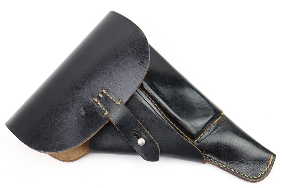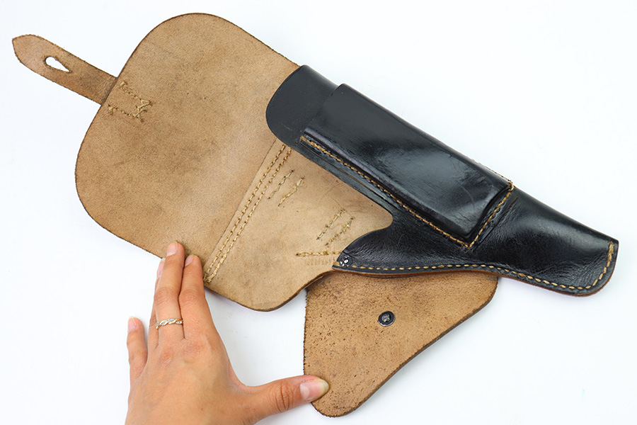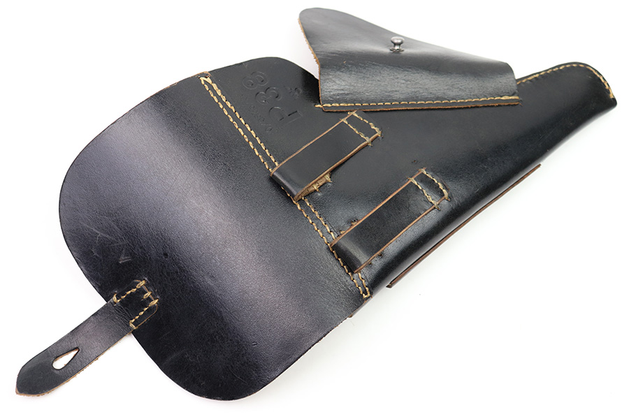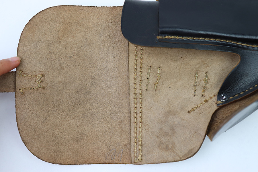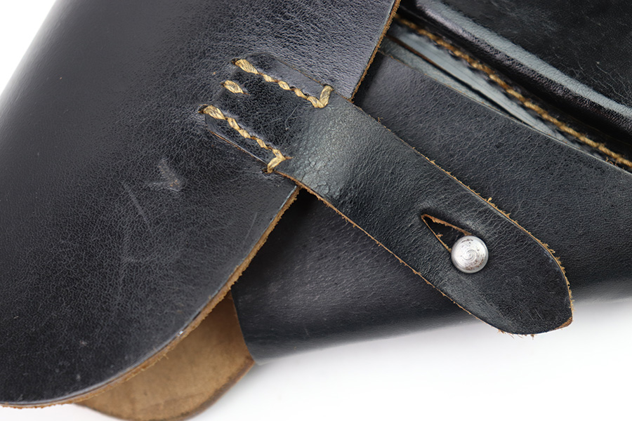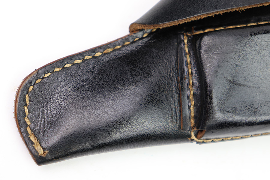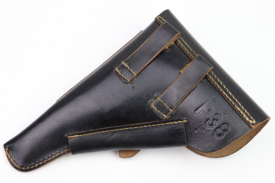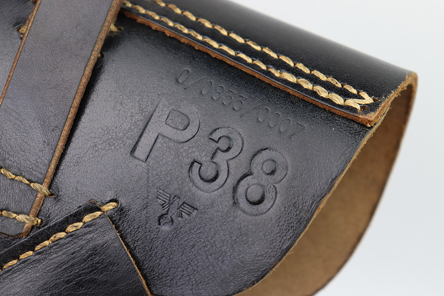 8/30/22 – This is an original Police issued P.38 holster from WW2. The back leather is P.38 stamped with a string over numbers which is a depot number from our understanding. There’s also a police eagle proof stamp under the P.38 stamp on the back leather. The leather is excellent with minimal wear. Excellent stitching and leather throughout, and minimal signs of previous use.