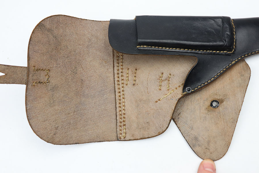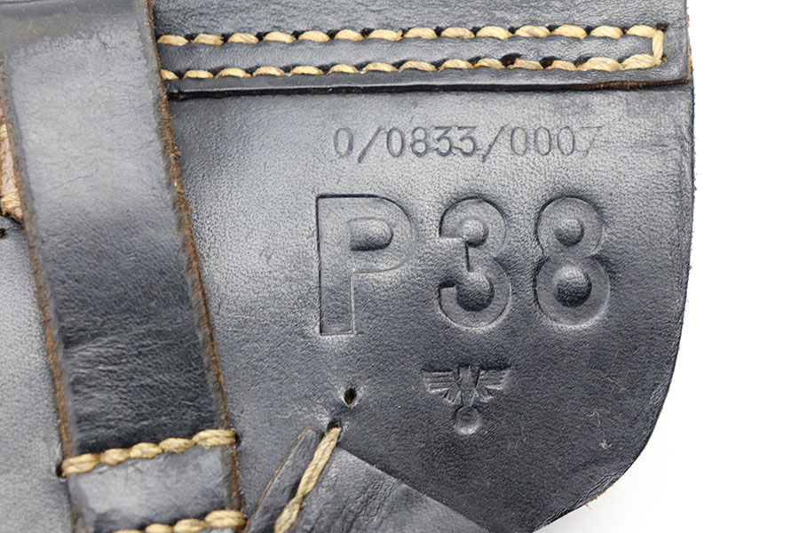 2/20/21 – This is an excellent softshell style Police P.38 holster. Likely unissued as the leather is very clean and can stay opened on its’ own. Stitching is all original and in tact. Crisply stamped on the backside with a unit number, P.38, and police eagle stamp.