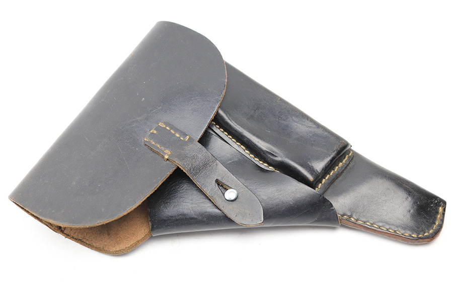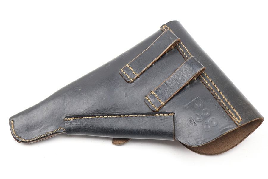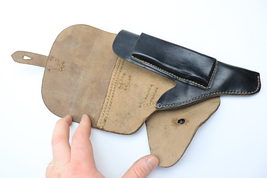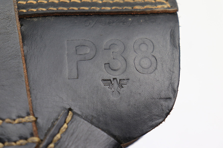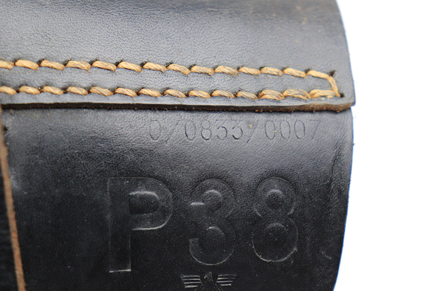 5/24/22 – This is a later wartime production soft shell style Police issued P.38 holster. The holster is stamped with identification numbers above a P.38 stamp and police eagle proof stamp on the back leather. The leather is clean throughout with mild pliability and no major issues. Nice, tight stitching throughout as well and clean interior leather.