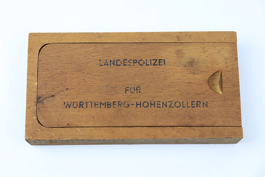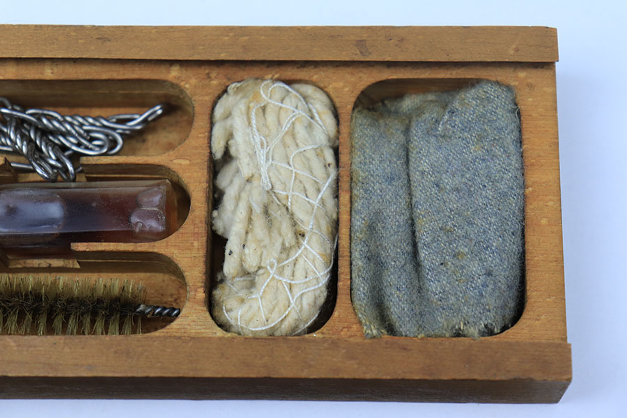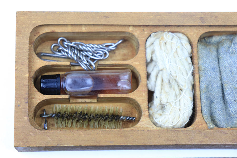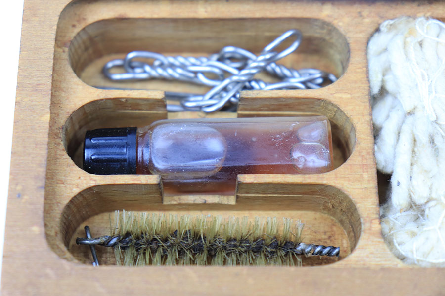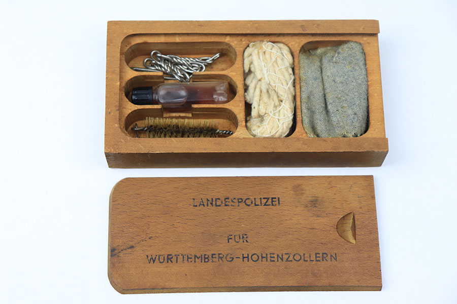 6/2/21 – This is a fairly scarce WW2 era Landespolizei cleaning kit. Landespolizei translates to “State Police”, and these cleaning kits have been identified as W. German for the PP and PPK pistols carried by the police. The cleaning kit has a wood case and is in great overall condition. Complete with oiler, chain, brush, and cloths.