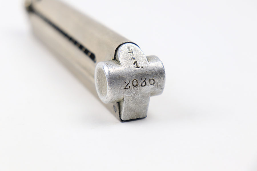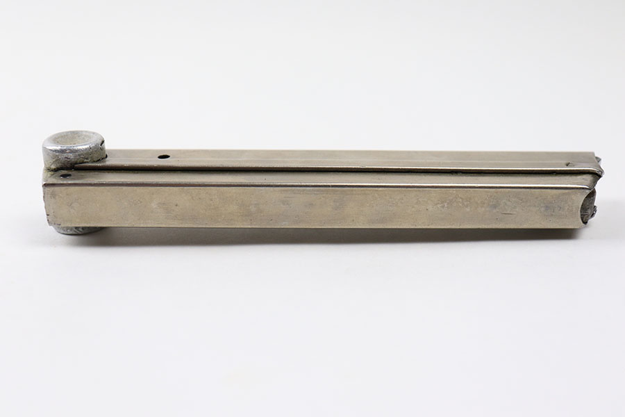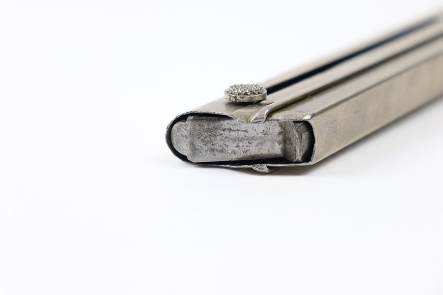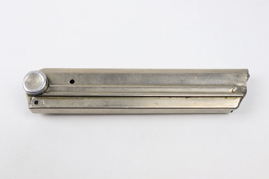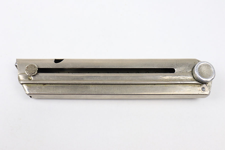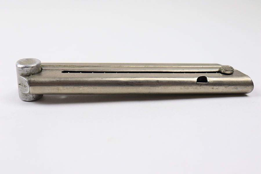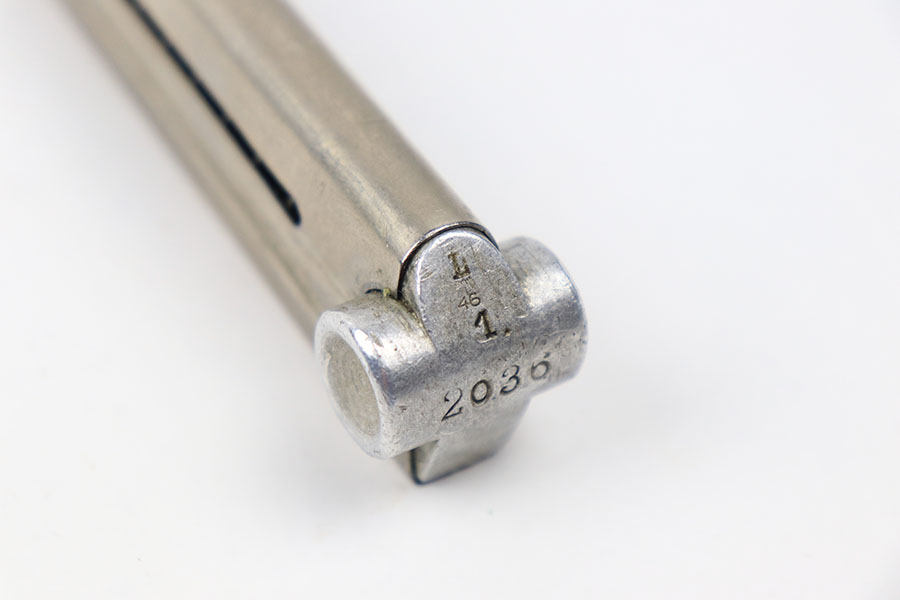 7/14/21 – This is an original Simson luger magazine that was later diverted for police use during WW2. The magazine has a nickel tube and aluminum base. The base is Simson eagle/46 stamped and serial numbered with a police numeral 1 above the number. There’s also what appears to be a “L”, but we think this is a roman numeral 2.