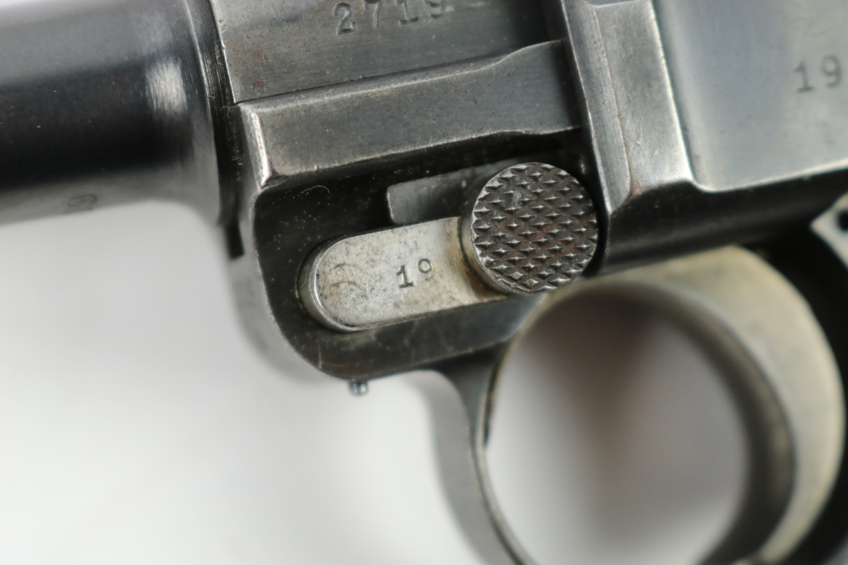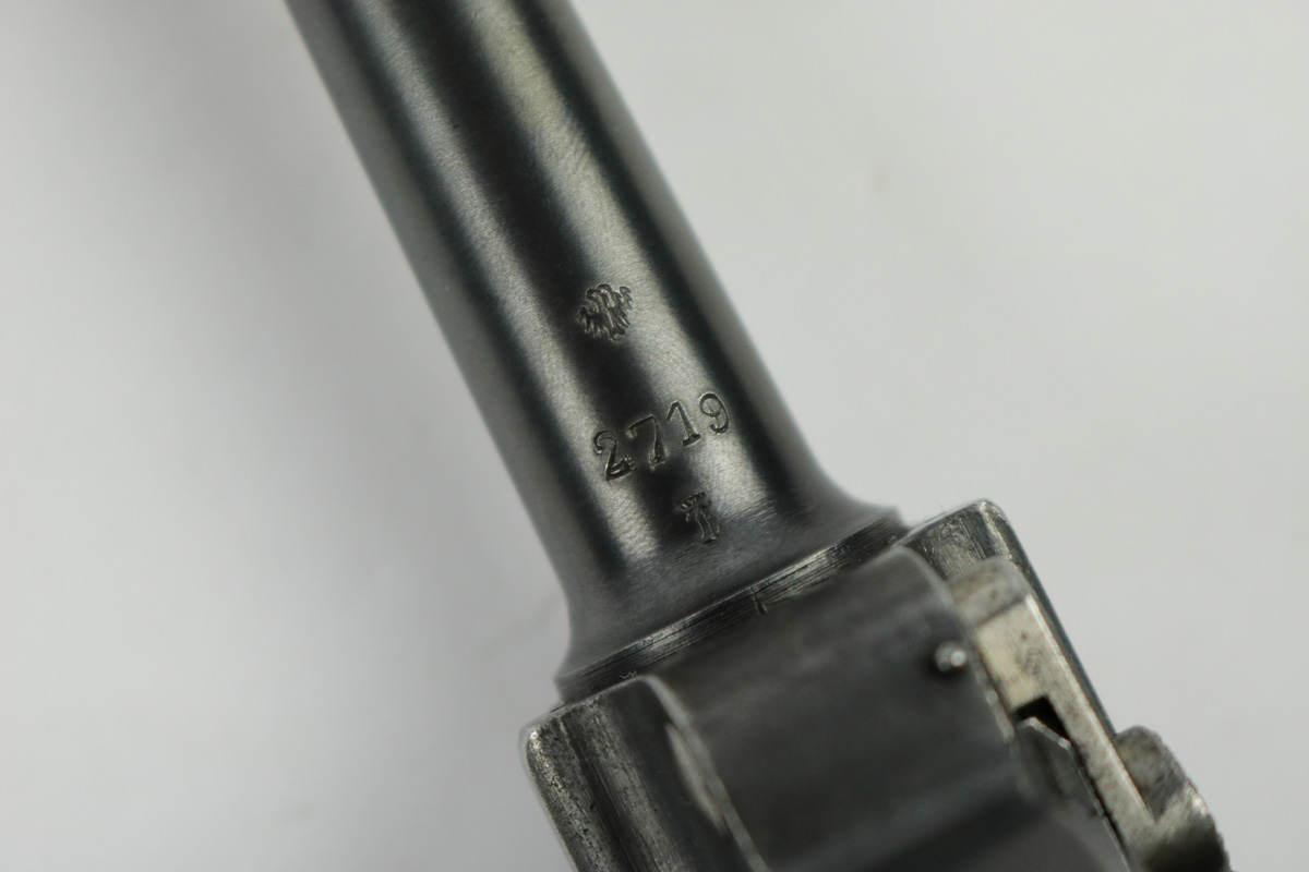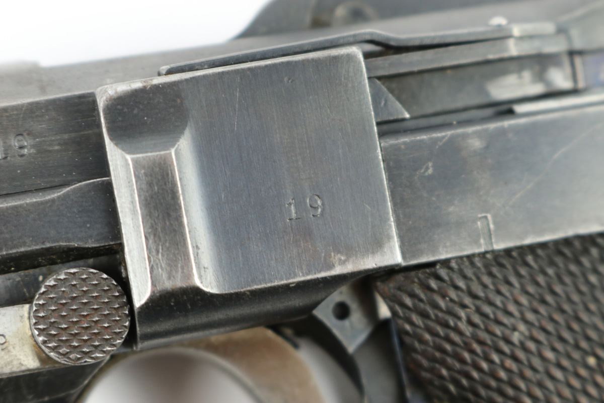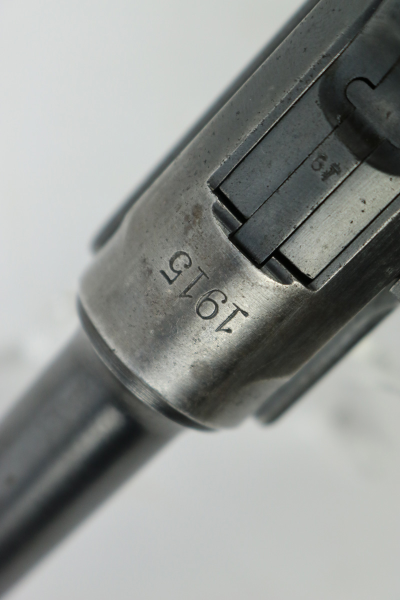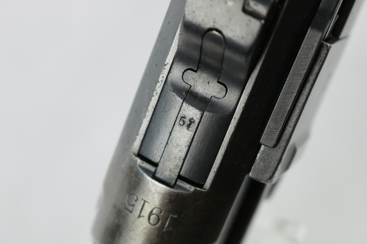 9/14/18 – This is an original 1915 dated DWM Luger that was later reworked for police use during WW2. The police added the sear safety, and a matching numbered magazine that is still with the gun today. The magazine is wood based and there’s a crack on the lower portion – as shown in photos. The magazine appears to be the spare, police numbered magazine. The wood grips are also matching, numbered “19” in small font on each panel. The left panel has a few minor chips near the side plate and safety lever. The pistol has patina throughout, all honest wear. The overall finish is in about 80-85%. There’s light pitting on the barrel, thinning & pin pricking on the frame, as well as typical browning and finish loss on the straps. The pistol is all matching except for the hold-open internal part. This was probably a police / field replacement as it looks period correct and is properly numbered. The bore is very nice with great rifling and minimal wear, overall an 8.5 out of 10 on the bore. Guaranteed original and fully functional.