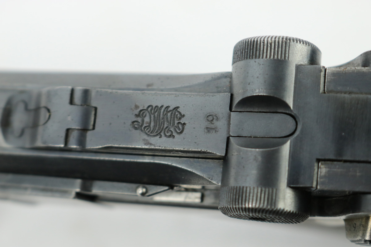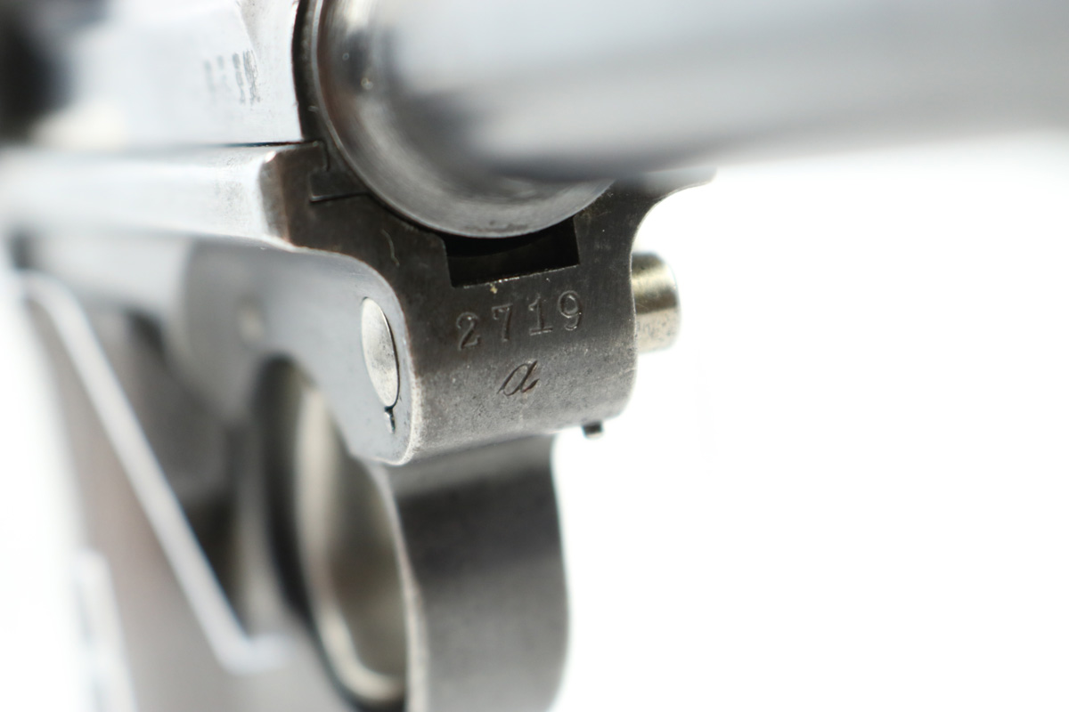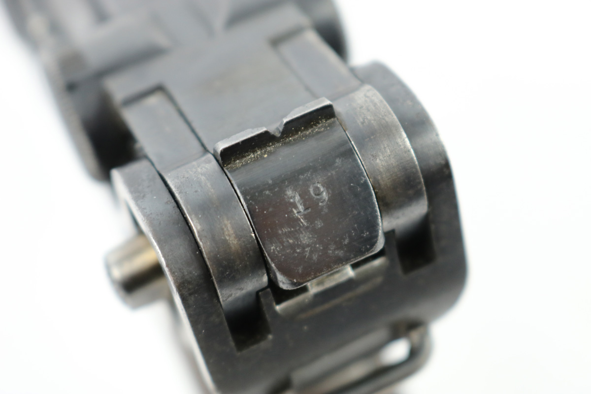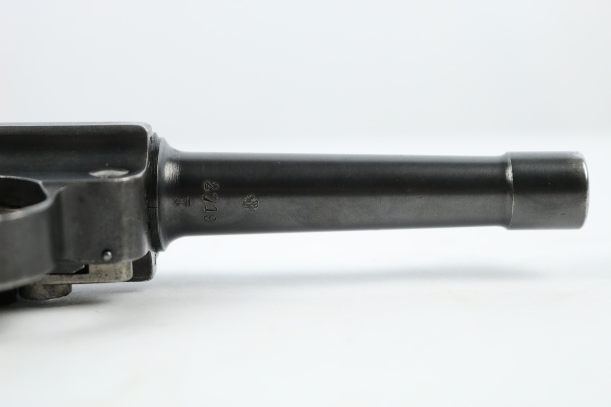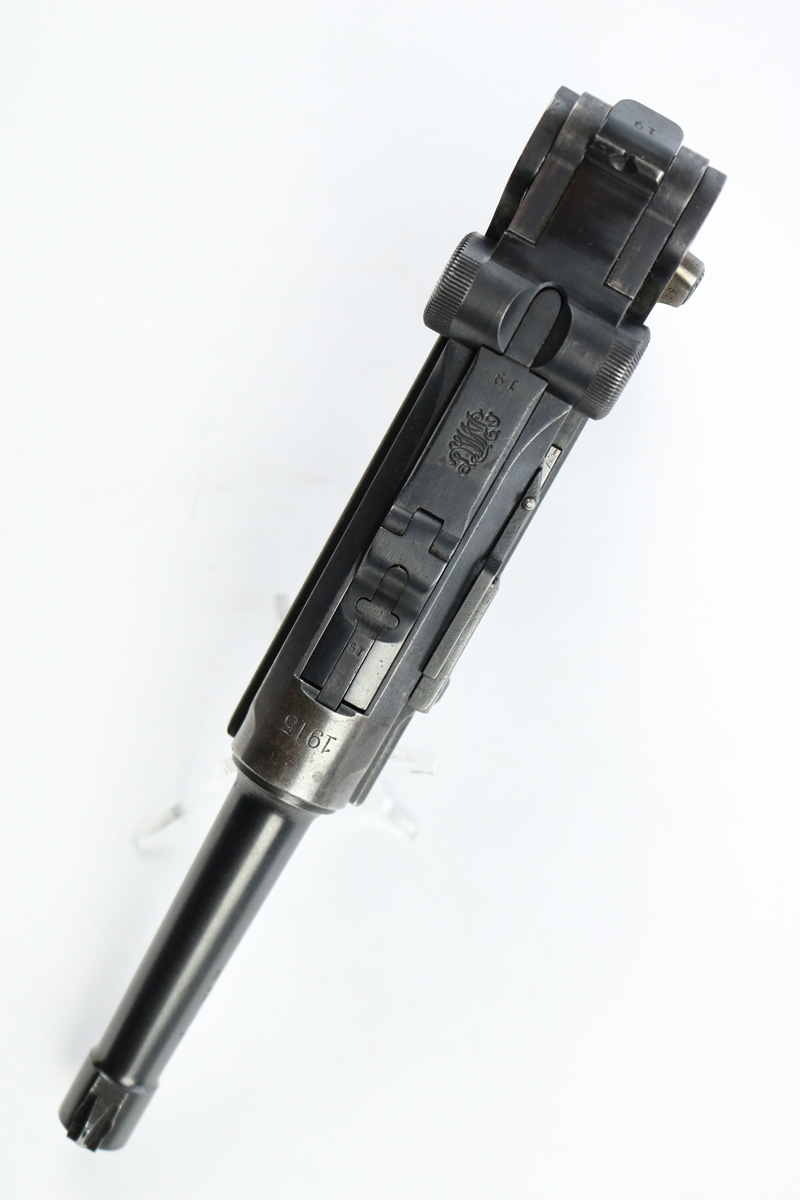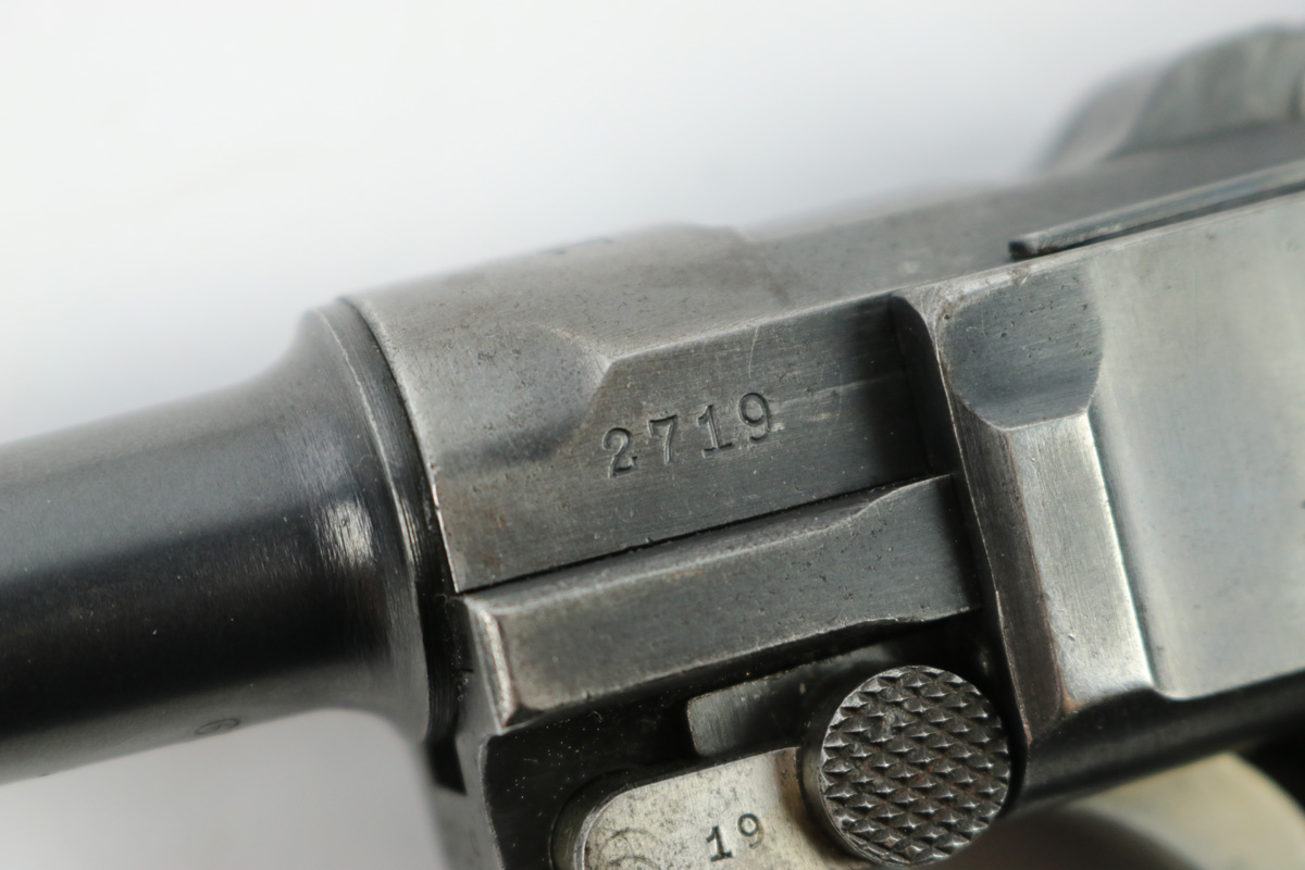 9/14/18 – This is an original 1915 dated DWM Luger that was later reworked for police use during WW2. The police added the sear safety, and a matching numbered magazine that is still with the gun today. The magazine is wood based and there’s a crack on the lower portion – as shown in photos. The magazine appears to be the spare, police numbered magazine. The wood grips are also matching, numbered “19” in small font on each panel. The left panel has a few minor chips near the side plate and safety lever. The pistol has patina throughout, all honest wear. The overall finish is in about 80-85%. There’s light pitting on the barrel, thinning & pin pricking on the frame, as well as typical browning and finish loss on the straps. The pistol is all matching except for the hold-open internal part. This was probably a police / field replacement as it looks period correct and is properly numbered. The bore is very nice with great rifling and minimal wear, overall an 8.5 out of 10 on the bore. Guaranteed original and fully functional.
