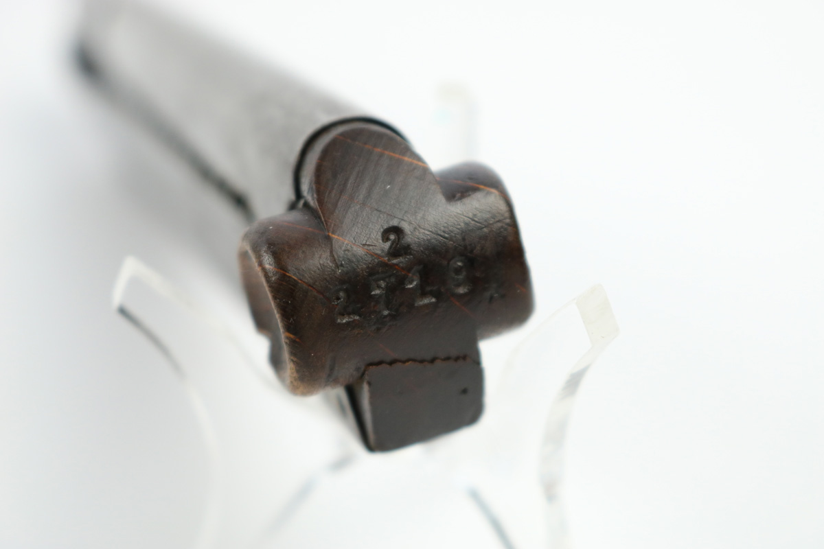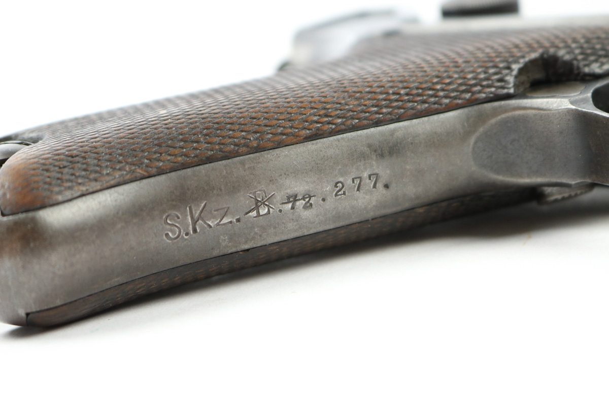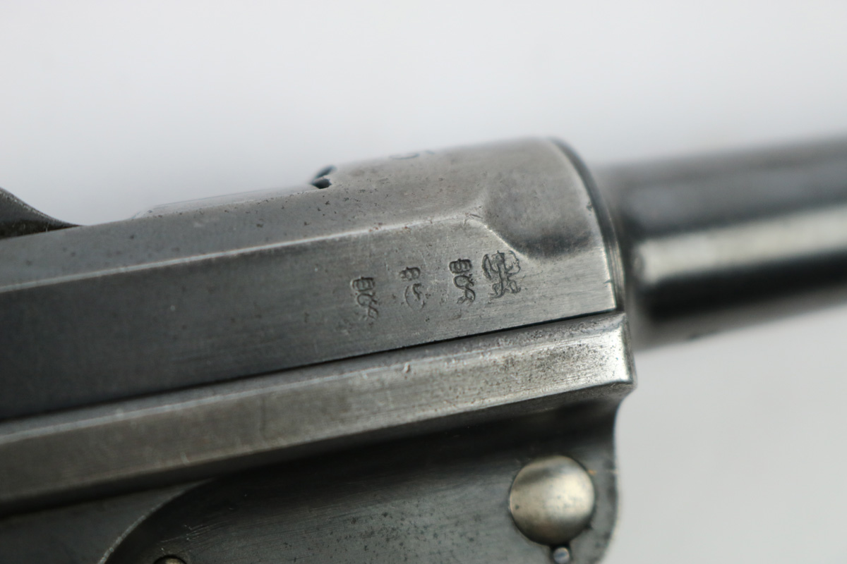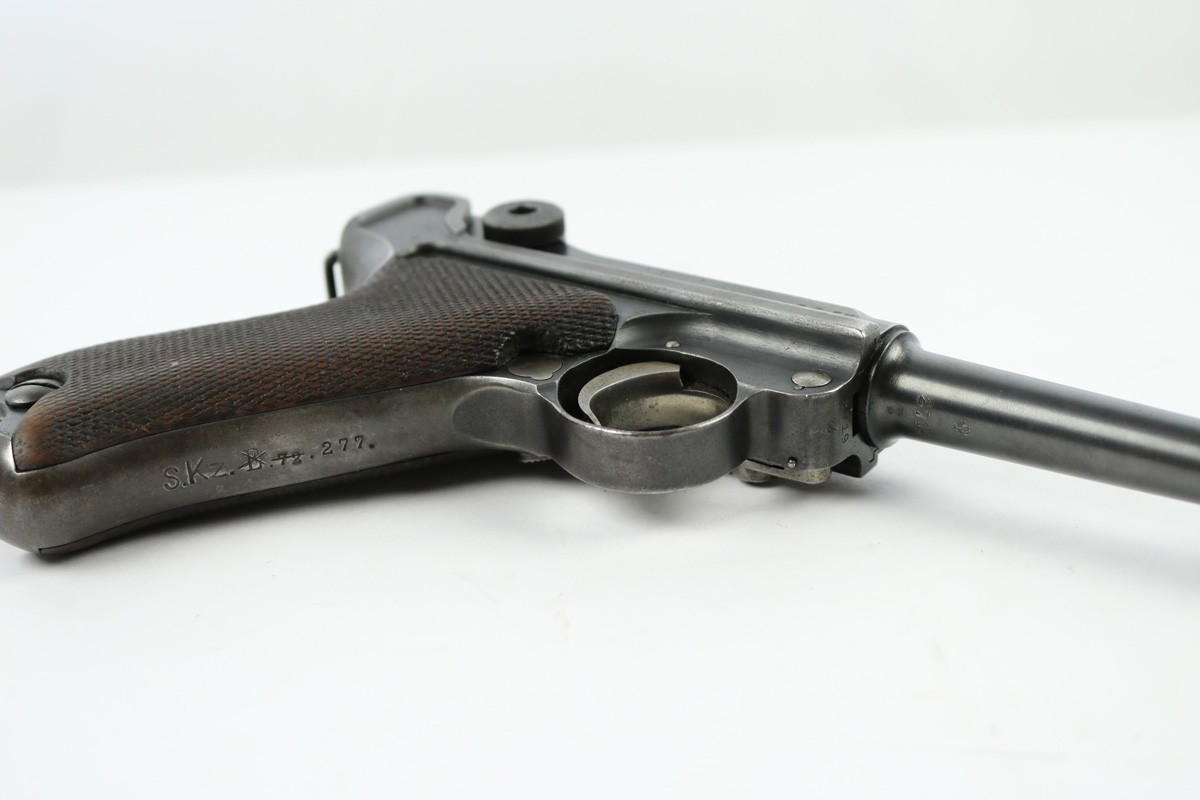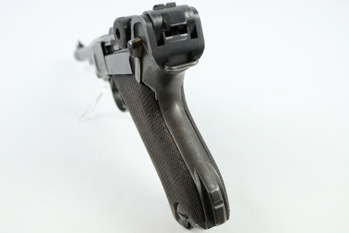 9/14/18 – This is an original 1915 dated DWM Luger that was later reworked for police use during WW2. The police added the sear safety, and a matching numbered magazine that is still with the gun today. The magazine is wood based and there’s a crack on the lower portion – as shown in photos. The magazine appears to be the spare, police numbered magazine. The wood grips are also matching, numbered “19” in small font on each panel. The left panel has a few minor chips near the side plate and safety lever. The pistol has patina throughout, all honest wear. The overall finish is in about 80-85%. There’s light pitting on the barrel, thinning & pin pricking on the frame, as well as typical browning and finish loss on the straps. The pistol is all matching except for the hold-open internal part. This was probably a police / field replacement as it looks period correct and is properly numbered. The bore is very nice with great rifling and minimal wear, overall an 8.5 out of 10 on the bore. Guaranteed original and fully functional.