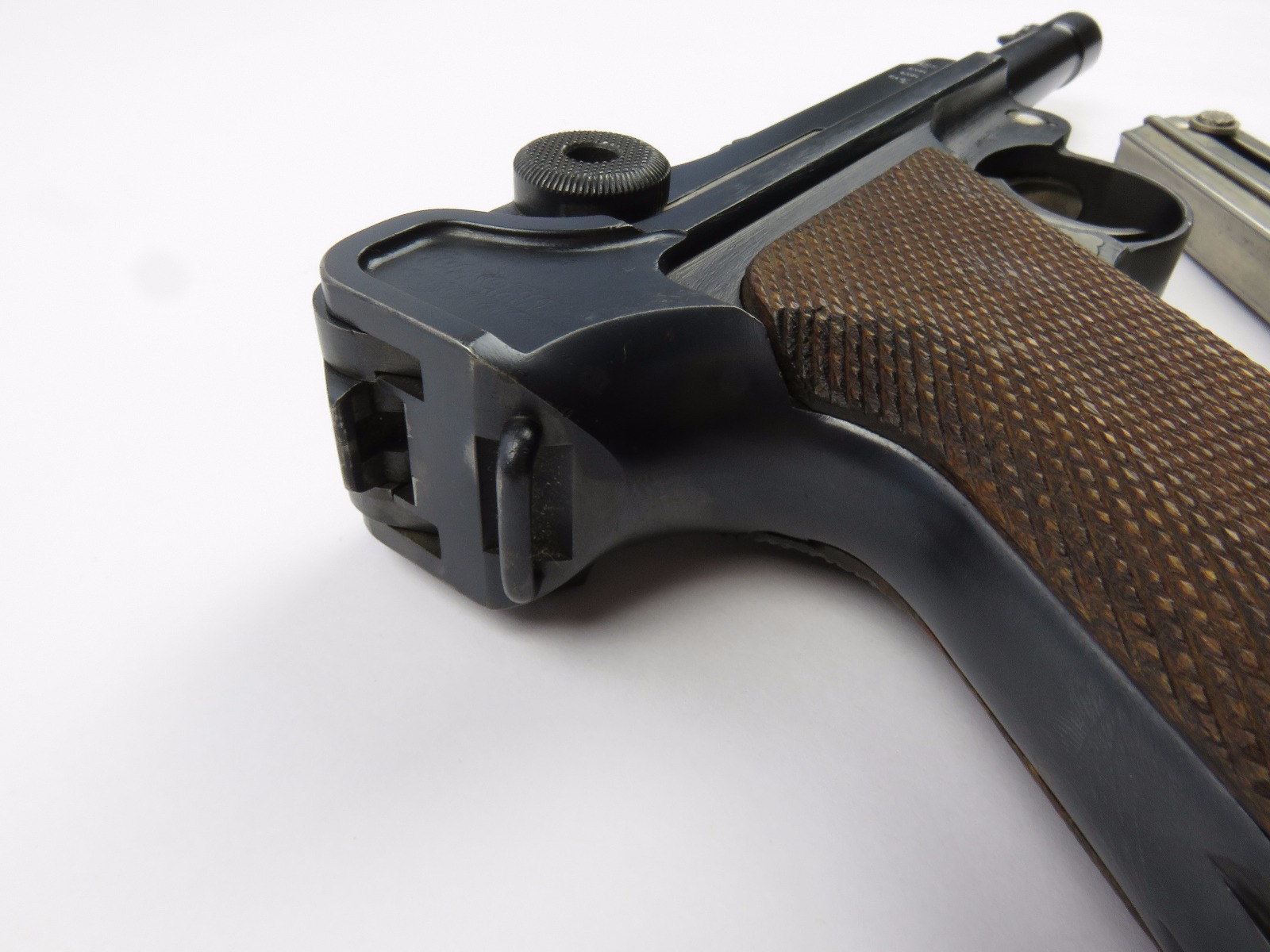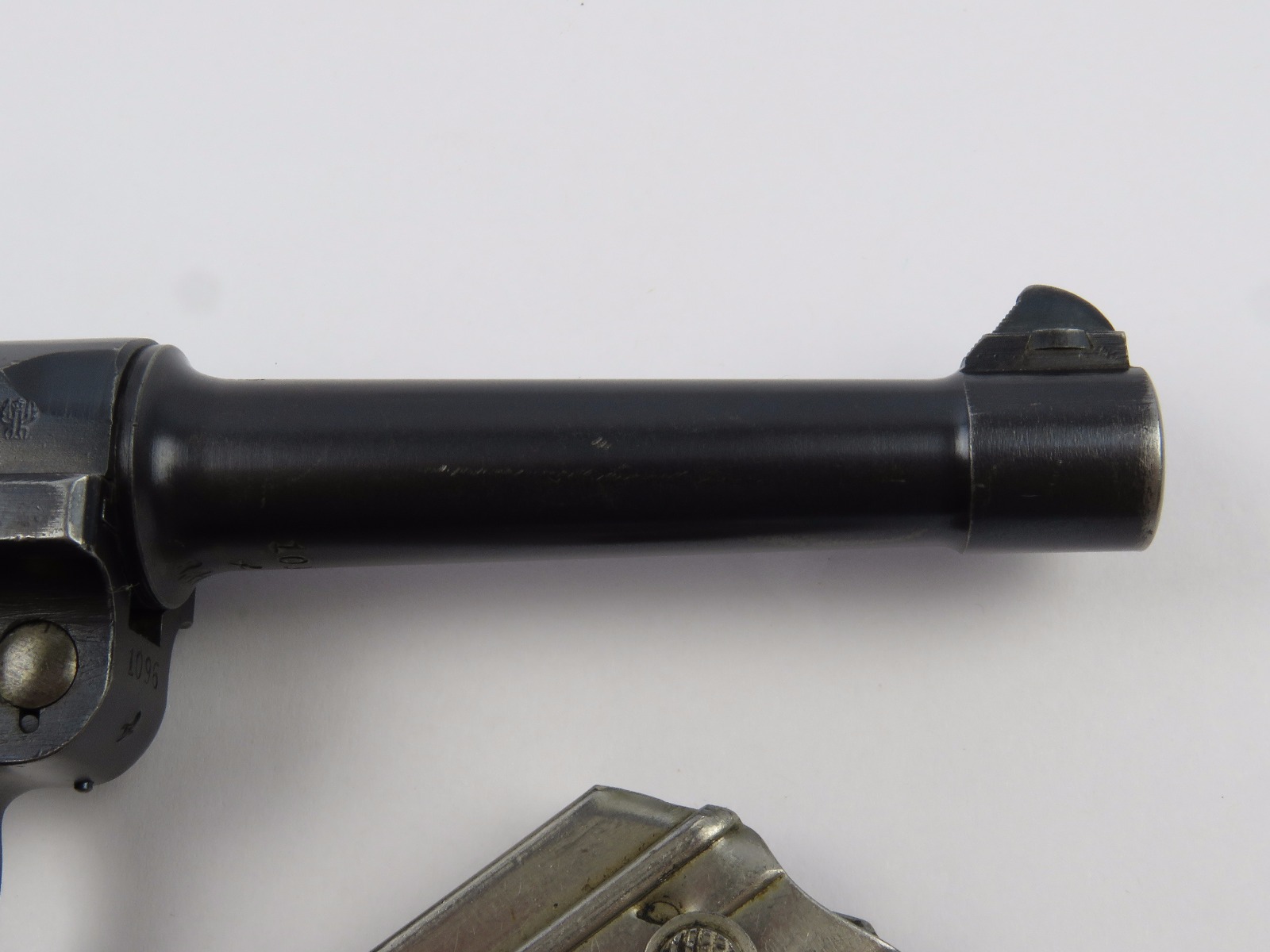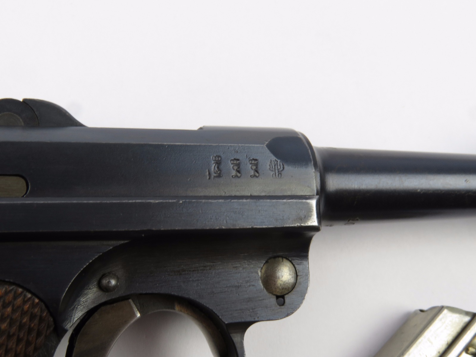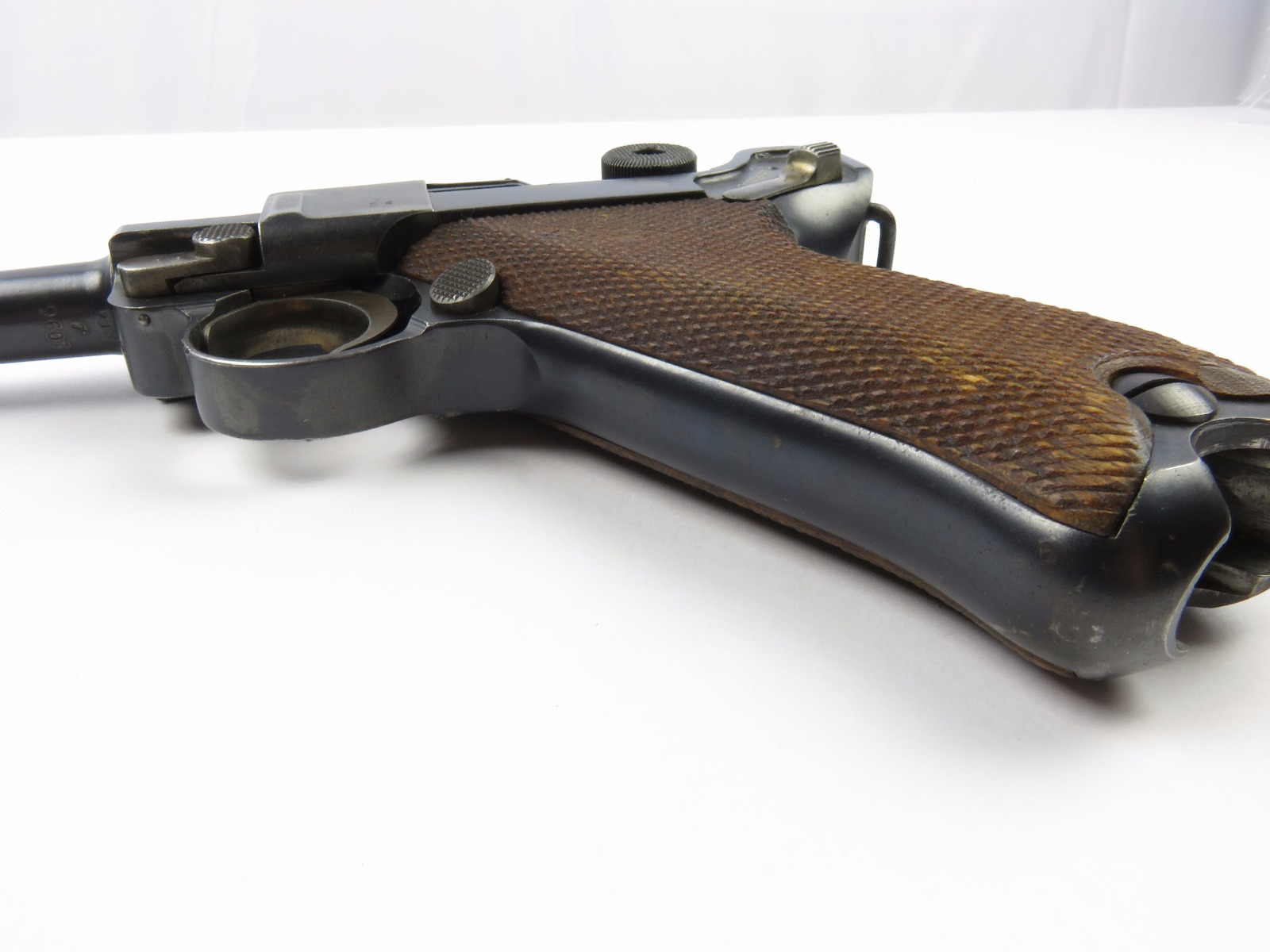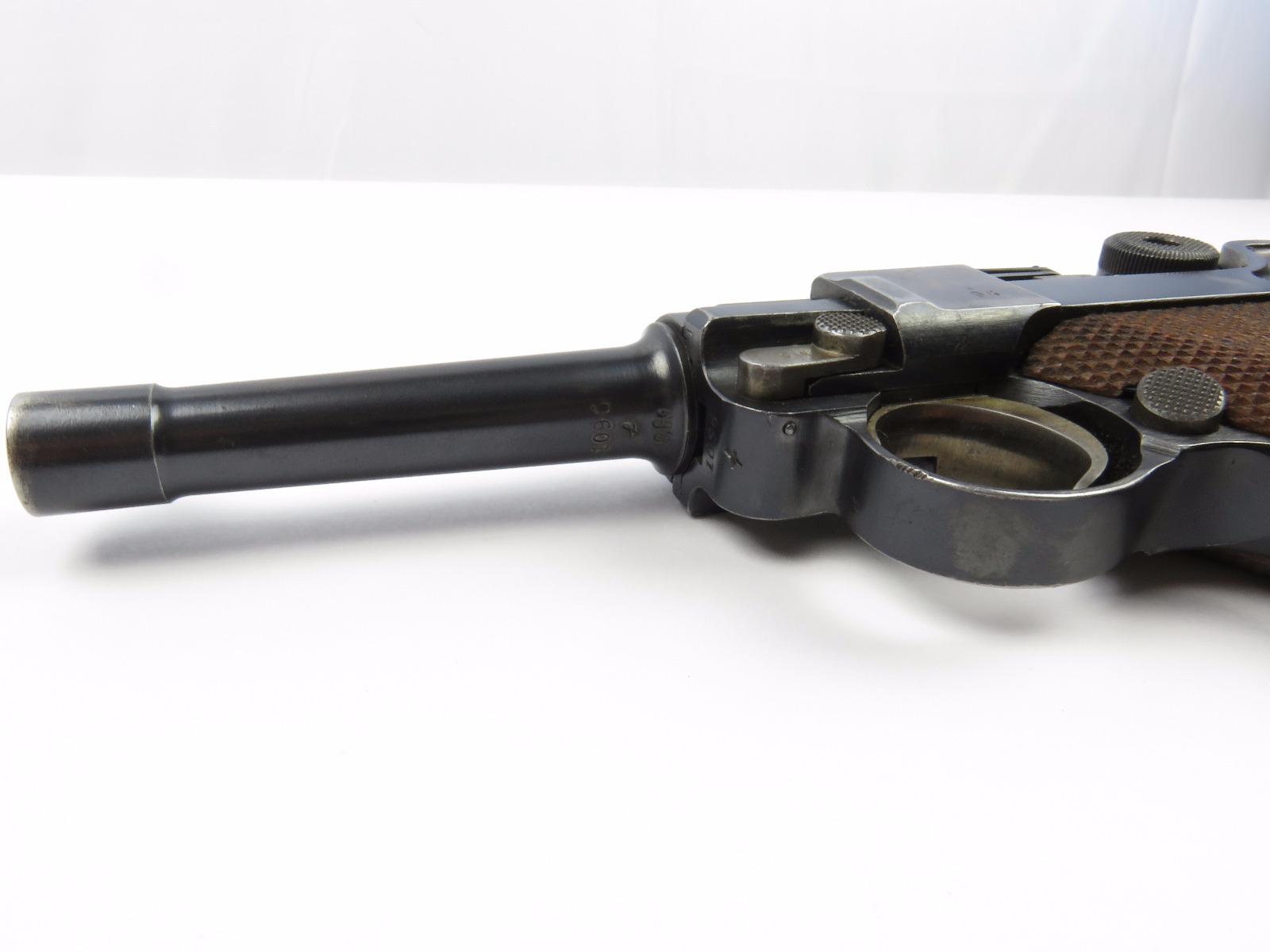 10/17/17 – This is a very nice late WW1 production Luger, that was soon thereafter repurposed for police use. The pistol is in excellent condition considering its’ age. Clearly an all original finish with some nice “honest” wear. The overall condition is about 92-93%. The majority of the wear is on the sideplate and muzzle. However there is also some thinning on the bore exterior bluing, and edge wear throughout. The straw parts have some normal wear/finish loss throughout as well. The straps (grip area) are in excellent condition. The bore is a 9/10 with almost no wear (very close to a 10/10). Comes with a period correct magazine. A very nice WW1 era police rework that would also serve as a nice shooter as well !