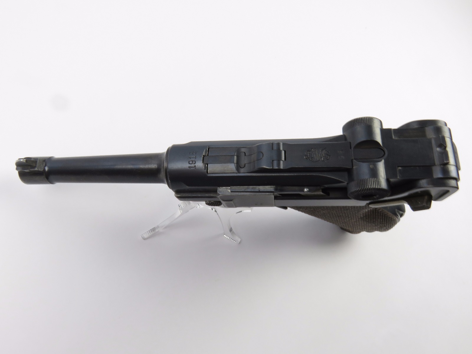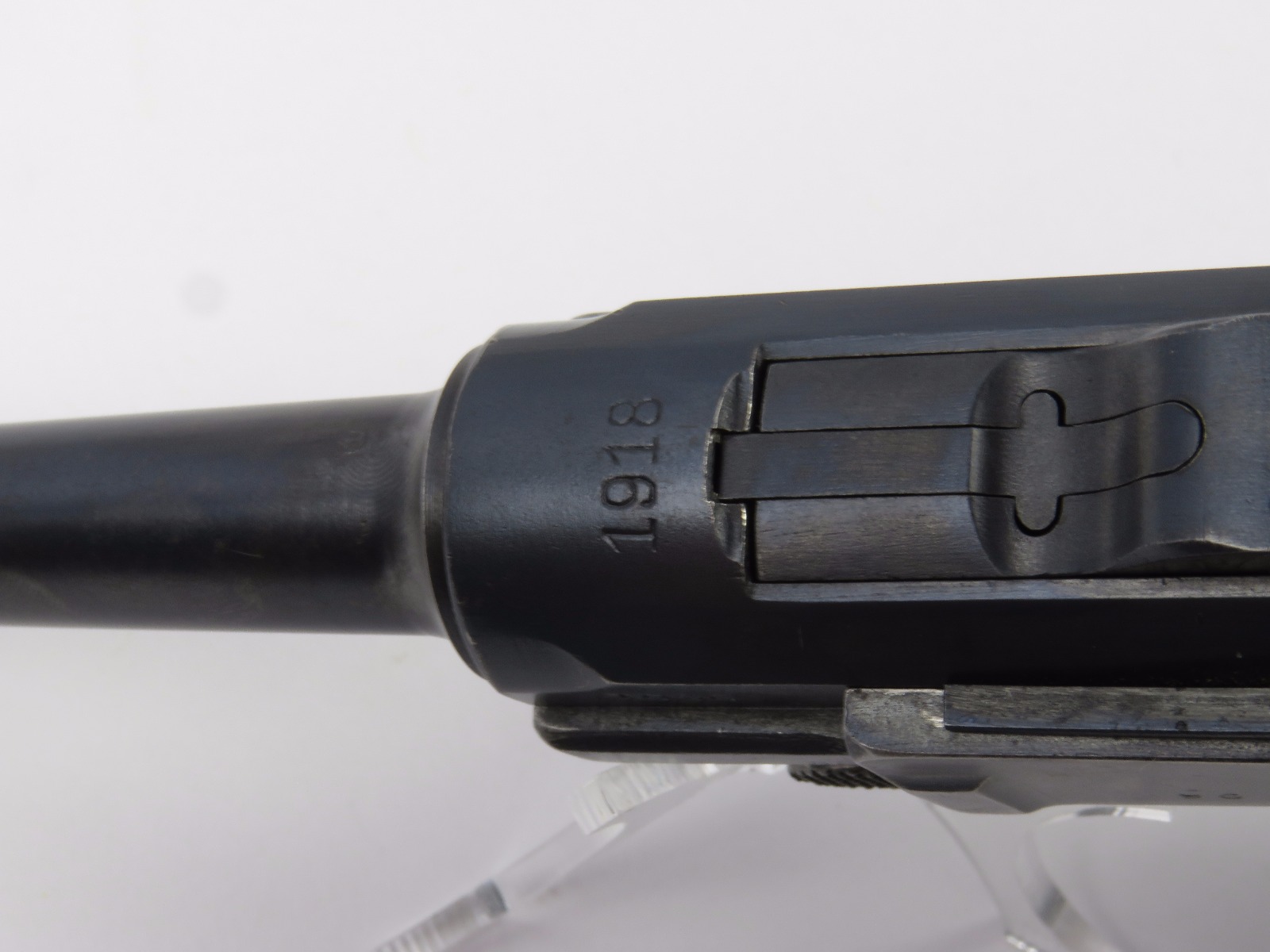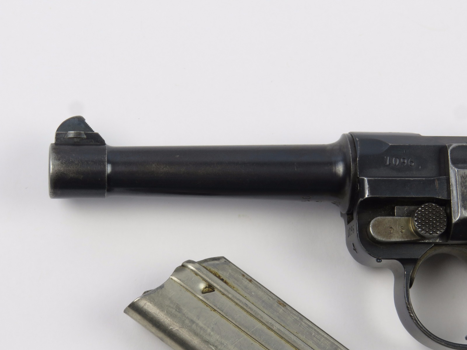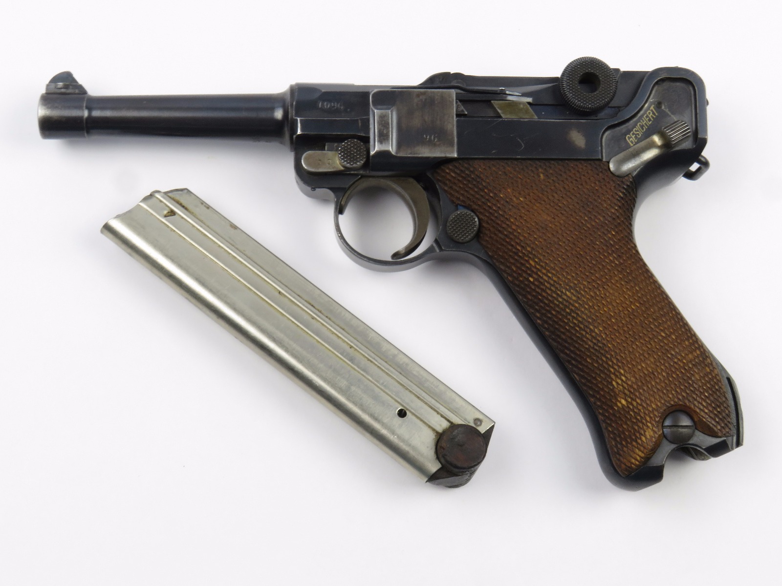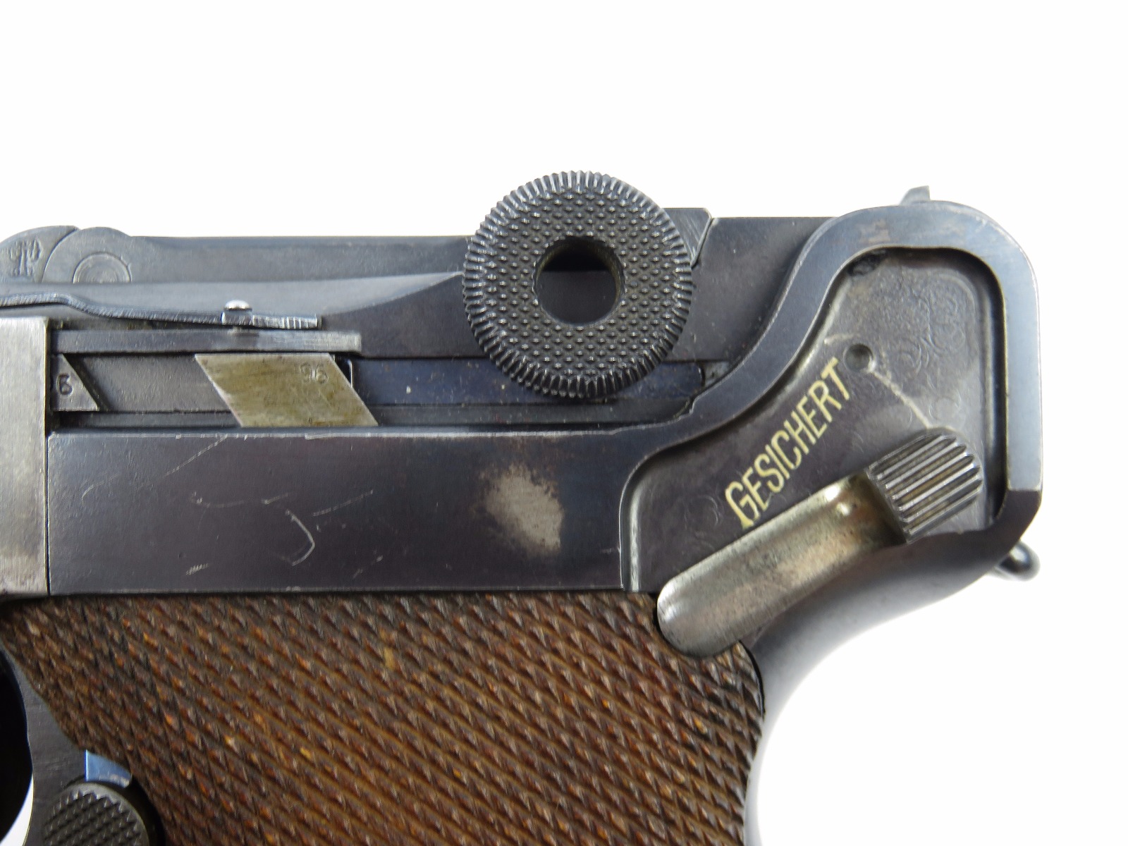 10/17/17 – This is a very nice late WW1 production Luger, that was soon thereafter repurposed for police use. The pistol is in excellent condition considering its’ age. Clearly an all original finish with some nice “honest” wear. The overall condition is about 92-93%. The majority of the wear is on the sideplate and muzzle. However there is also some thinning on the bore exterior bluing, and edge wear throughout. The straw parts have some normal wear/finish loss throughout as well. The straps (grip area) are in excellent condition. The bore is a 9/10 with almost no wear (very close to a 10/10). Comes with a period correct magazine. A very nice WW1 era police rework that would also serve as a nice shooter as well !