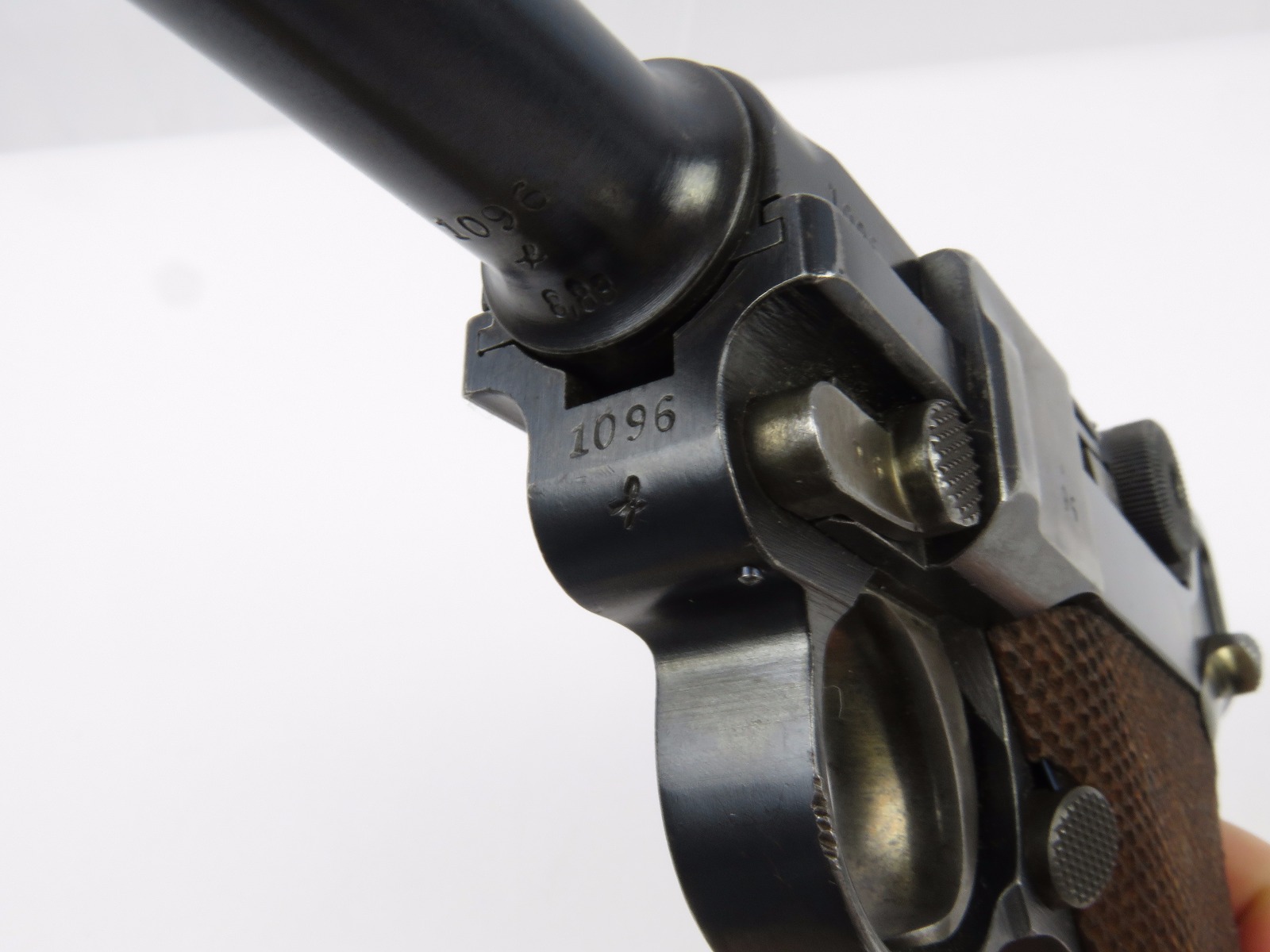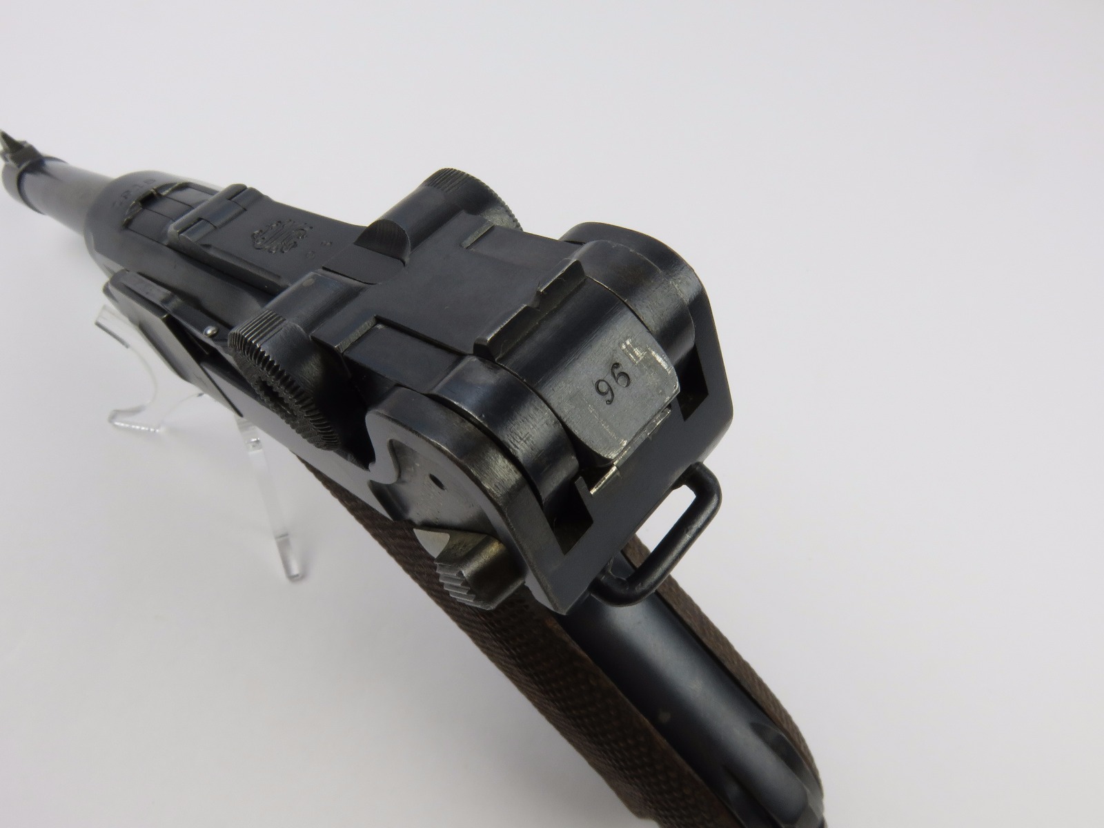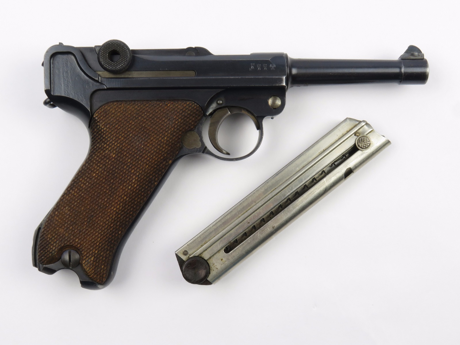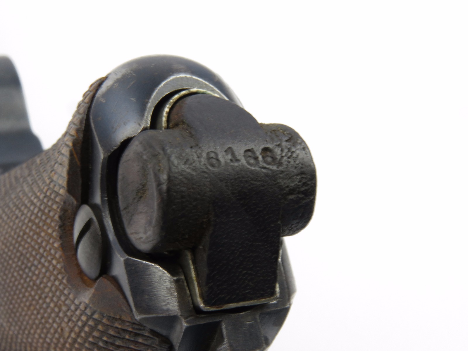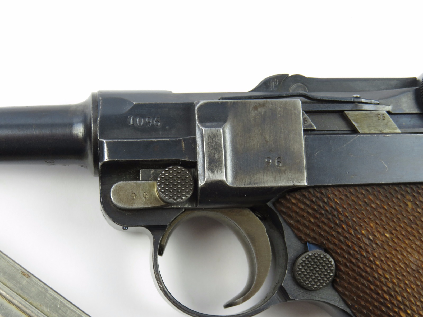 10/17/17 – This is a very nice late WW1 production Luger, that was soon thereafter repurposed for police use. The pistol is in excellent condition considering its’ age. Clearly an all original finish with some nice “honest” wear. The overall condition is about 92-93%. The majority of the wear is on the sideplate and muzzle. However there is also some thinning on the bore exterior bluing, and edge wear throughout. The straw parts have some normal wear/finish loss throughout as well. The straps (grip area) are in excellent condition. The bore is a 9/10 with almost no wear (very close to a 10/10). Comes with a period correct magazine. A very nice WW1 era police rework that would also serve as a nice shooter as well !
