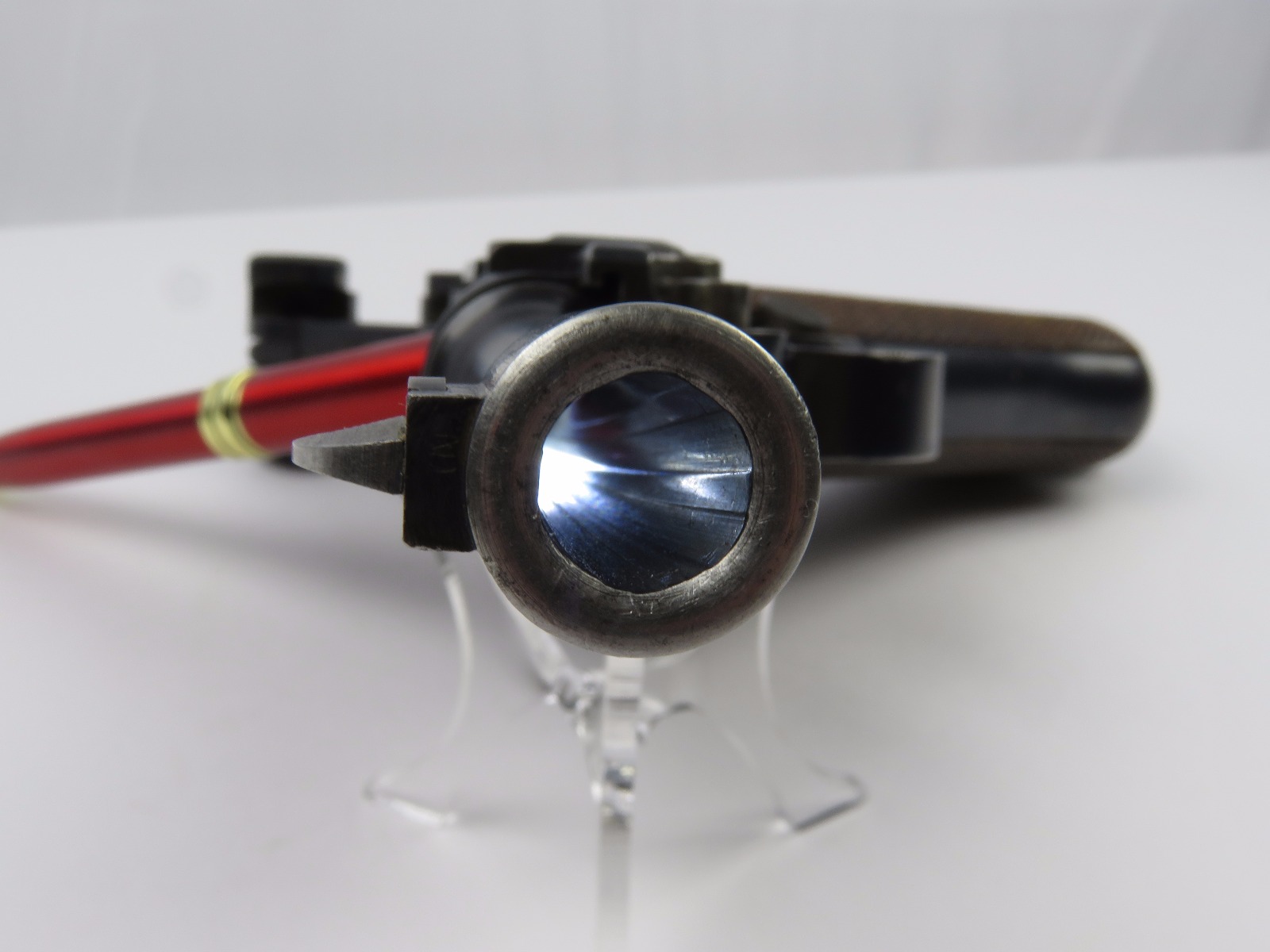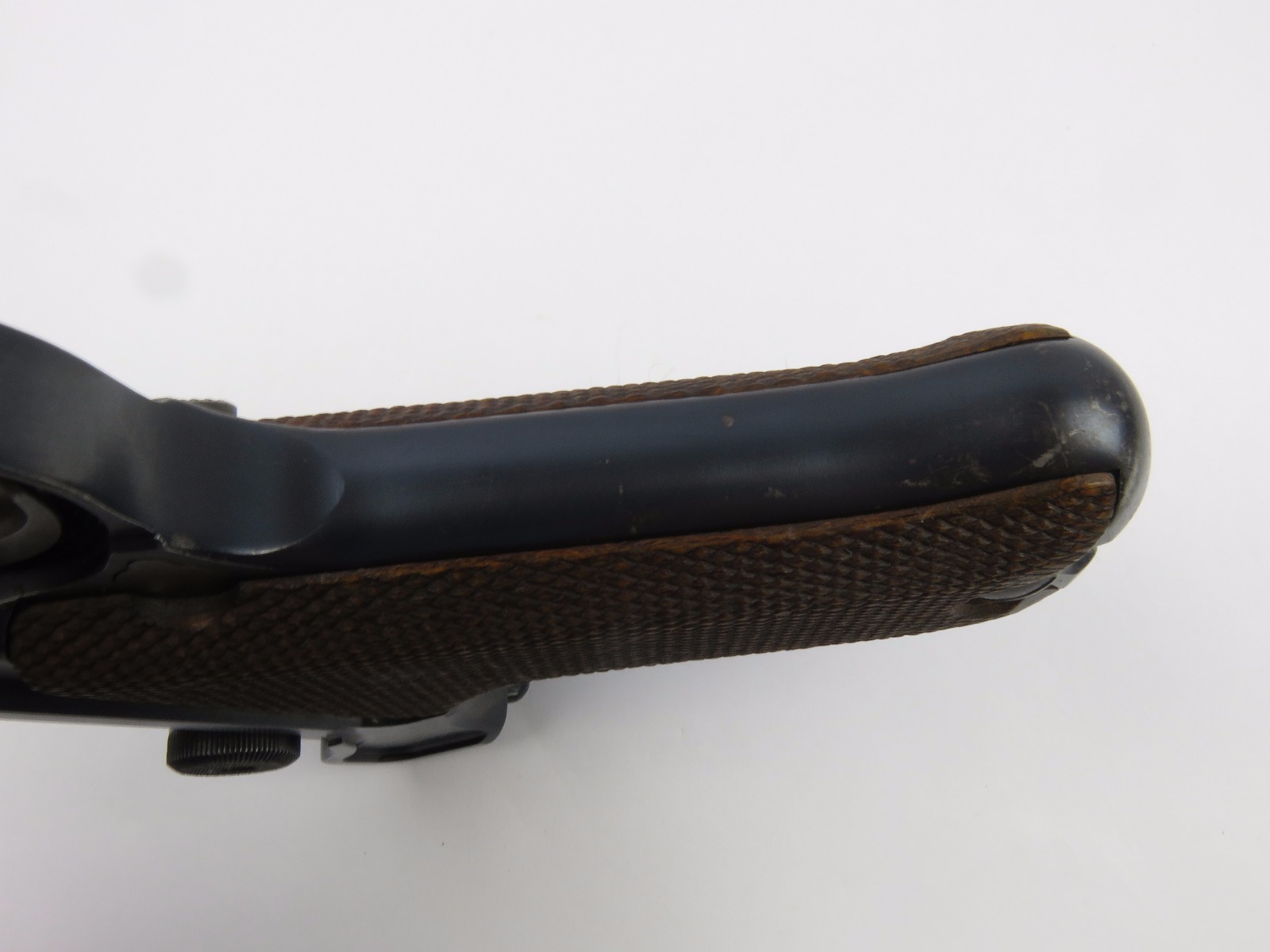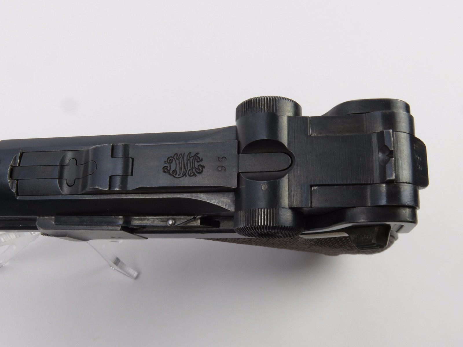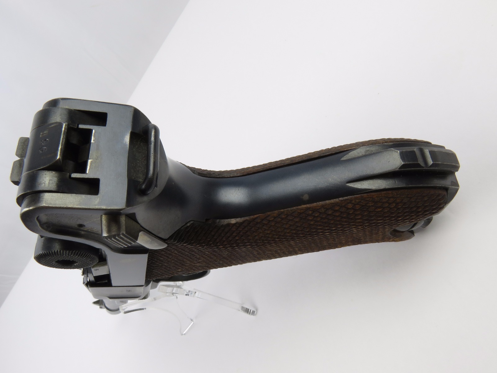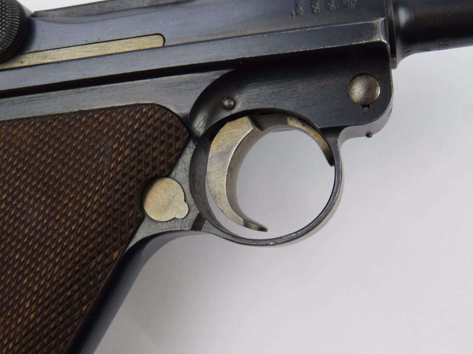 10/17/17 – This is a very nice late WW1 production Luger, that was soon thereafter repurposed for police use. The pistol is in excellent condition considering its’ age. Clearly an all original finish with some nice “honest” wear. The overall condition is about 92-93%. The majority of the wear is on the sideplate and muzzle. However there is also some thinning on the bore exterior bluing, and edge wear throughout. The straw parts have some normal wear/finish loss throughout as well. The straps (grip area) are in excellent condition. The bore is a 9/10 with almost no wear (very close to a 10/10). Comes with a period correct magazine. A very nice WW1 era police rework that would also serve as a nice shooter as well !