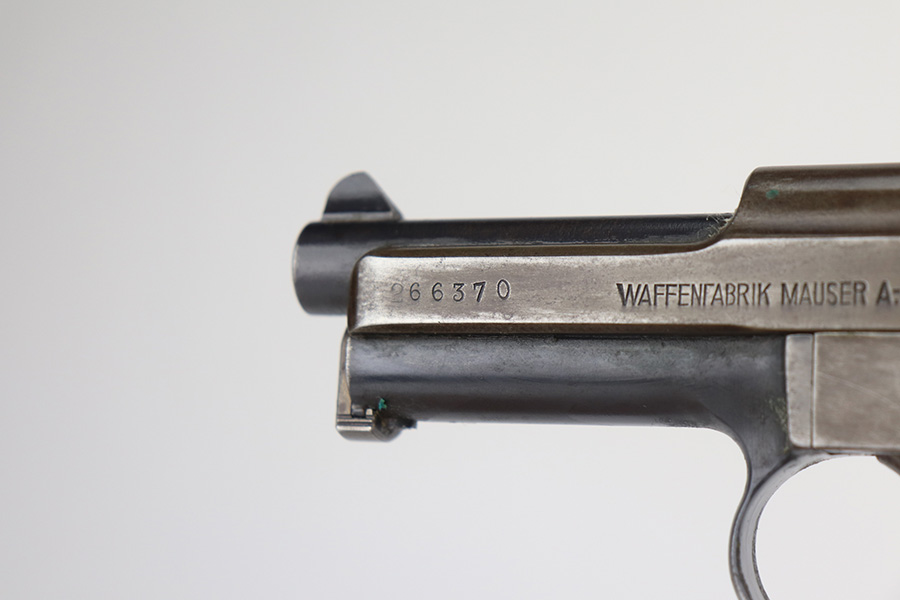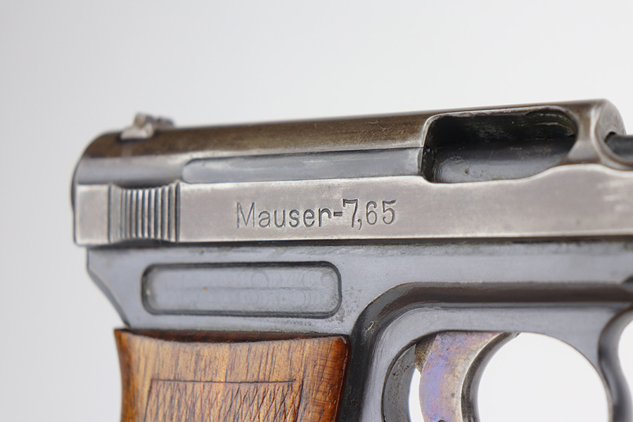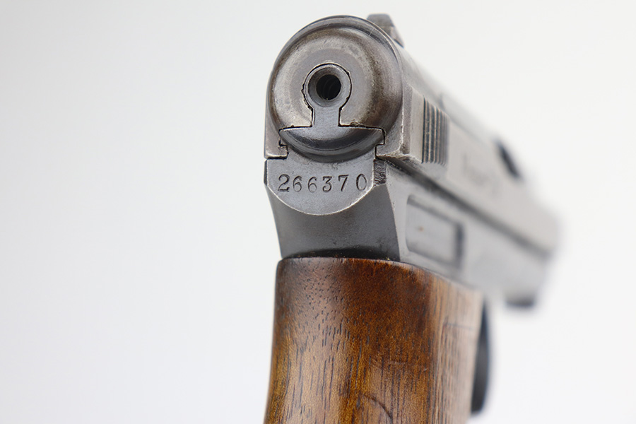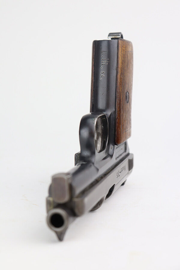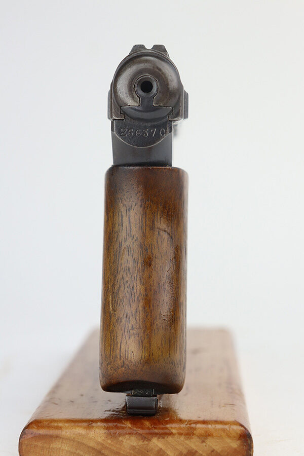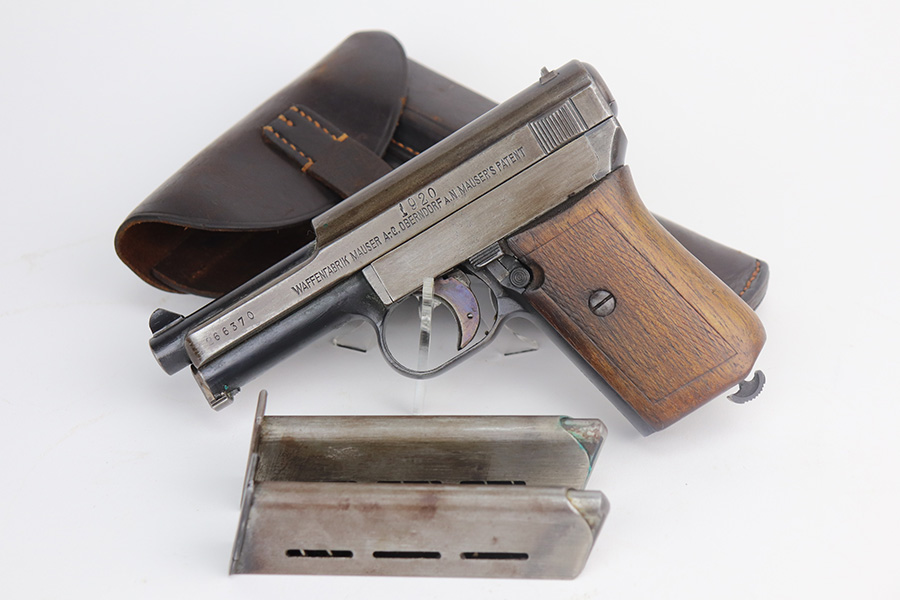6/8/21 – This is a nice example of a Mauser Model 1914 rig that was initially sold in the commercial market in the 1910’s. It was then reworked and issued to the German police force. This is evidenced the “1920” rework stamp on the left side of the slide, the police unit marking on the front strap, and a matching holster with the same police unit marking. The gun also comes with two period-correct magazines. It is all matching and has retained roughly 70-75% of its finish. Most of the wear is thinning on the whole slide, where there is also light brown patina. Comes with a slightly worn wood grip. Excellent bore – shiny with strong rifling.