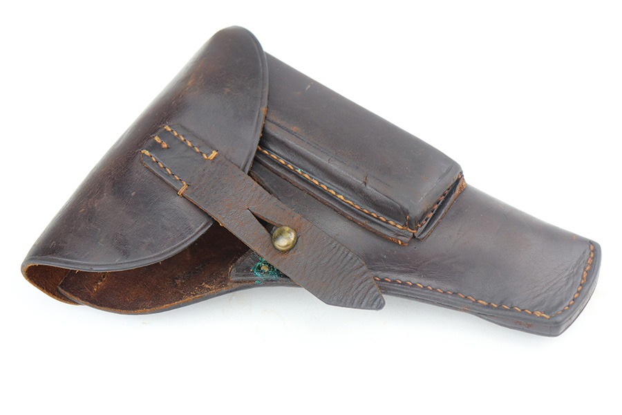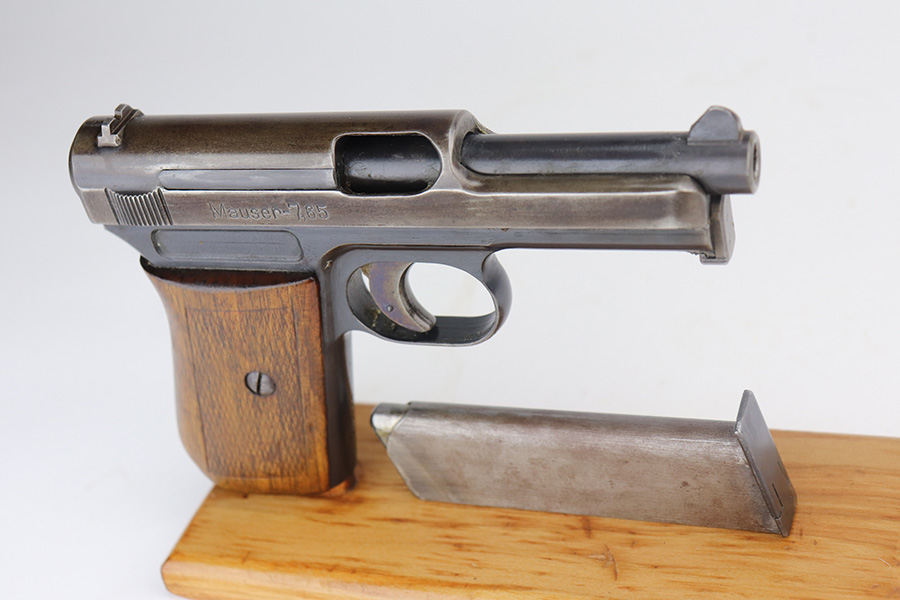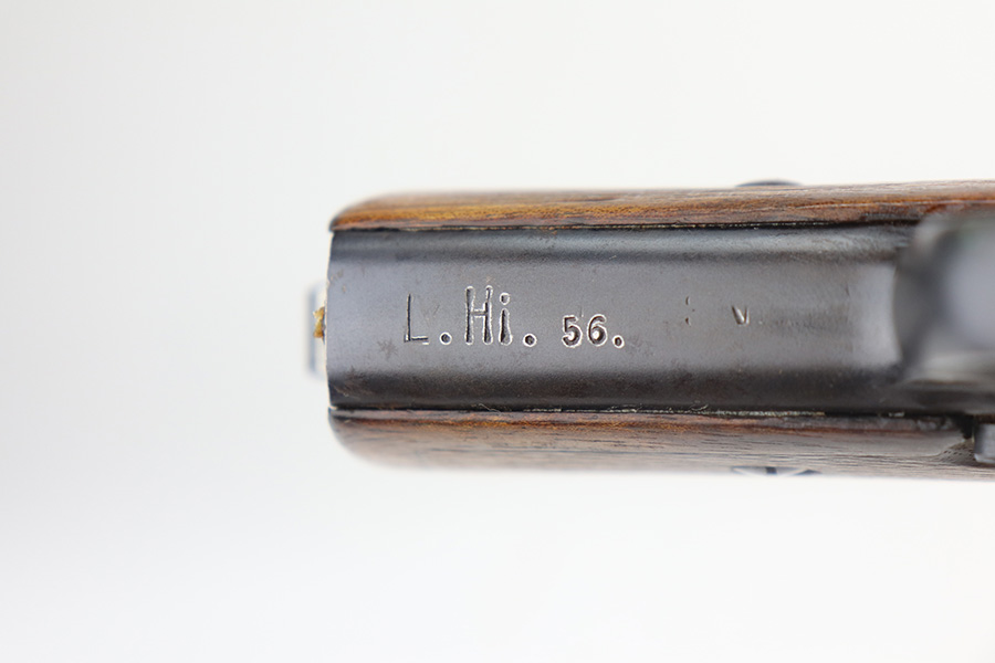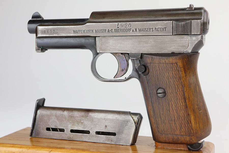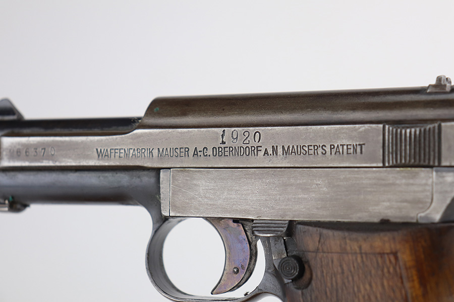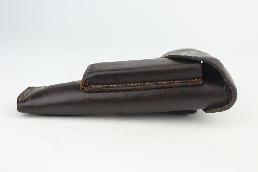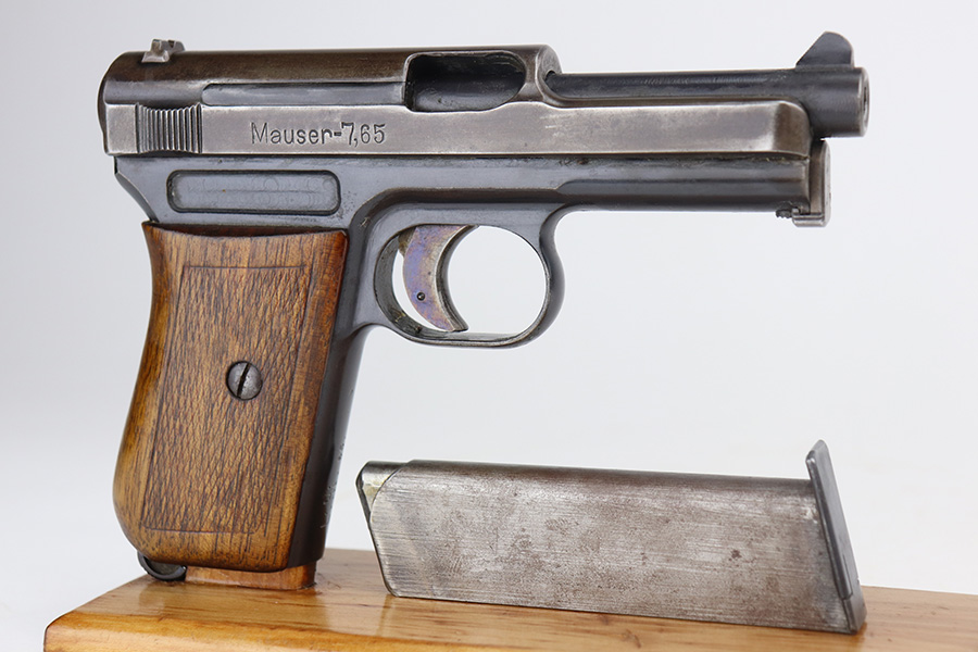 6/8/21 – This is a nice example of a Mauser Model 1914 rig that was initially sold in the commercial market in the 1910’s. It was then reworked and issued to the German police force. This is evidenced the “1920” rework stamp on the left side of the slide, the police unit marking on the front strap, and a matching holster with the same police unit marking. The gun also comes with two period-correct magazines. It is all matching and has retained roughly 70-75% of its finish. Most of the wear is thinning on the whole slide, where there is also light brown patina. Comes with a slightly worn wood grip. Excellent bore – shiny with strong rifling.