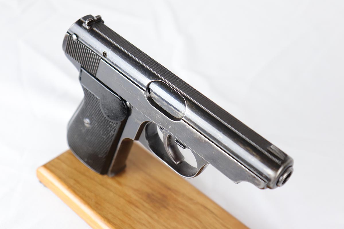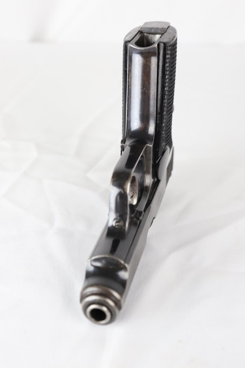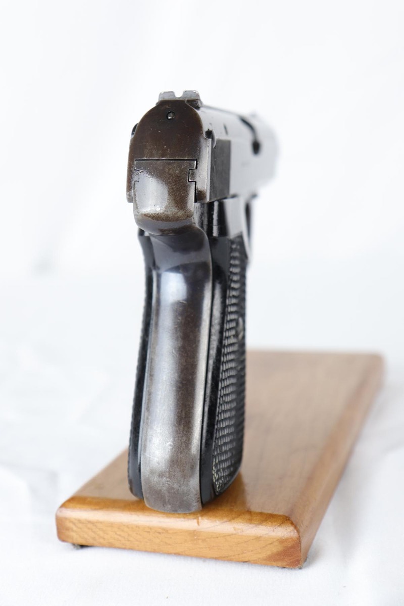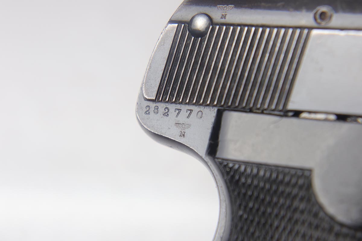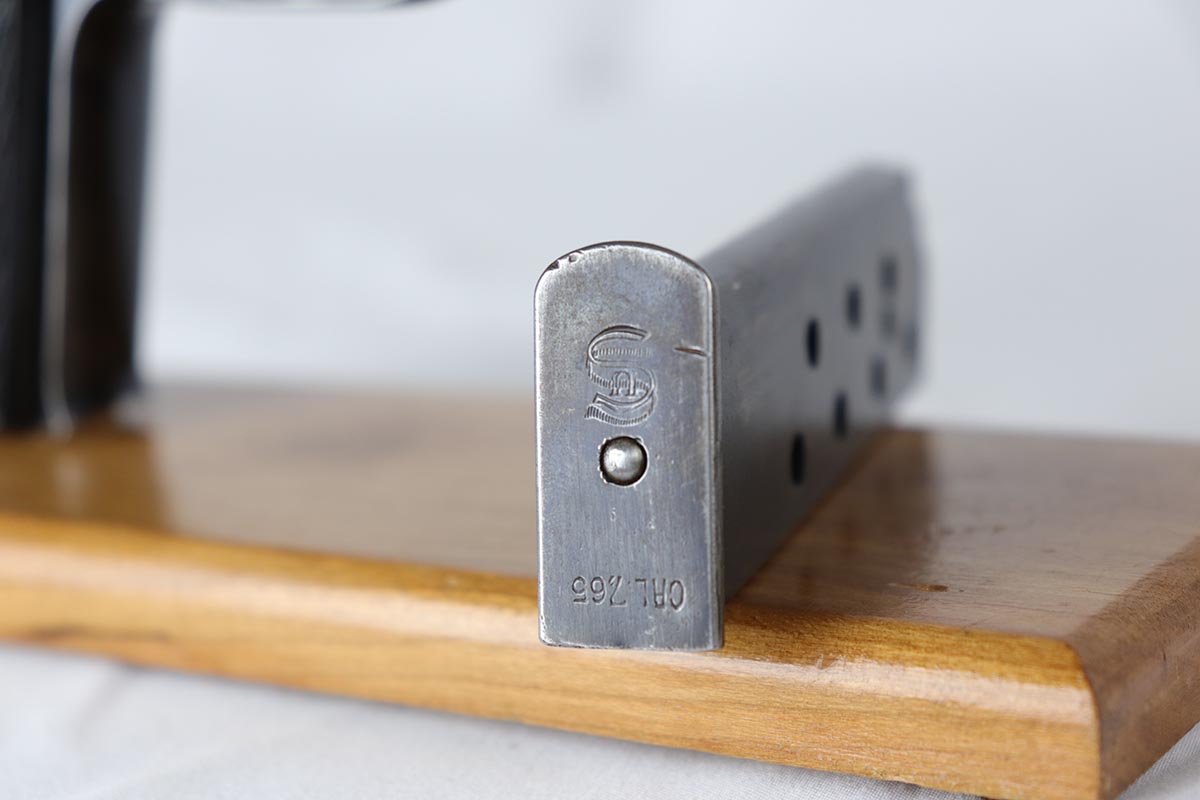 8/23/18 – This is an early first variation Sauer 38h that was issued to the German Police. The serial range on first variation Eagle/Cs is 268xxx-326xxx, so this one falls firmly in the middle. The original finish is high-polish blue and retains about 80%, with uniform thinning in all areas. Original grips and magazine with no major flaws, just a few dings in the grips. Excellent, shiny bore. Functionally correct, including de-cocker.