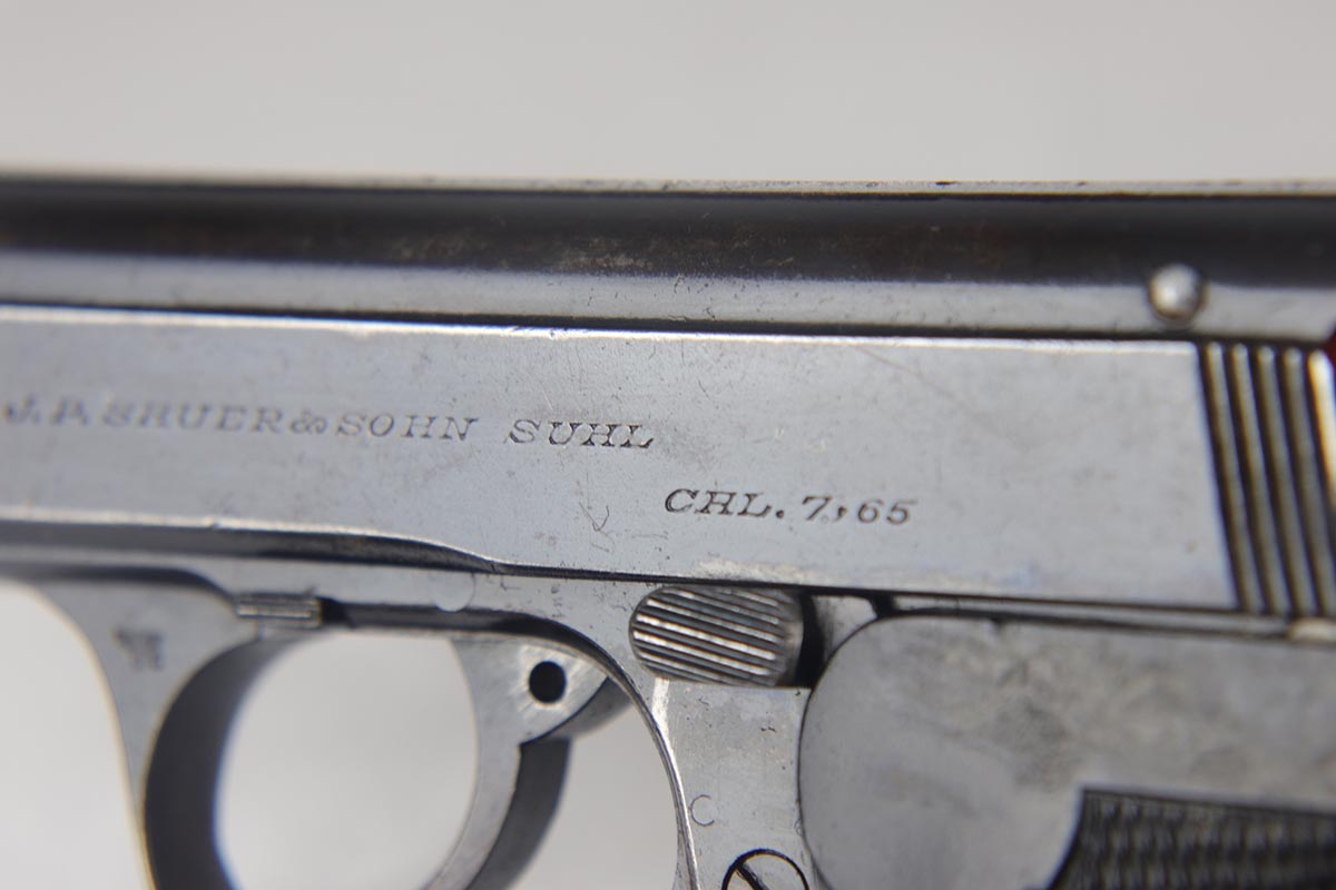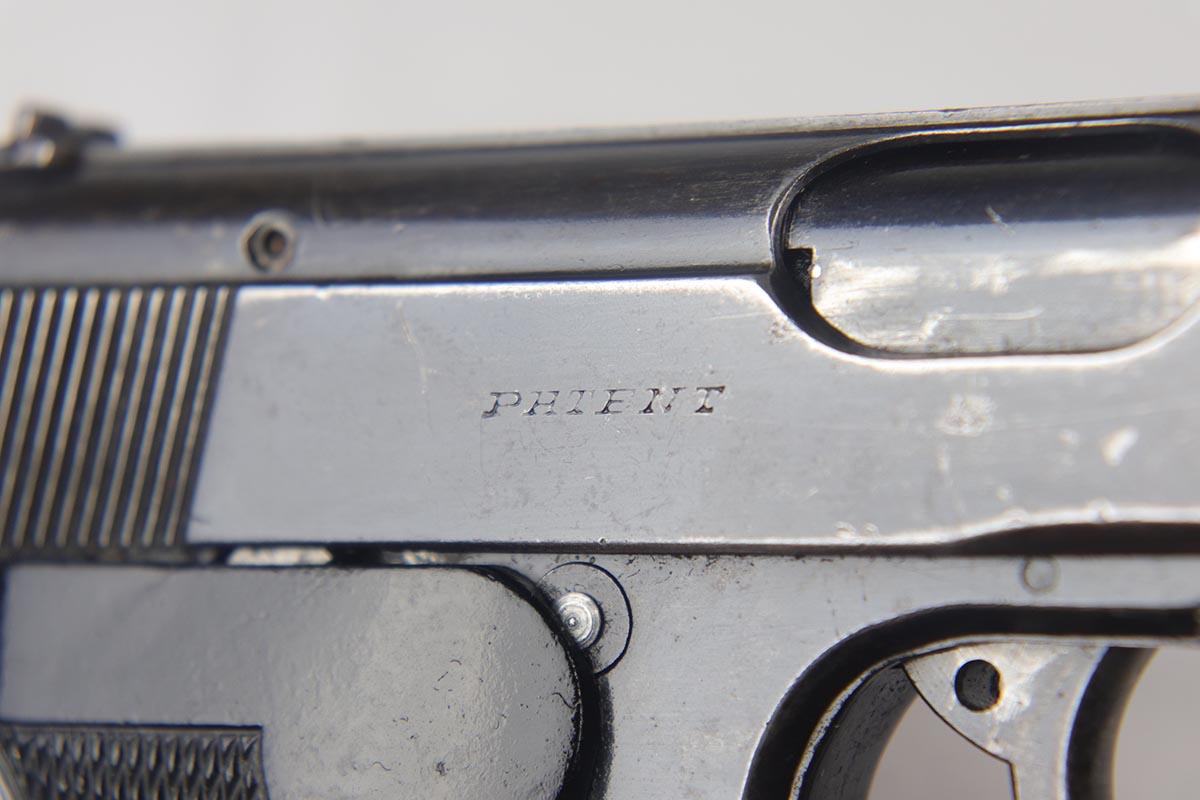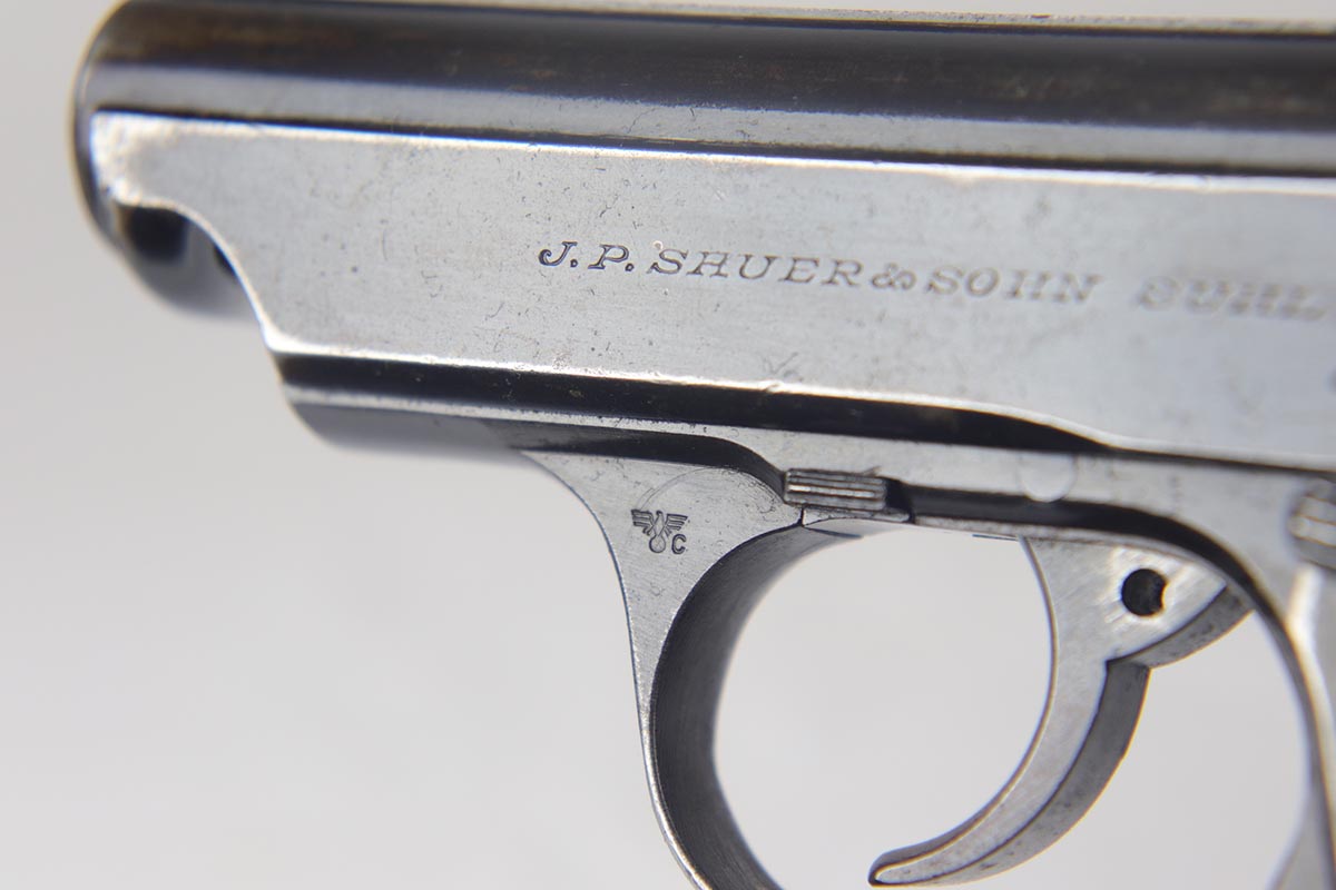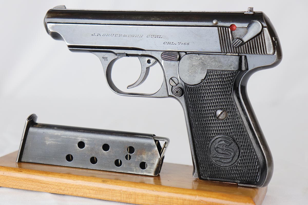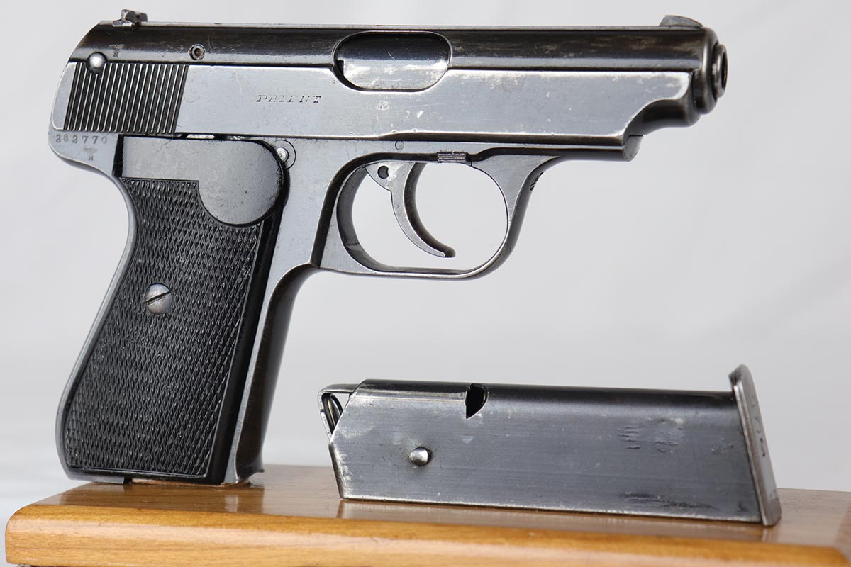 8/23/18 – This is an early first variation Sauer 38h that was issued to the German Police. The serial range on first variation Eagle/Cs is 268xxx-326xxx, so this one falls firmly in the middle. The original finish is high-polish blue and retains about 80%, with uniform thinning in all areas. Original grips and magazine with no major flaws, just a few dings in the grips. Excellent, shiny bore. Functionally correct, including de-cocker.