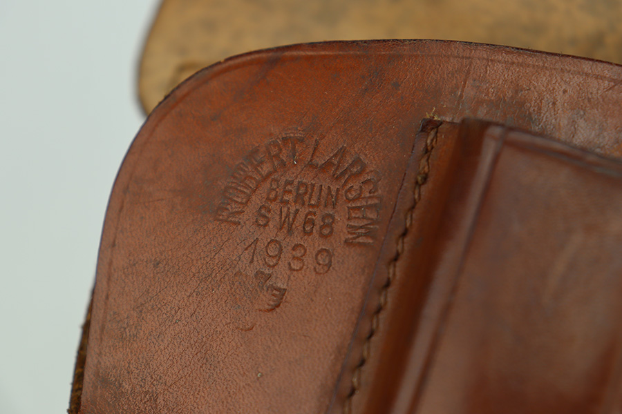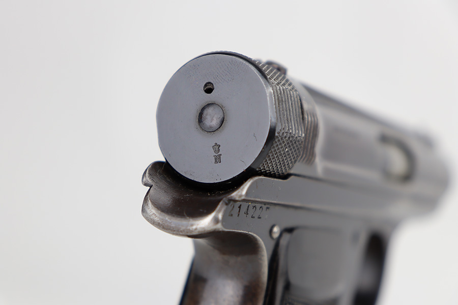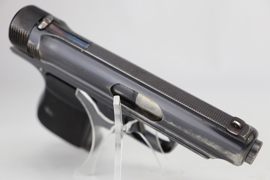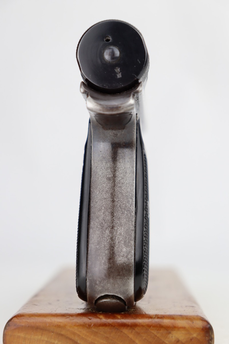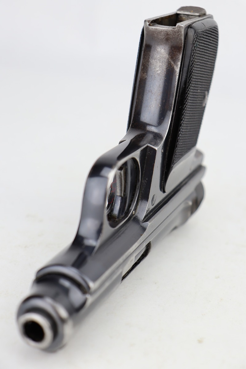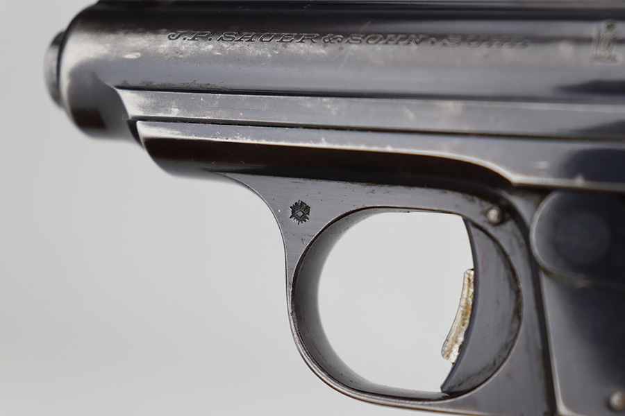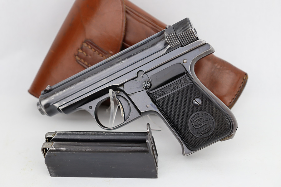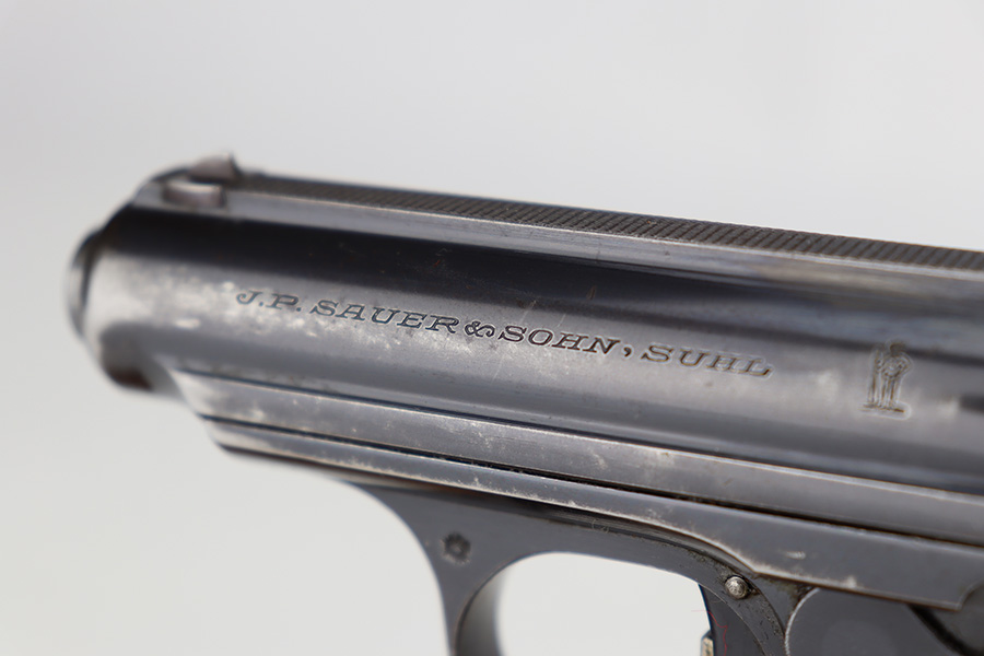 6/12/23 – This is a nice example of a rare Sauer Behorden pistol. This is a Sauer Model 1913 issued to the Nazi-era Prussian State Police. This is evidenced by the “Star” police marking on the left side of the trigger guard. This was the last iteration of this pistol before they switched over to the 38h. They were marketed to and almost exclusively sold to Nazi-era police organizations. They had added safety features, such as the additional trigger safety, making them appealing for police. Very few of these guns were produced. This one is all matching and has retained roughly 75% of its original high polish finish. There is thinning and spotty brown patina on both grip straps. Wear around the muzzle and some spotty wear along both sides of the slide and frame. Fitted with excellent period-correct black bakelite grips. Minty bore. Comes as a rig with one original matching-numbered magazine, one un-numbered magazine, and a minty 1939-dated police holster.
