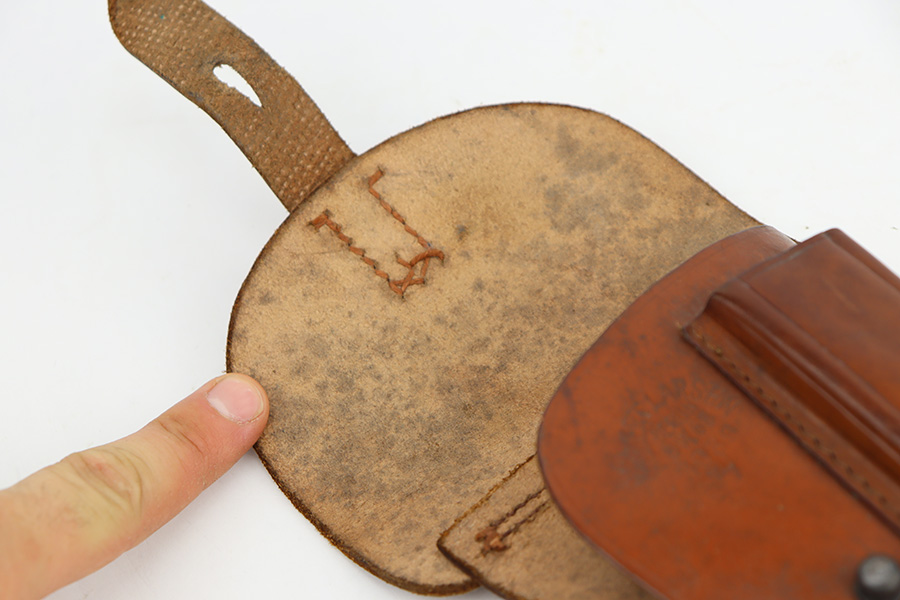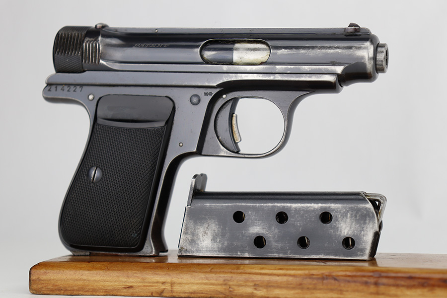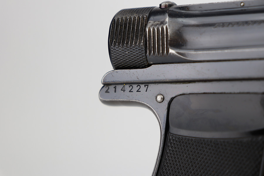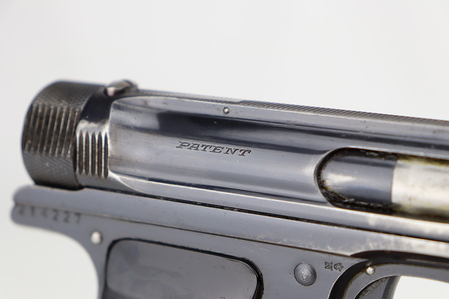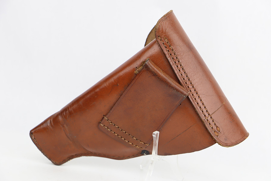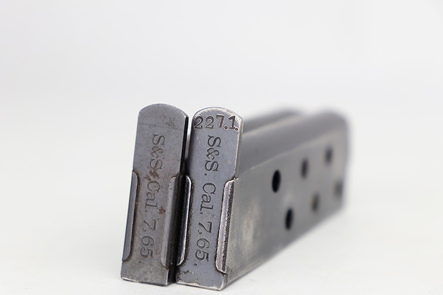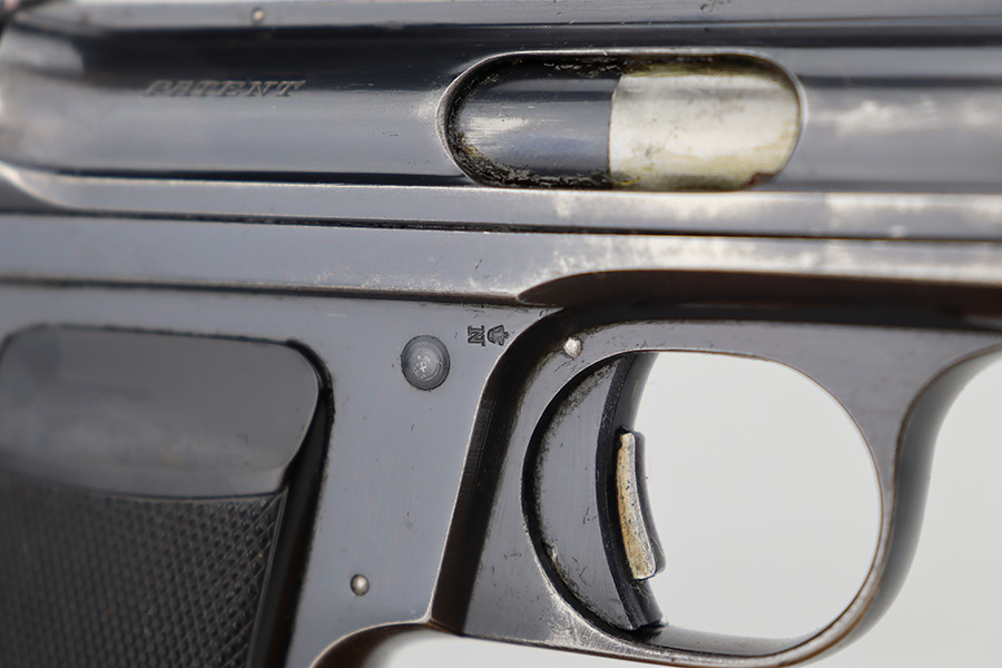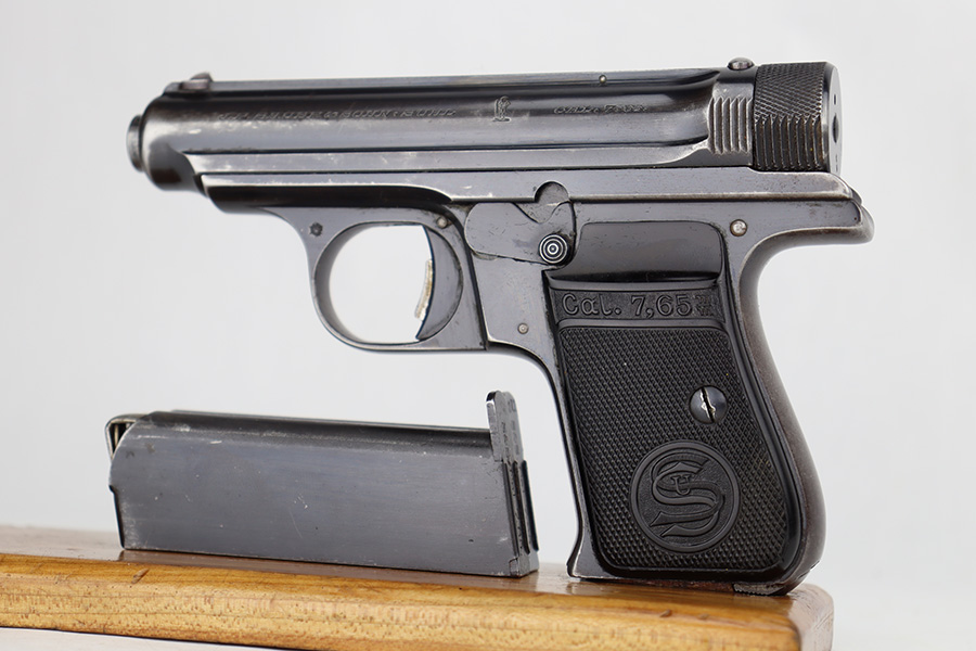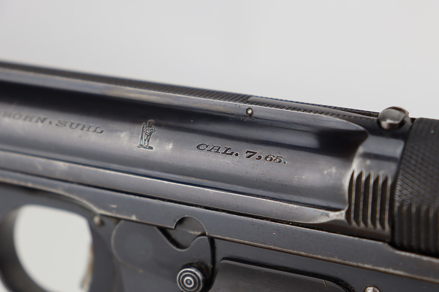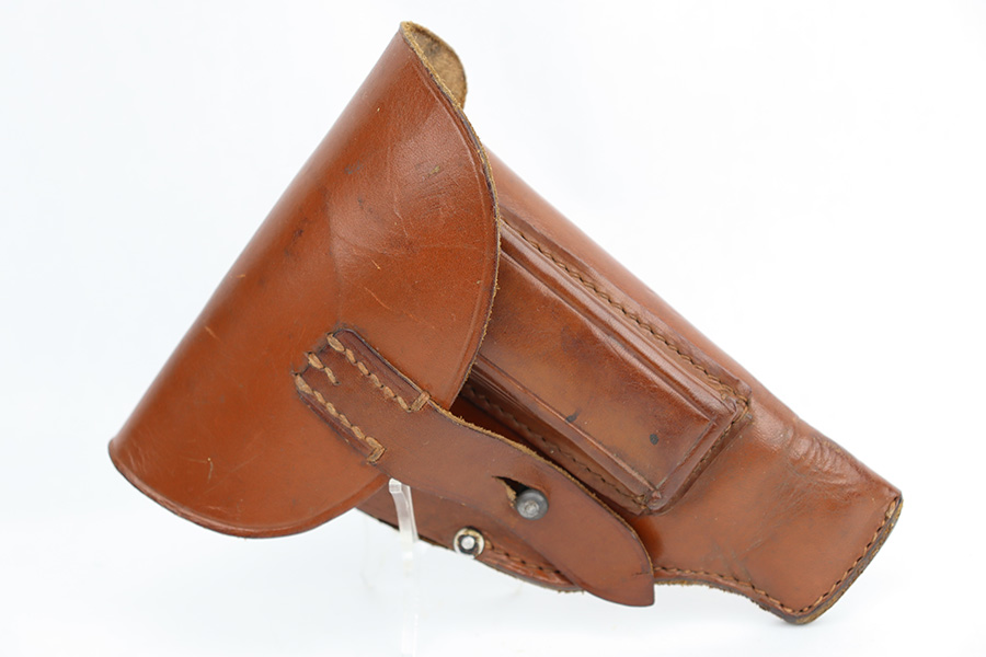 6/12/23 – This is a nice example of a rare Sauer Behorden pistol. This is a Sauer Model 1913 issued to the Nazi-era Prussian State Police. This is evidenced by the “Star” police marking on the left side of the trigger guard. This was the last iteration of this pistol before they switched over to the 38h. They were marketed to and almost exclusively sold to Nazi-era police organizations. They had added safety features, such as the additional trigger safety, making them appealing for police. Very few of these guns were produced. This one is all matching and has retained roughly 75% of its original high polish finish. There is thinning and spotty brown patina on both grip straps. Wear around the muzzle and some spotty wear along both sides of the slide and frame. Fitted with excellent period-correct black bakelite grips. Minty bore. Comes as a rig with one original matching-numbered magazine, one un-numbered magazine, and a minty 1939-dated police holster.
