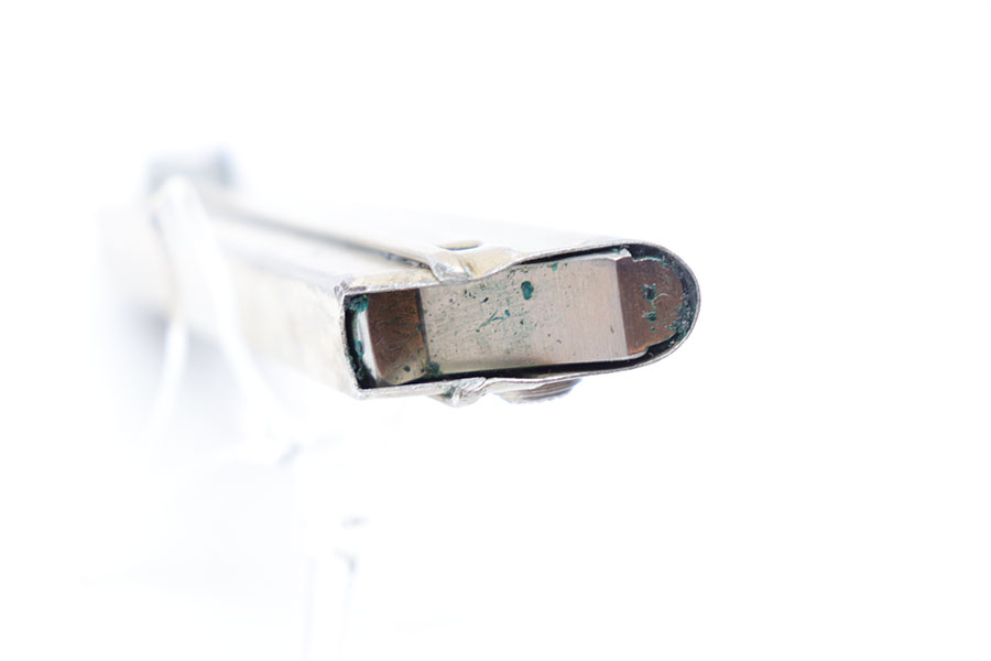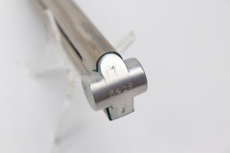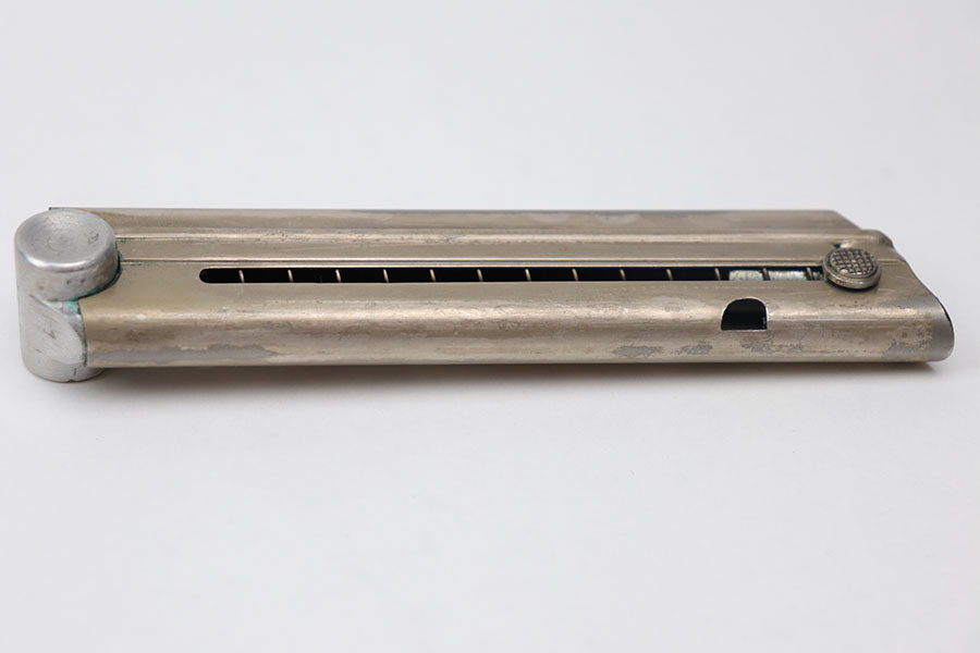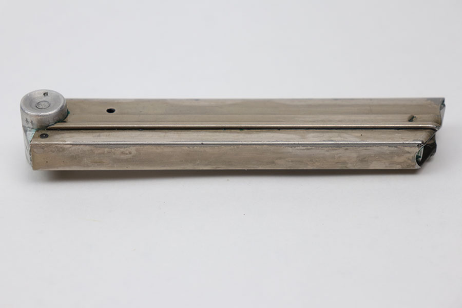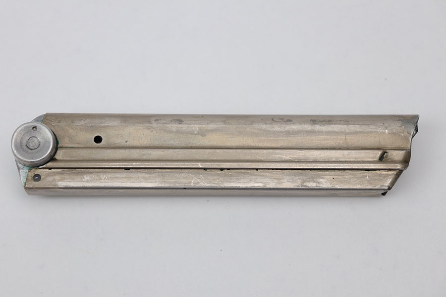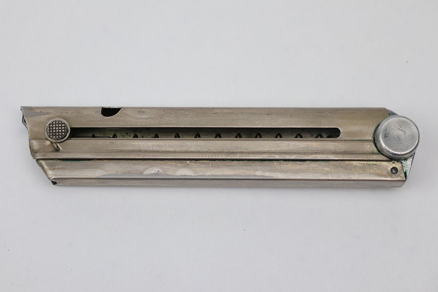 11/10/20 – This is an original WW2 police luger magazine. The base of the magazine is serial numbered with a number “1” above, designating this as the main magazine. Under the serial number is a star over “K” proof stamp. This is a fairly scarce police proof. Appropriate for WW2 production Police issued Lugers. Fully functional spring.