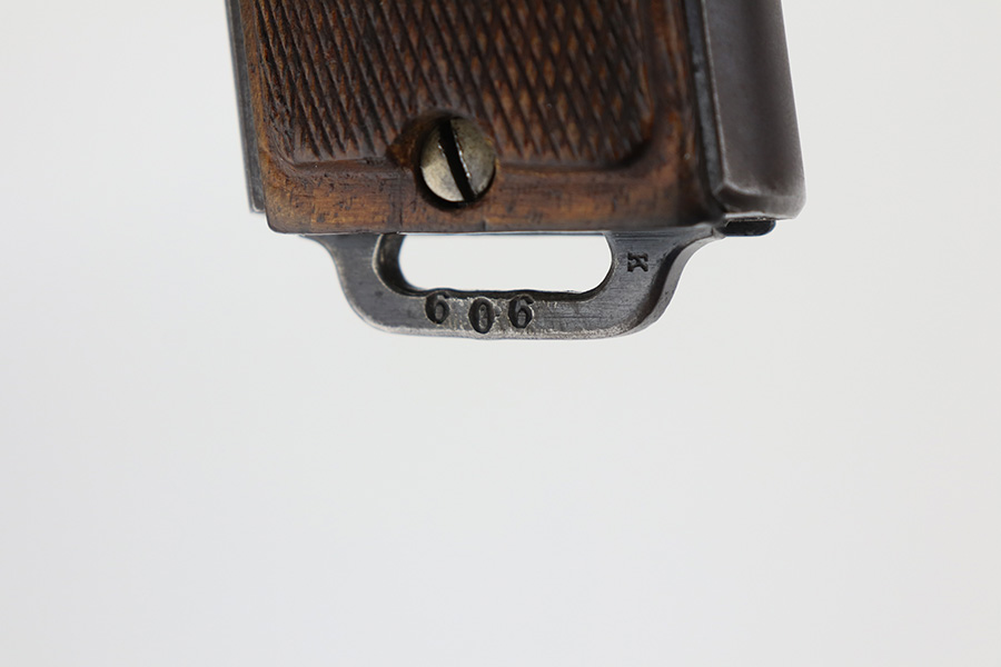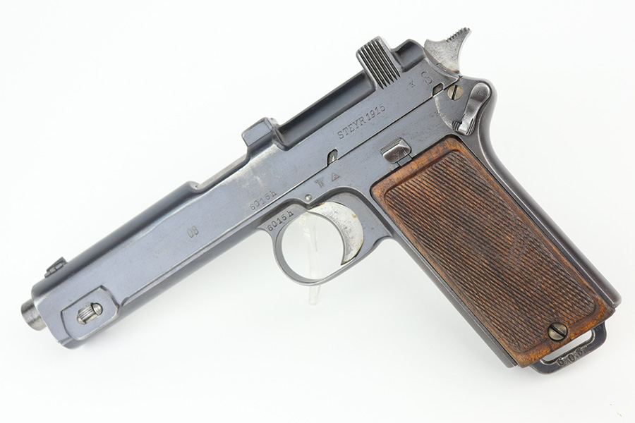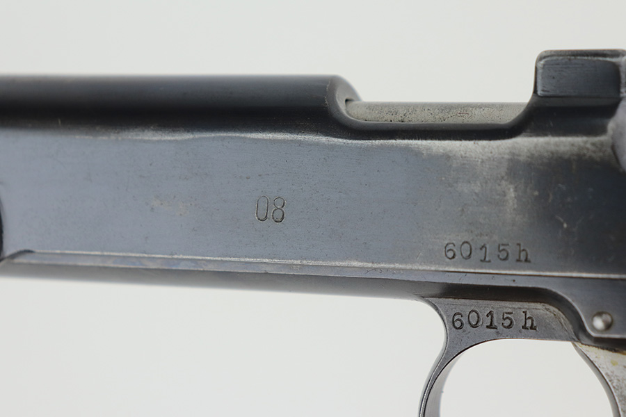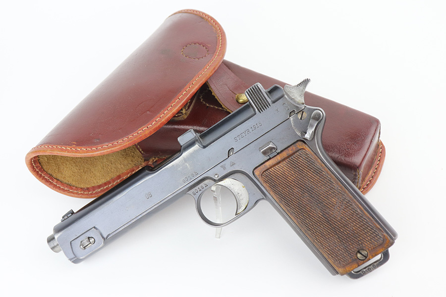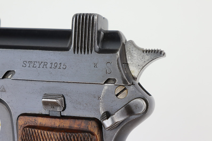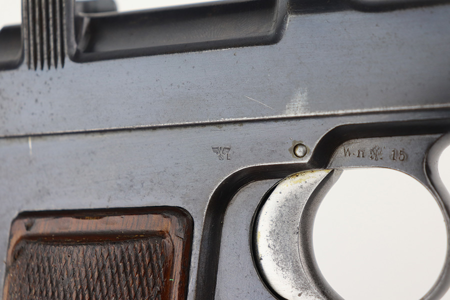8/16/21 – This is an original and correct Steyr Hahn M1912 that was reworked by Mauser for use by the German police during WW2. The Steyr Hahn 1912 was manufactured in Imperial Austria, but after the 1938 German occupation of Austria some were converted to 9mm. They were stamped ’08’ to indicate this conversion, E/N proofed, and accepted with the German Police Eagle/L. This pistol is all original and correct with about 90% bluing remaining. There is some finish loss on the left side of the slide, and a large area of finish loss on the front strap that has some scratches in it, as well. Slide and frame are both dated 1915. Excellent bore. Comes with a very nice reproduction holster.