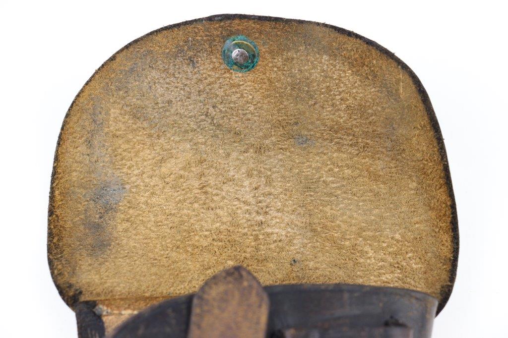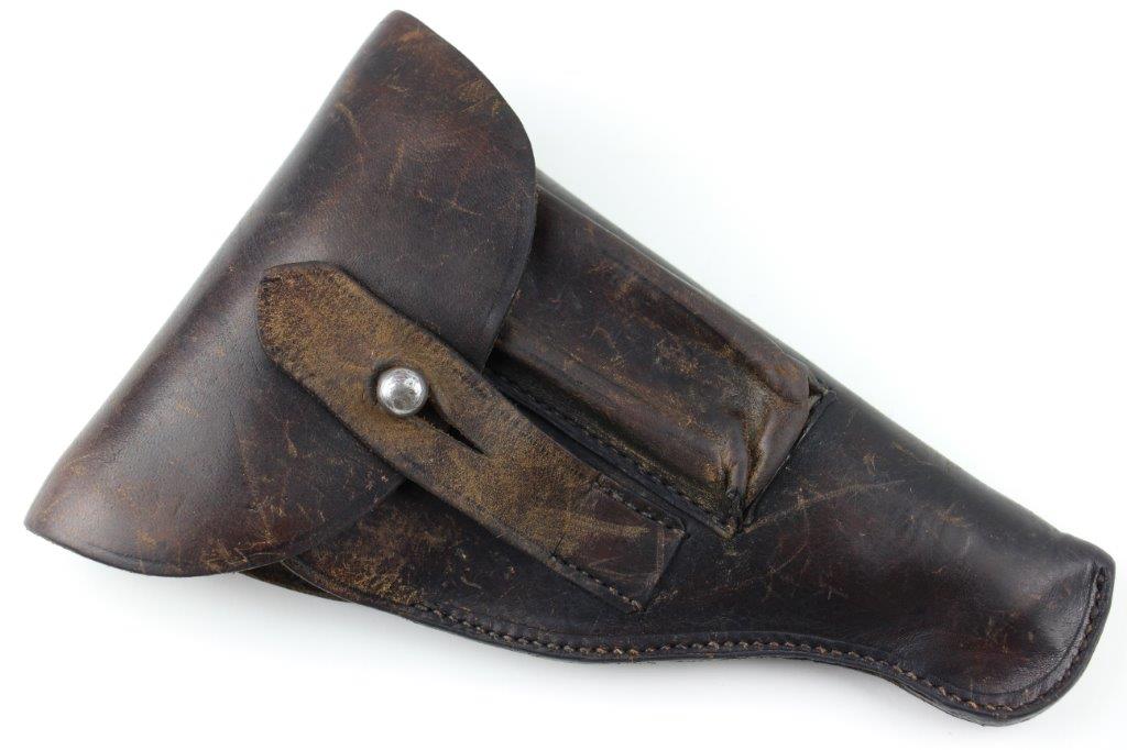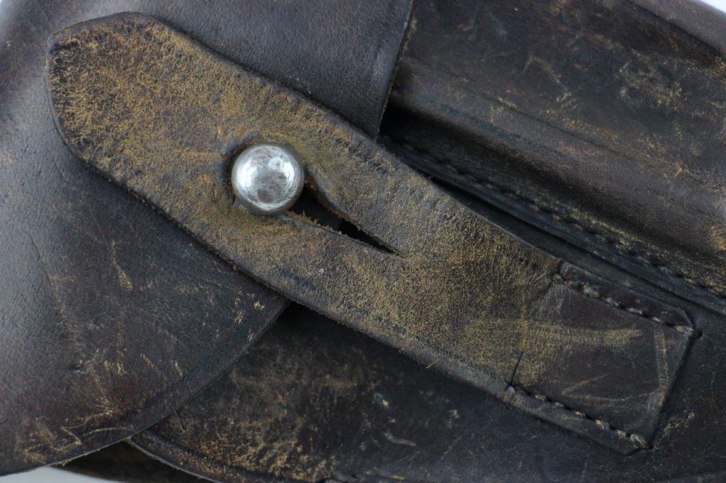 6/11/24 – This is an original WW2 era police style pistol holster. The holster is in great overall condition with a steel closure knob and no visible markings or stamps. The leather was once dyed black but there’s natural surface aging and use wear throughout, leaving the dye faded around the magazine pouch and top leather. The stitching is all tight and original with no notable stitching flaws. The interior leather shows normal use wear. The leather overall is soft and pliable. Fits most 7.65mm Axis pistols; measures 13cm wide and about 19cm long when closed.
