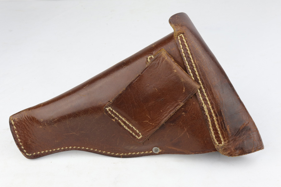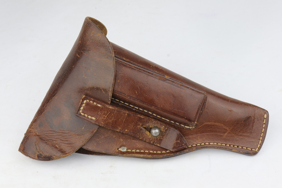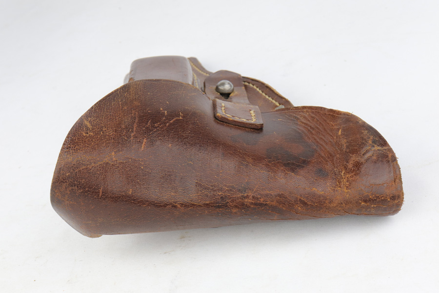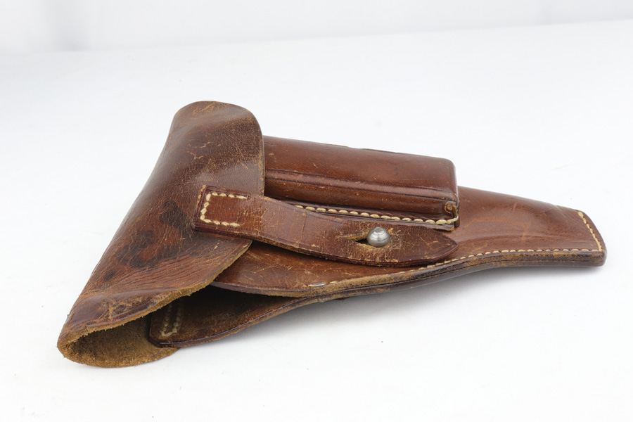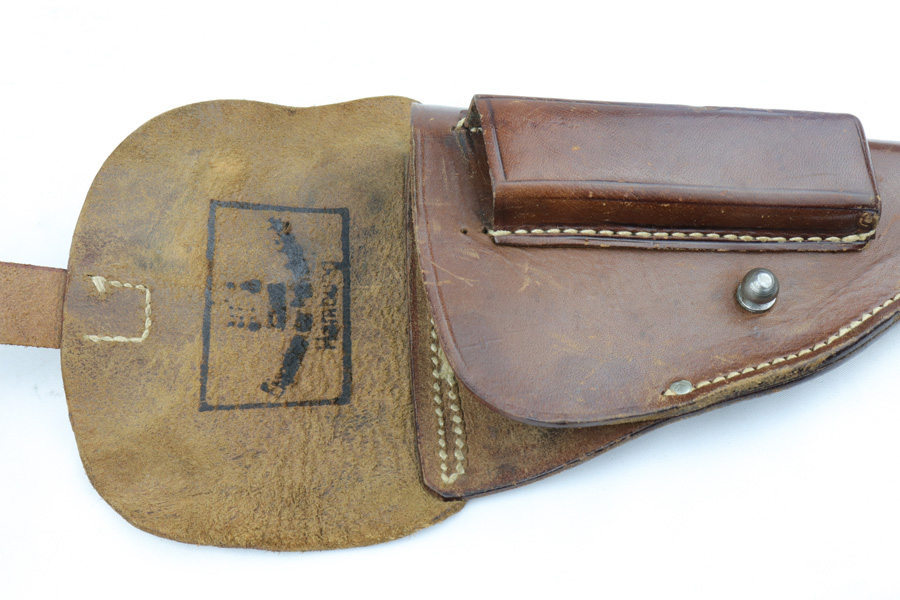 3/19/19 – This is a police style holster appropriate for most 7.65mm pistols such as the Walther PP. The holster has no markings except for an interior ink stamp. The ink stamp is hard to decipher, but you can tell the maker is from Hamburg, Germany. Most likely WW1 era production. The magazine pouch is about 3.75 inches long. Overall length when shut is 7 inches. All original leather has normal wear. All original stitching. A nice vintage holster priced to sell!