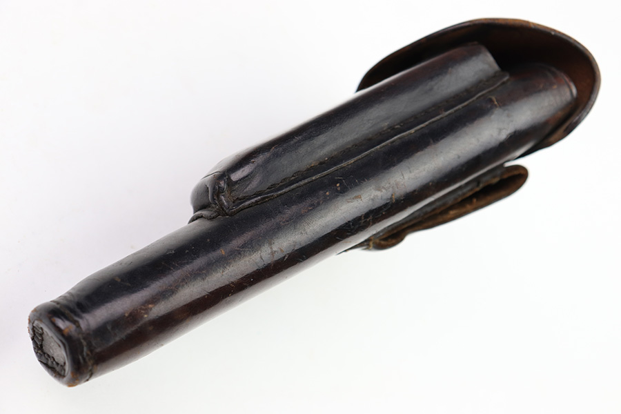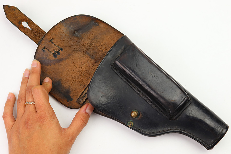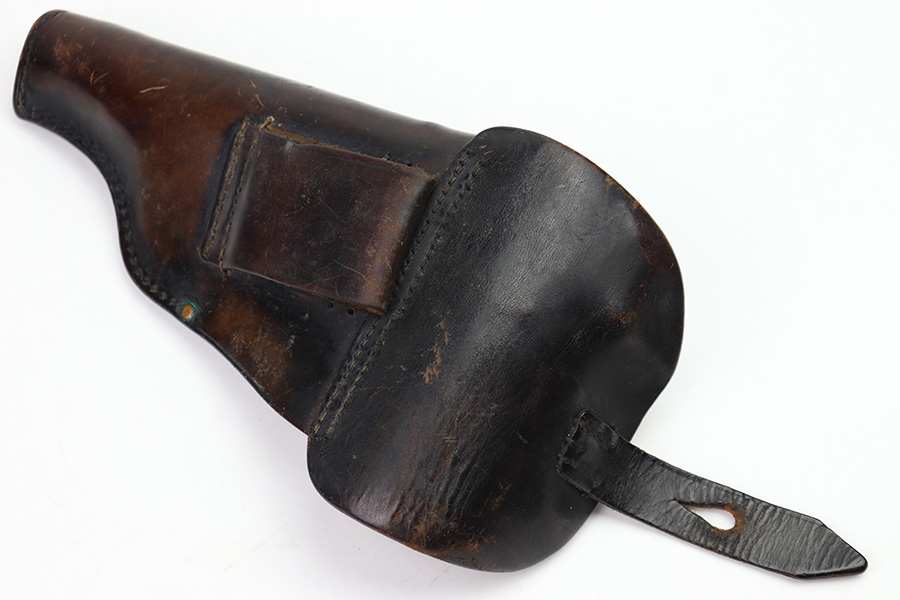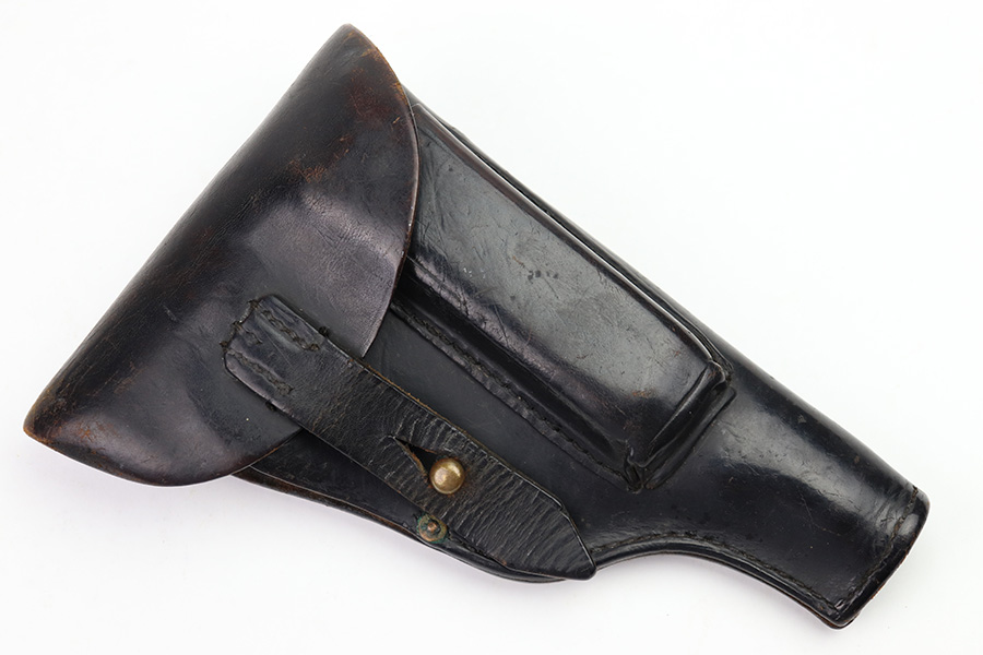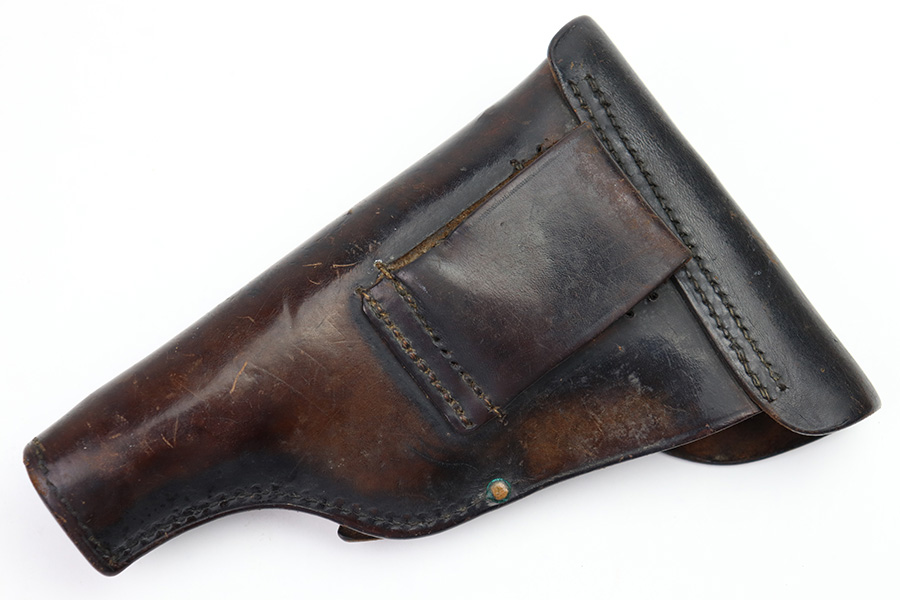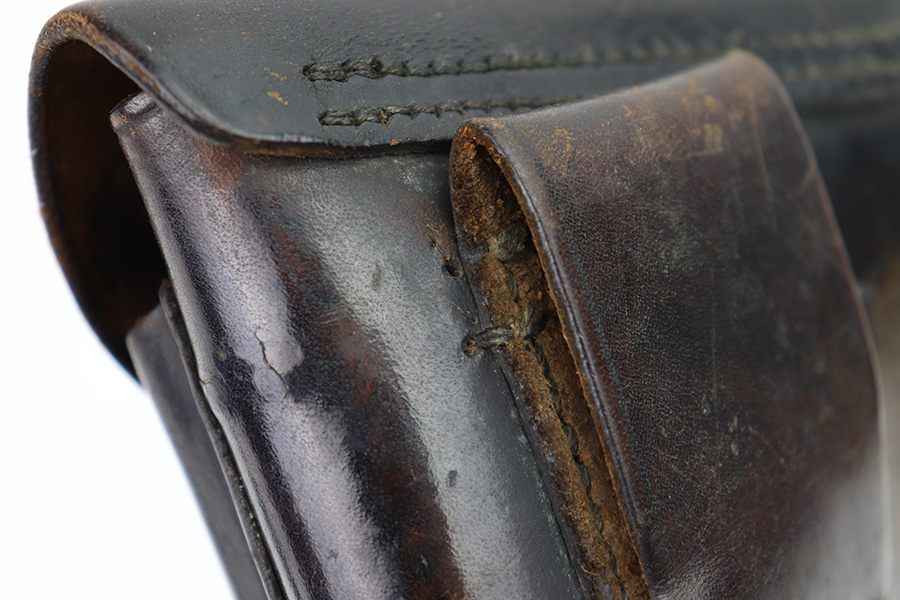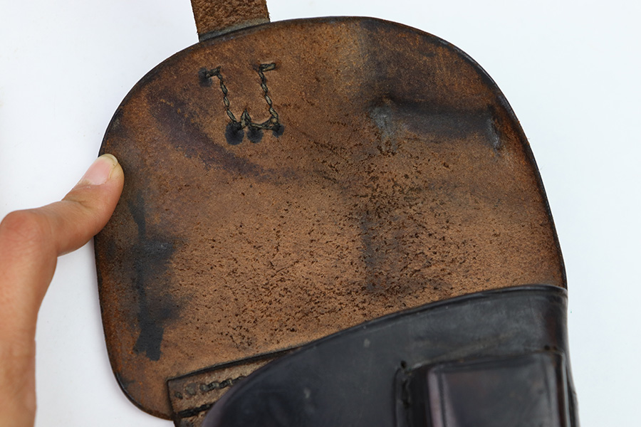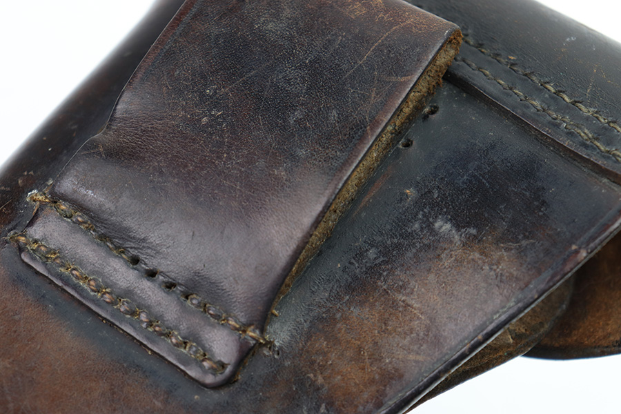8/4/22 – This is an unmarked police style holster that fits a Walther PP or similar sized 7.65mm pistol. The holster has early / pre WW2 features like a brass closure stud, and a flat-toe base. The back belt loop has been replaced, and covers what was once a rivet hole. So this holster was once modified with rivets and then later restored back to a “more original” configuration. The leather is in great overall condition with mild pliability and no major issues. Some typical signs of aging and use. Nice stitching without any major issues.