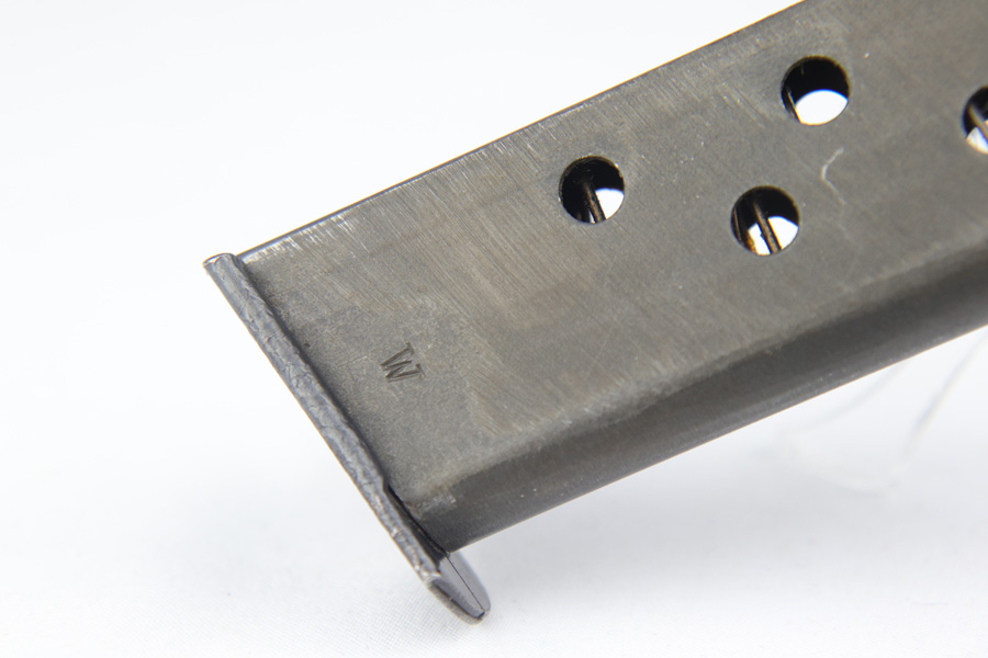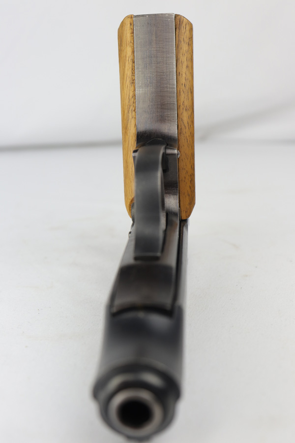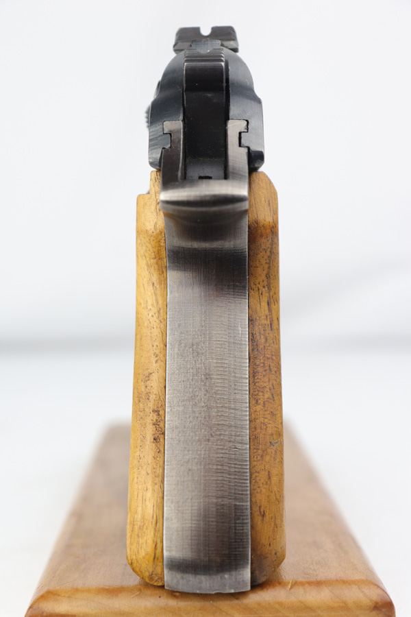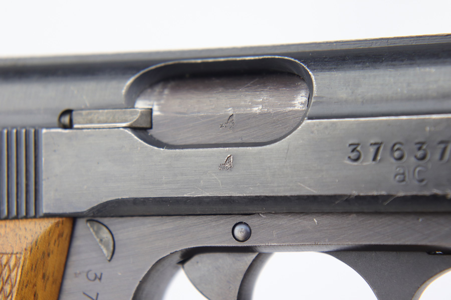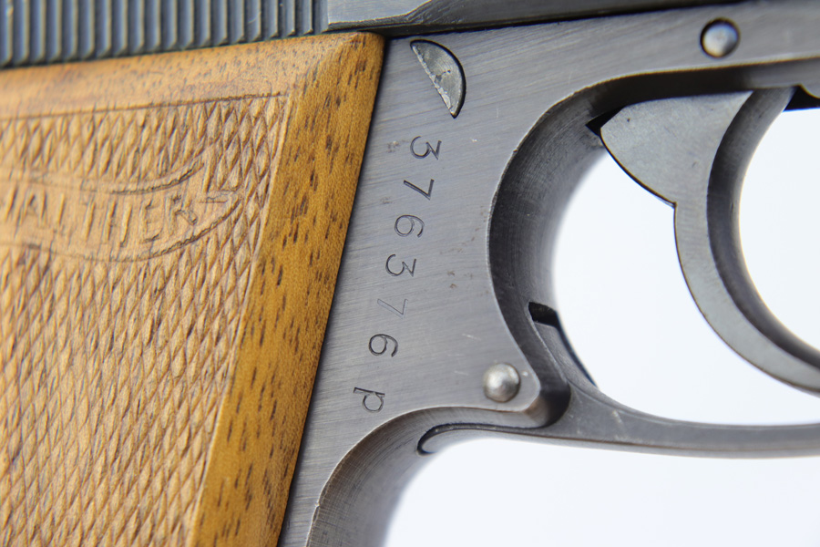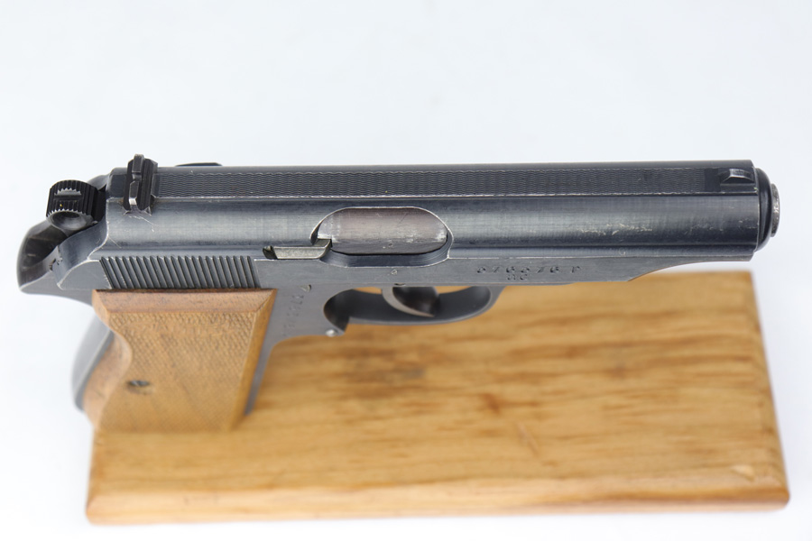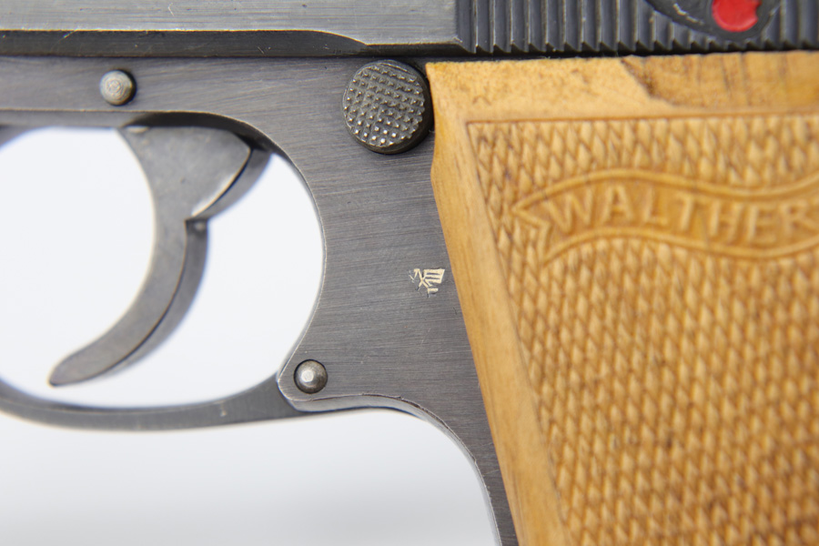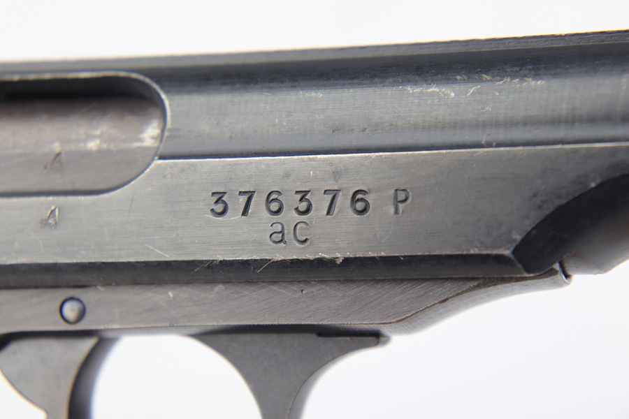 12/19/18 – This is an excellent, late-war “ac” frame Walther PP with no slide legend from World War II. The pistol is Police Eagle/F marked and has Eagle/N firing proofs. All parts are matching and correct. This pistol would have been made in 1945 during the last months of the war. The original finish is about 97-98% with an excellent bore. It has beautiful blond wood grips. Scarce ‘W’ marked magazine.