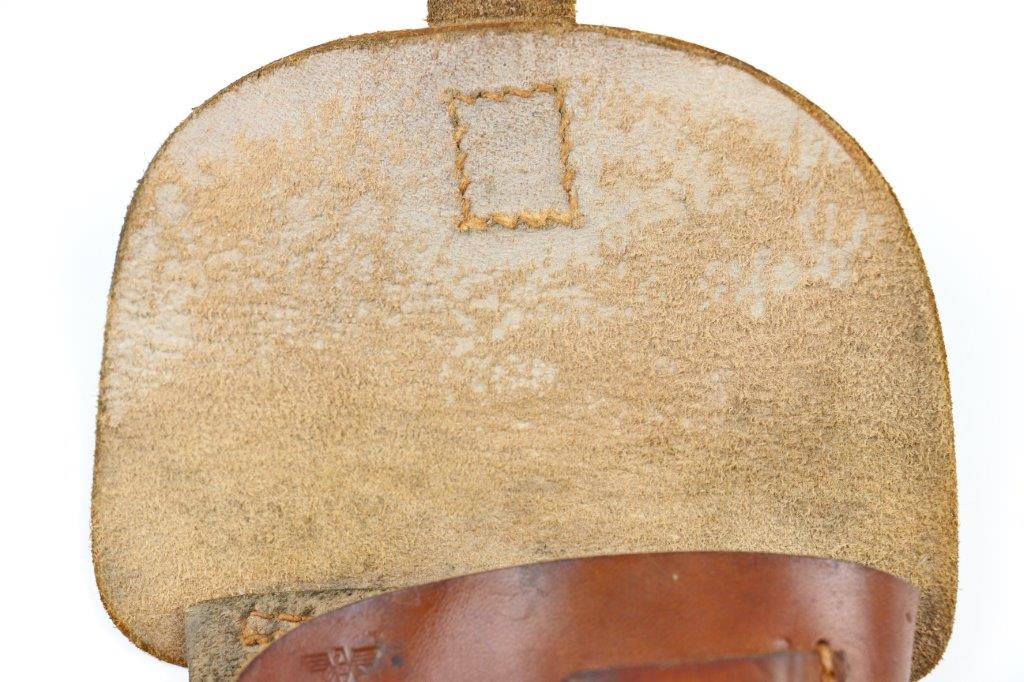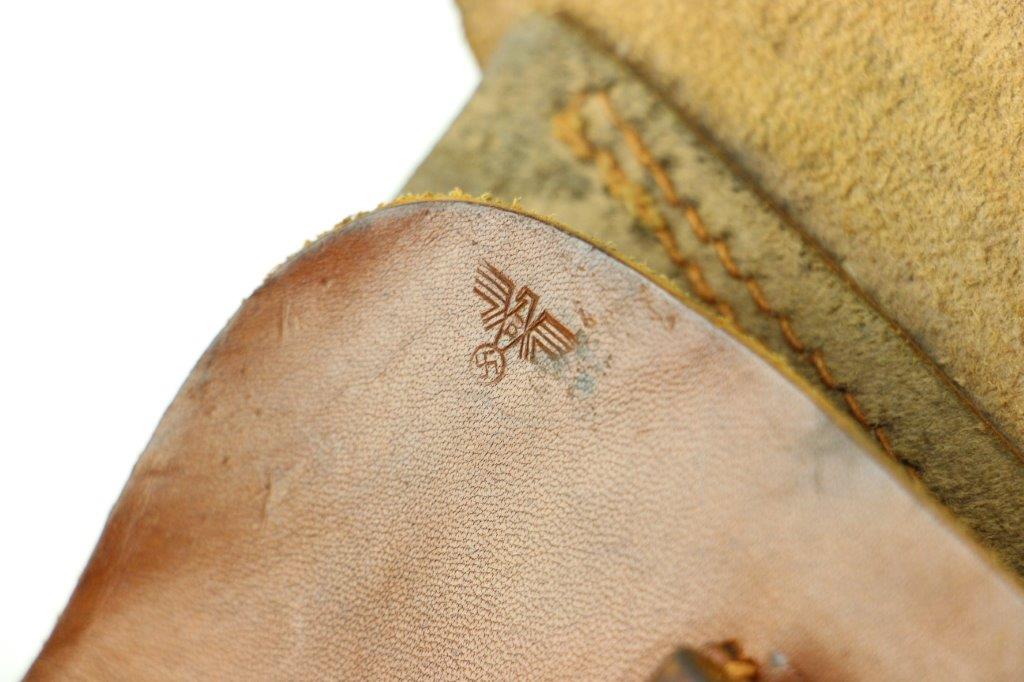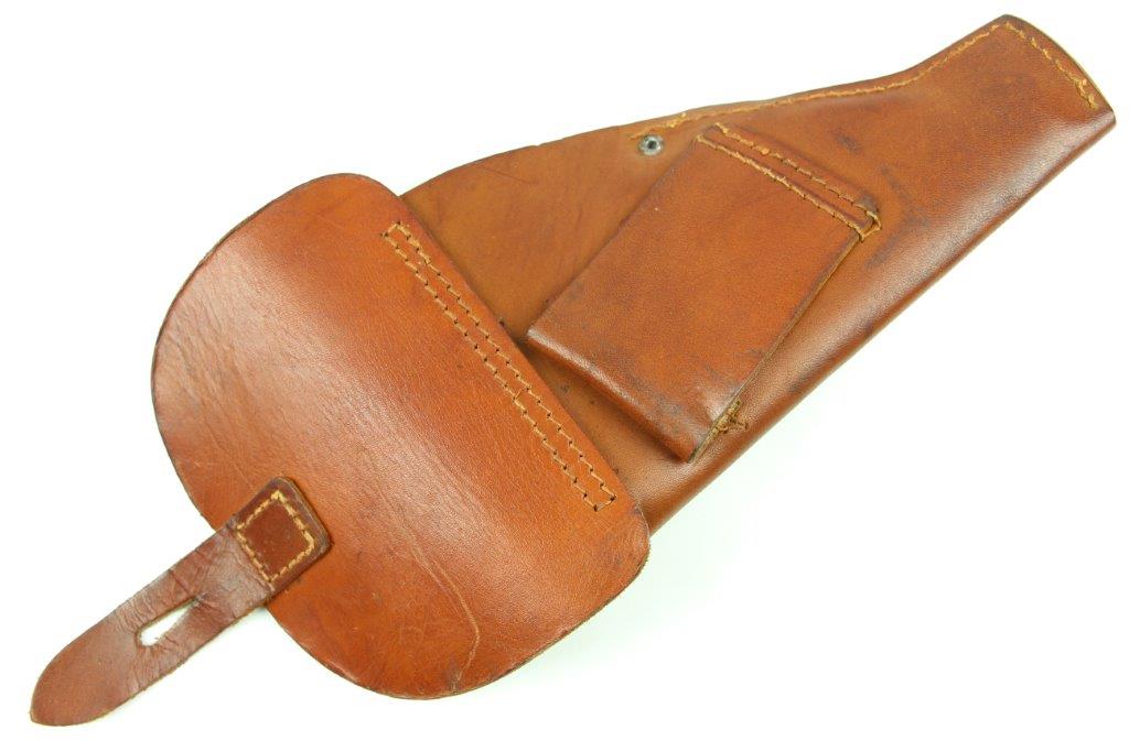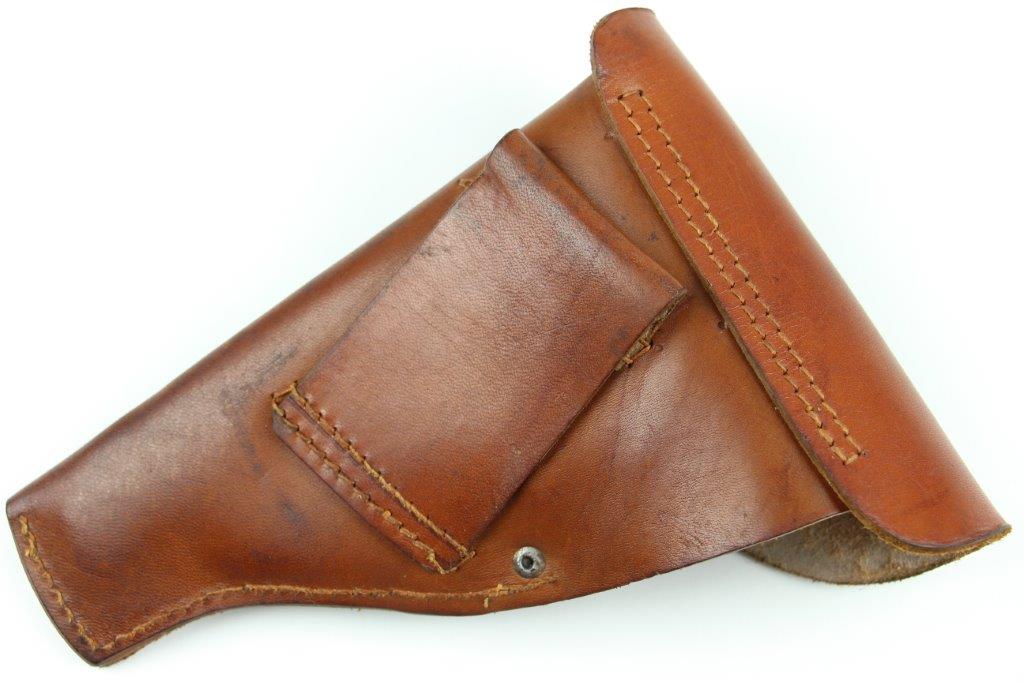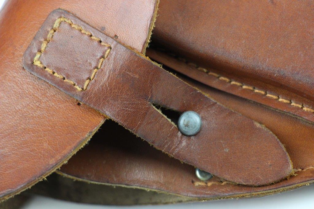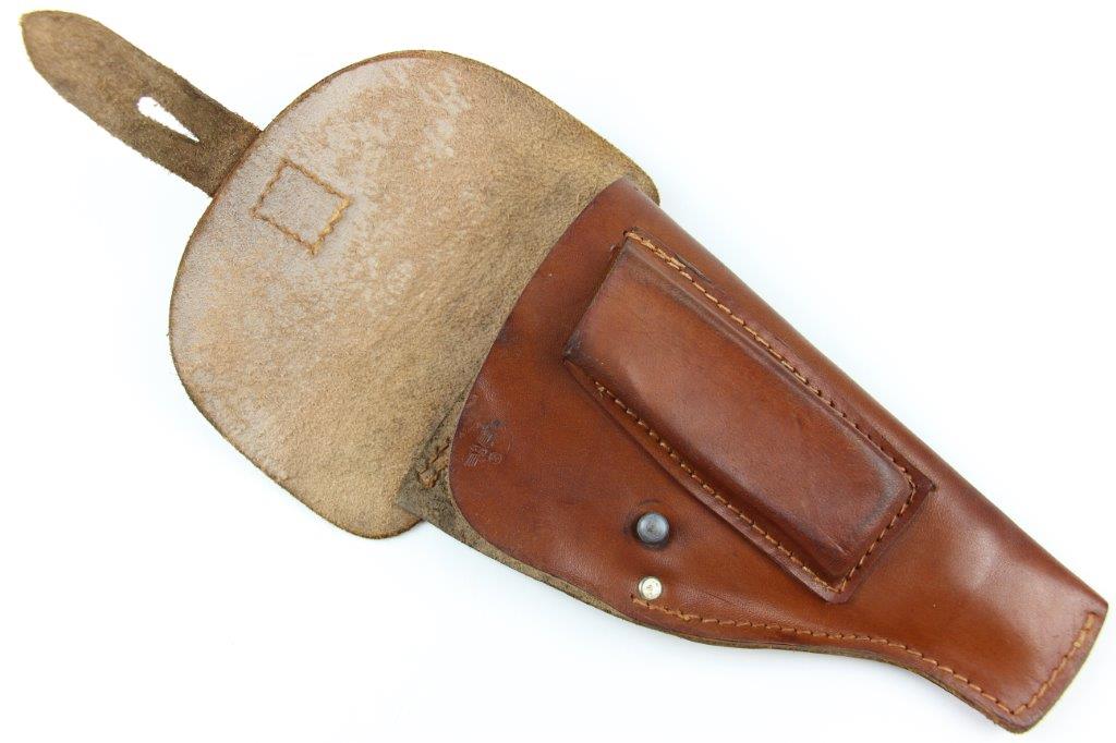4/5/24 – This is an original WW2 production Police issued holster for a 7.65mm pistol such as the Walther PP. The holster is in excellent condition with only mild signs of use. The leather has normal pliability and is soft throughout. All original stitching intact. The only marking is a Police eagle proof stamp on the front leather, underneath the closure flap. Wartime steel closure knob. Measures about 8cm (roughly 7 inches) along the leading edge when closed. Would fit a variety of 7.65mm Axis pistols.