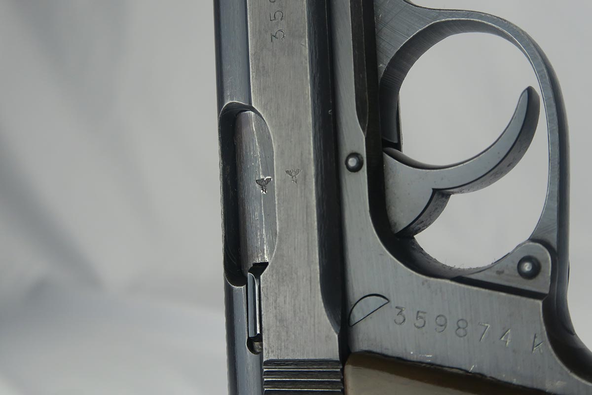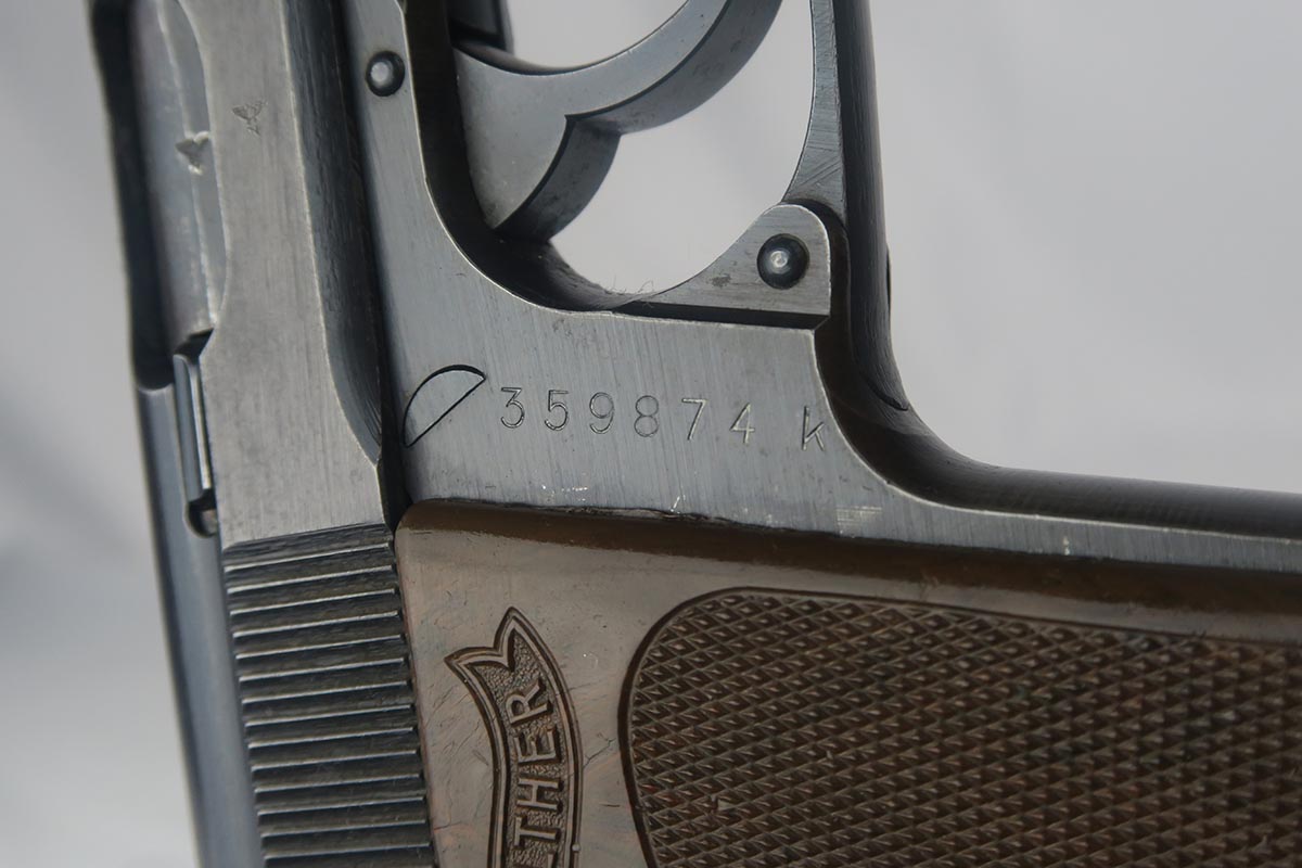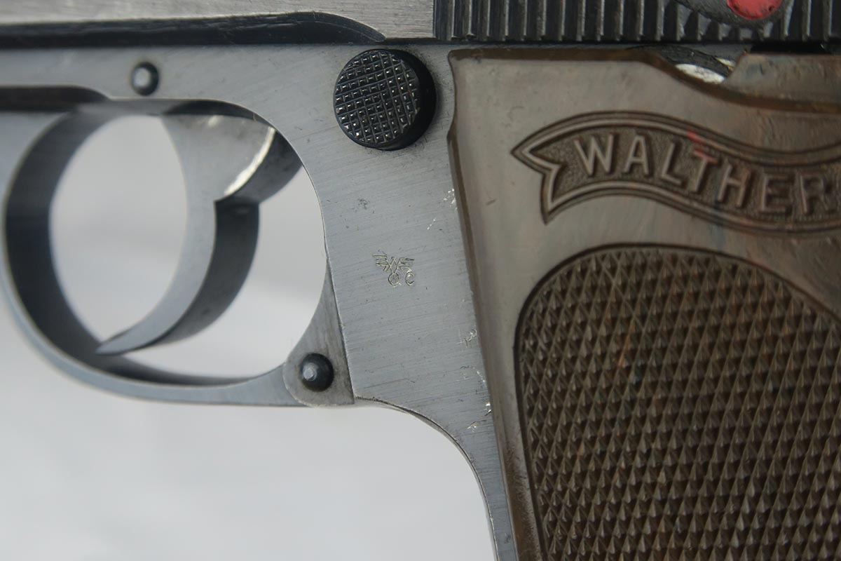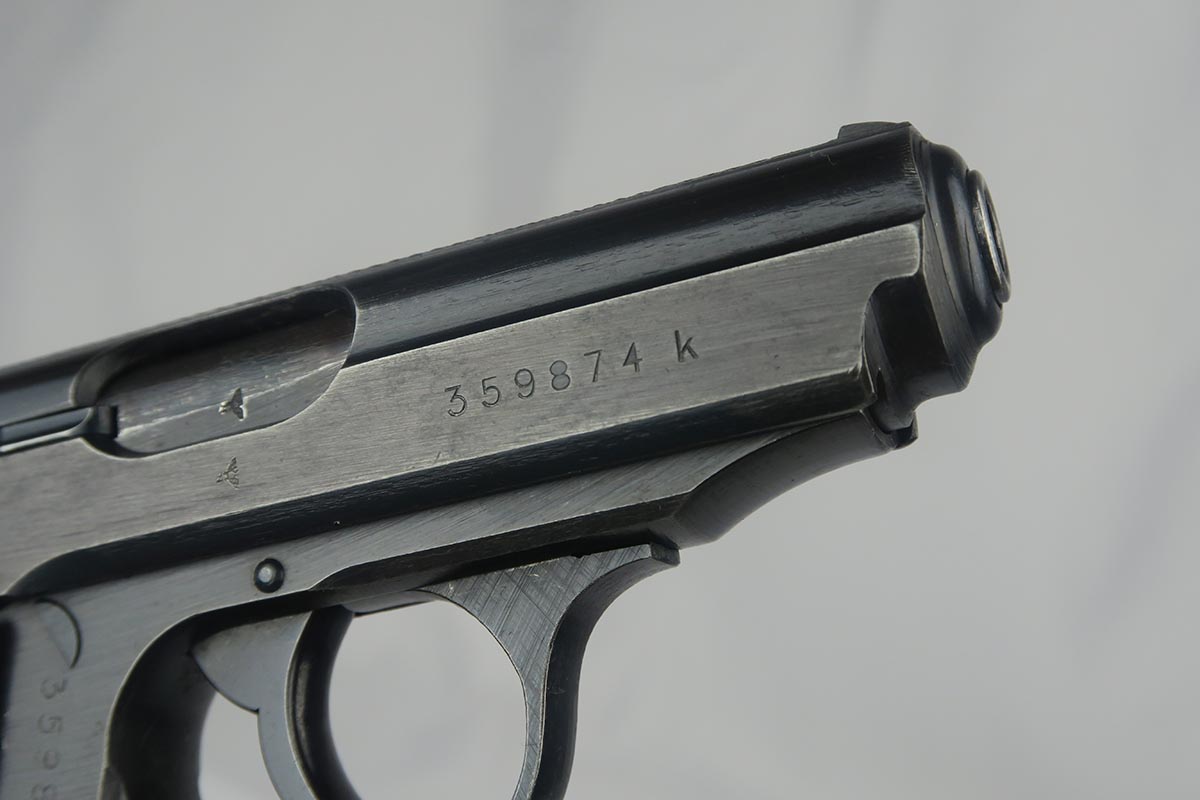 7/9/18 – This is a nice police-issued Walther PPK from World War II.  It is all original and correct with the later military bluing.  The finish rates at about 96-97% with minor muzzle wear and some thinning of the blue.  Proper wartime magazine but the extension is postwar.  Mint bore.