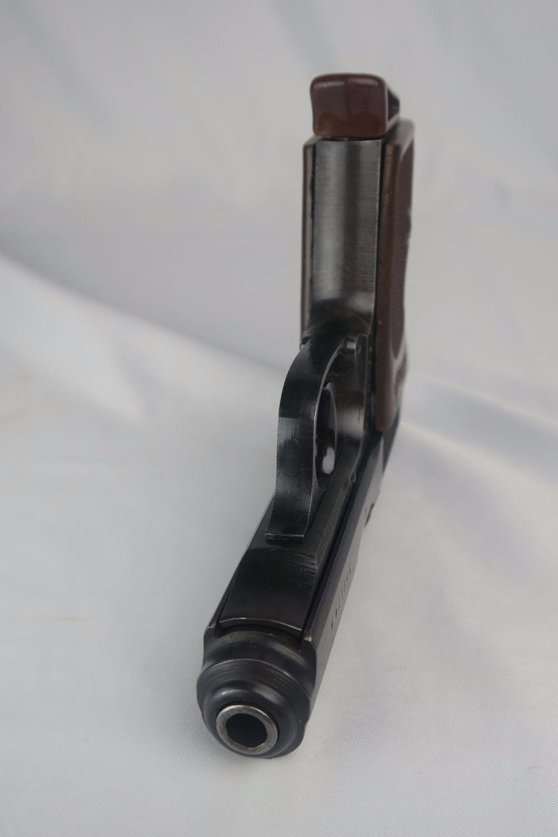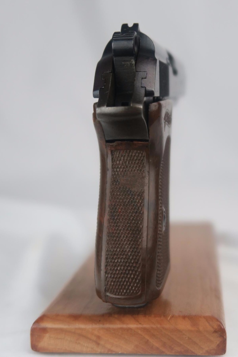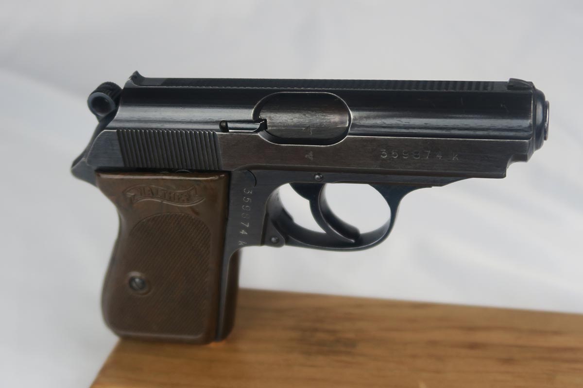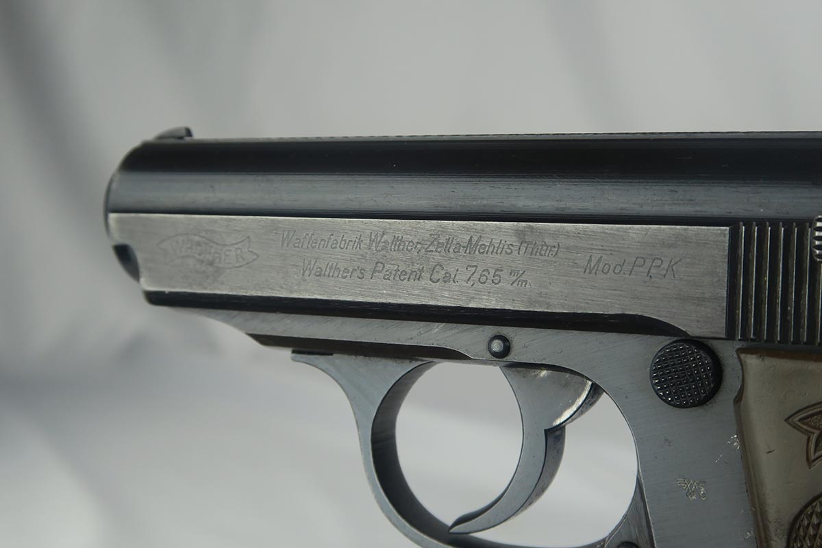 7/9/18 – This is a nice police-issued Walther PPK from World War II.  It is all original and correct with the later military bluing.  The finish rates at about 96-97% with minor muzzle wear and some thinning of the blue.  Proper wartime magazine but the extension is postwar.  Mint bore.