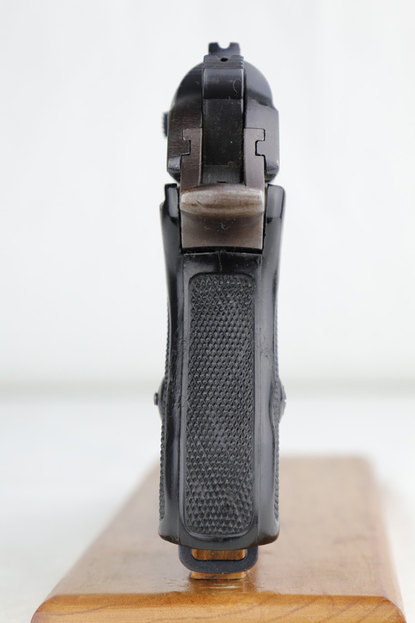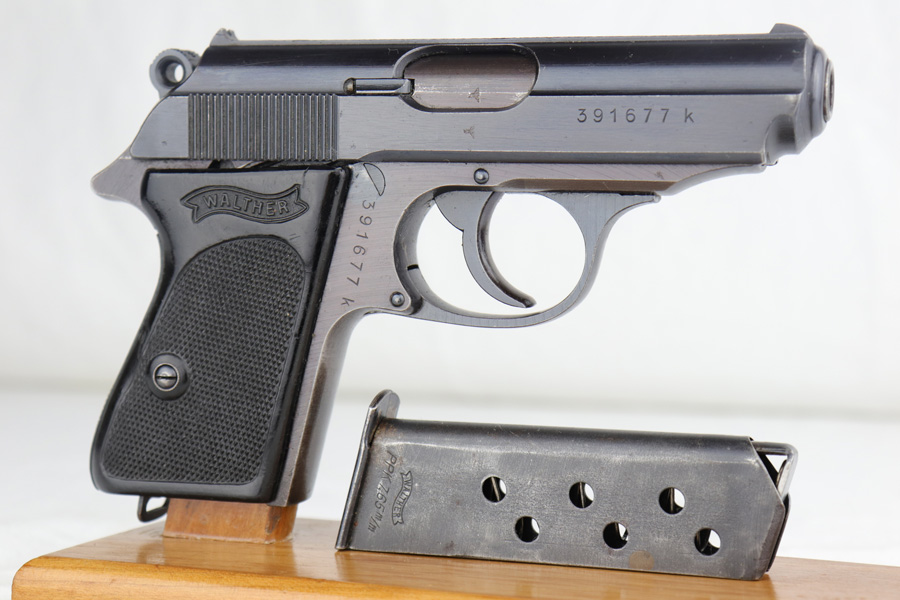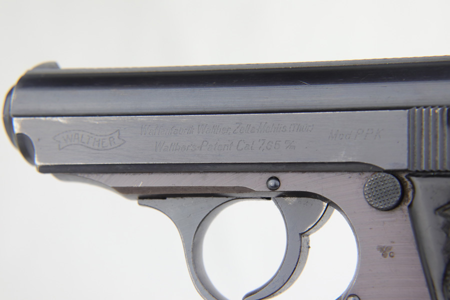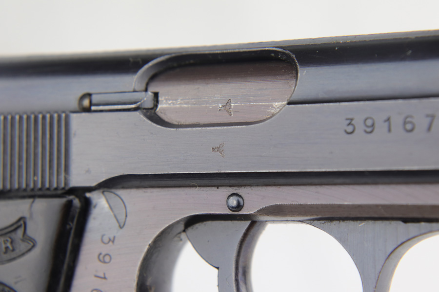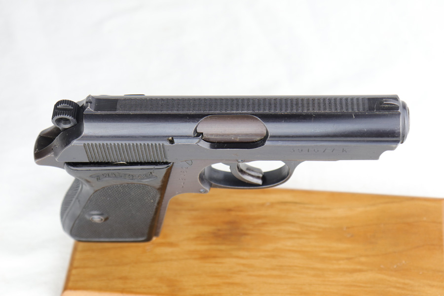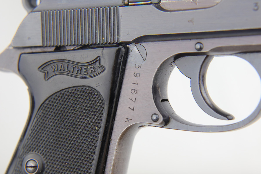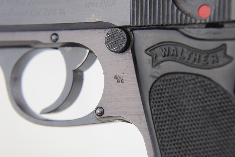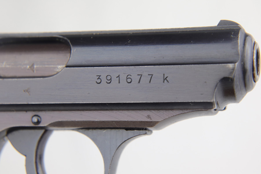 3/26/20 – This is a later WW2 production Walther PPK made for the German police. The pistol has some late war features such as a dust blued finish and black grip. The frame has a plum color to it, which was a result of finish alterations to save money / time / resources by the German military. The pistol has a police eagle/C proof on the left side of the frame. Very nice overall condition with most of the wear on the front strap. The grip has the typical small crack on the spine, but is in great shape overall. Very clean bore as well rates 9/10 – shiny with nice rifling. Mechanically sound and all original.