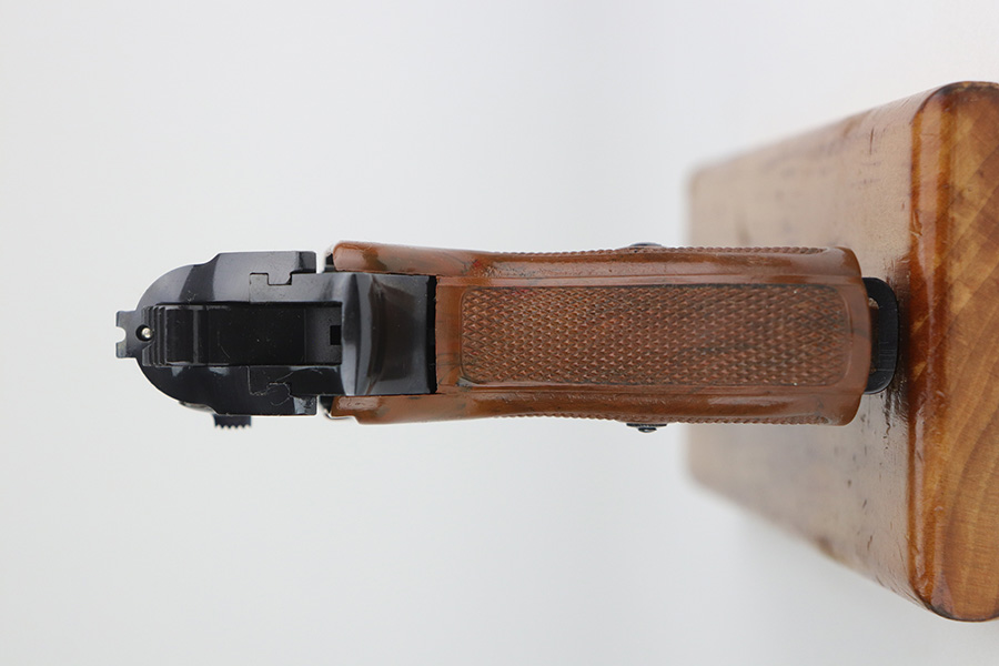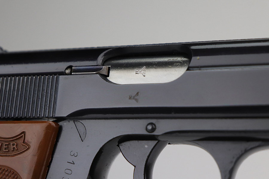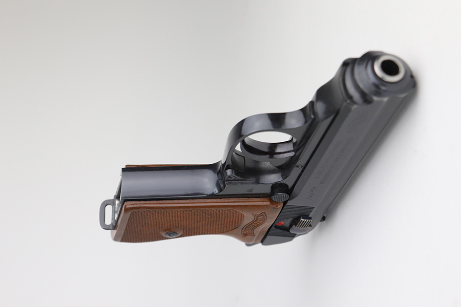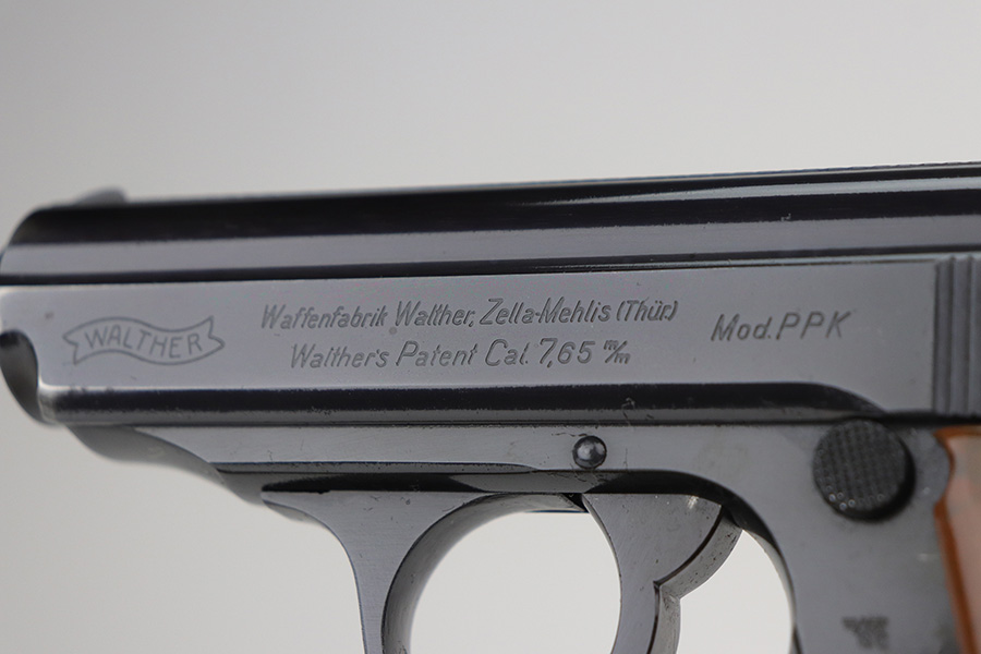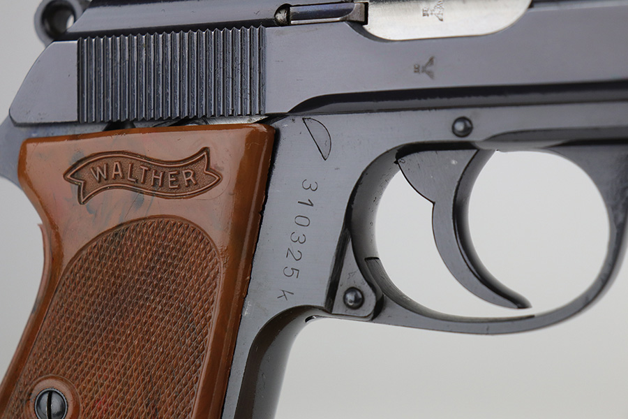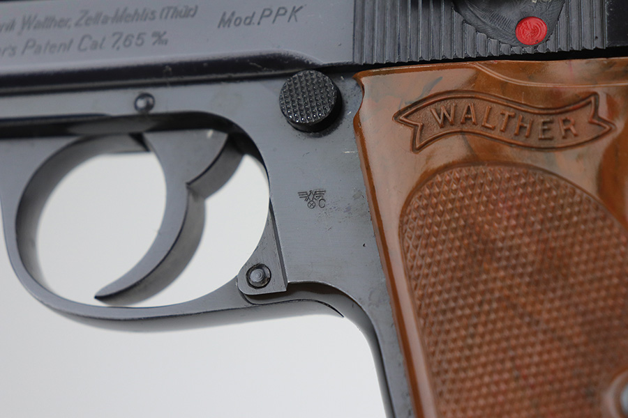 11/15/21 – This is a near-mint Police Walther PPK, in about 98-99% original condition, with only minor muzzle wear.  It has a minty grip with no cracks or chips, and a beautiful wartime magazine.  Proper features for this serial range include the 60 degree safety, and E/N proofs on slide and frame. It’s a 2nd variation police PPK with Eagle/N proofs but high-polish blue.  Magazine is correctly flat-bottom, as all police PPK’s were issued as such.  Minty bore.