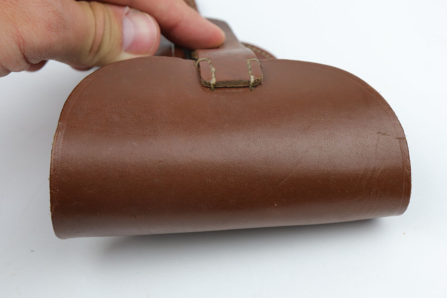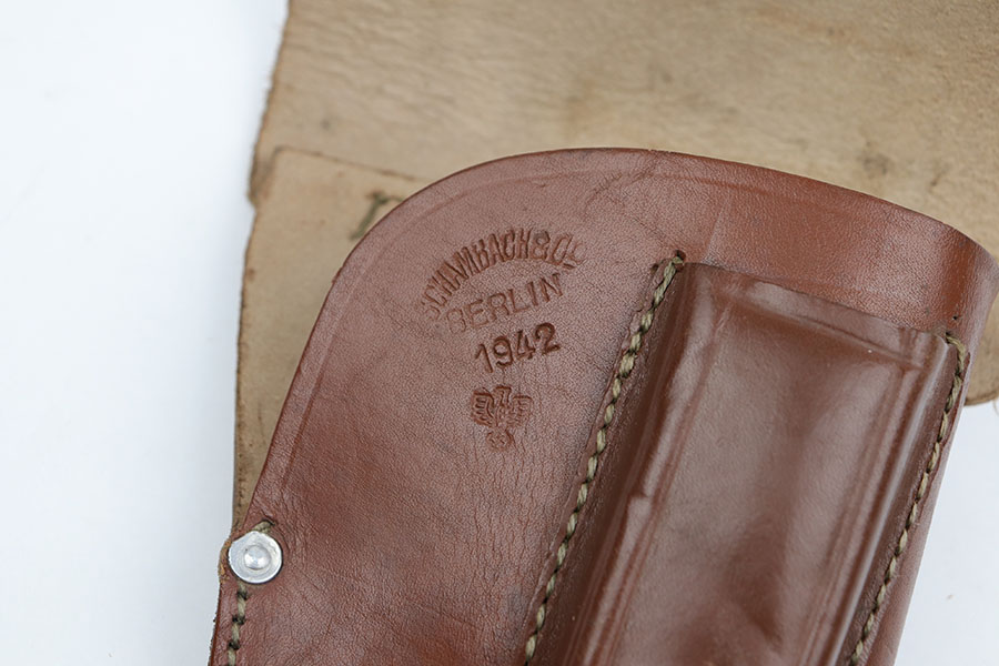 8/21/19 – This is an original police Walther PPK holster from WW2. The holster has a police eagle stamp on the front leather, along with a maker stamp and 1942 date stamp. The holster is in excellent, unissued condition. The closure strap hole looks like it’s never been around the knob, and getting this holster to stay closed may be an issue at first. Also a PPK might not fit perfectly in the current state, so you might need to “break it in” like a new baseball glove. Or leave it alone if desired. All original and authentic.