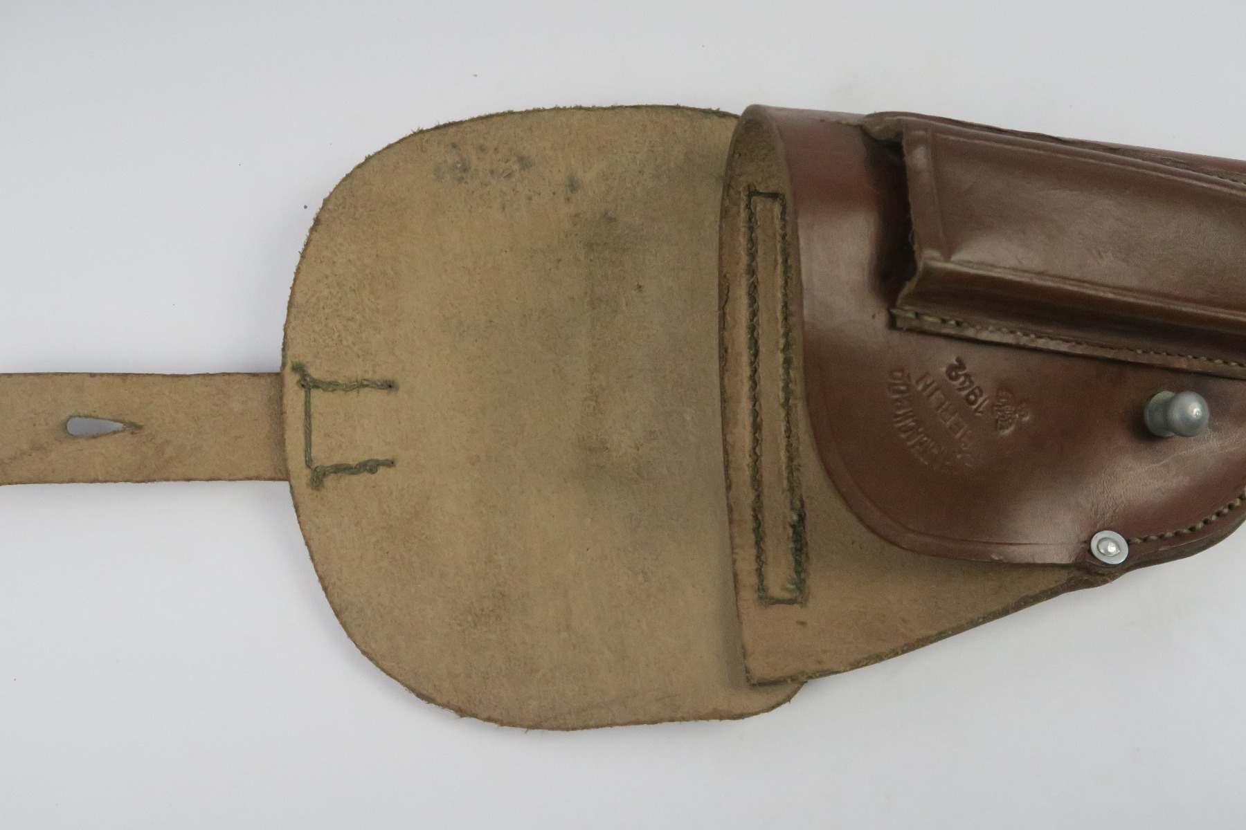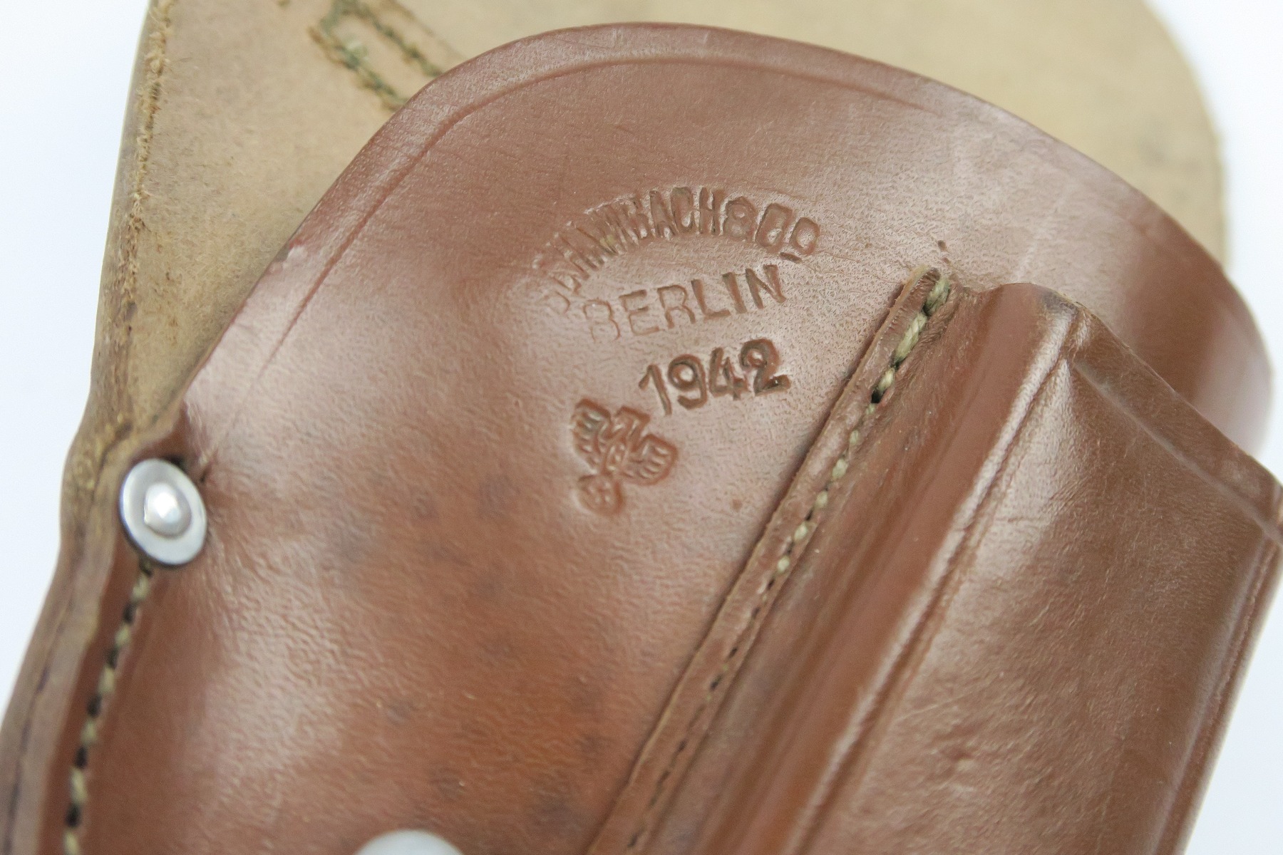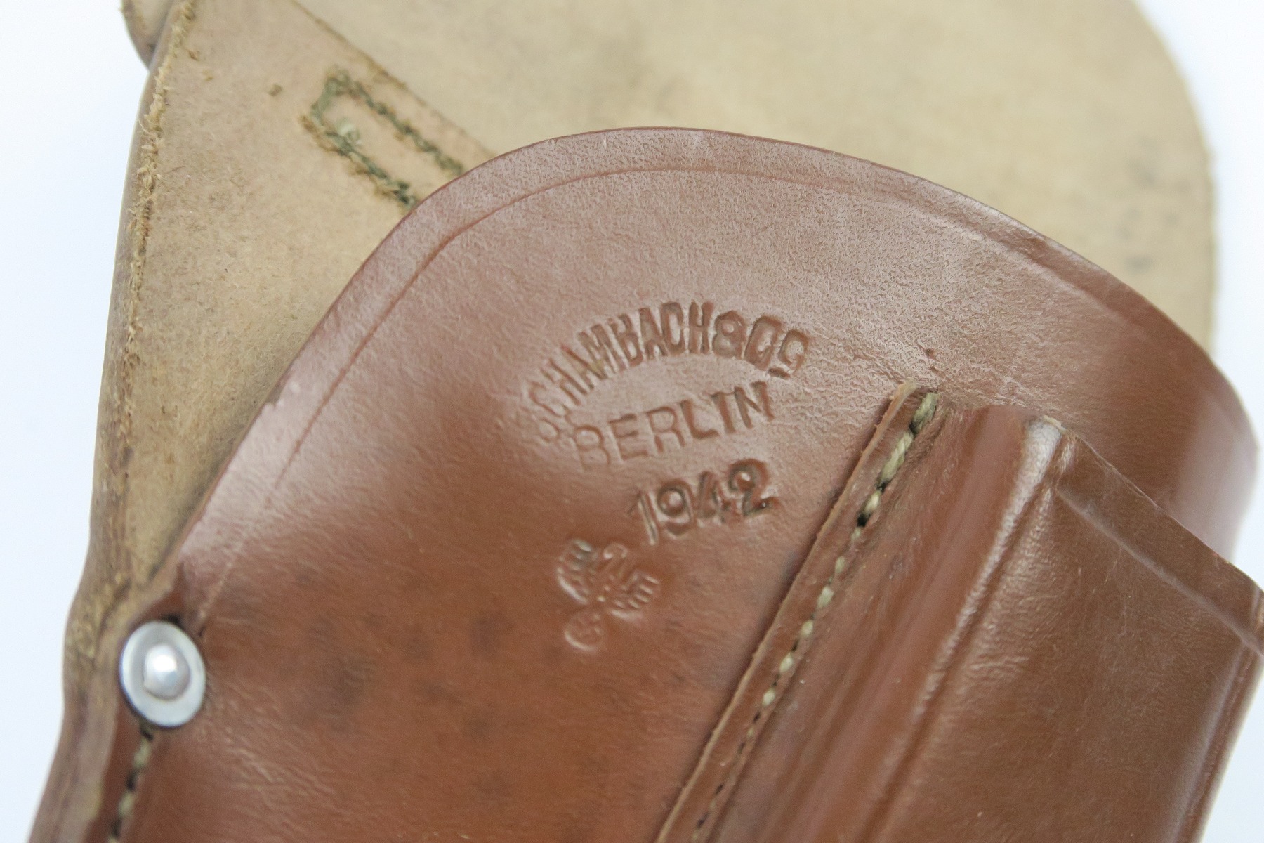 1/23/18 – This is an original WW2 production Police Walther PPk holster. The holster has a maker stamp on the front leather by SCHAMBACH & Co. and is 1942 dated with a police eagle proof stamp. There are no other markings. The holster is in unissued condition with very firm leather. The stitching is all tight and original with no missing stitches. The leather is very clean, but the backside does have some dark spots. A Walther PPk does fit, but it’s very snug and the leather needs to stretch a little. Guaranteed original.