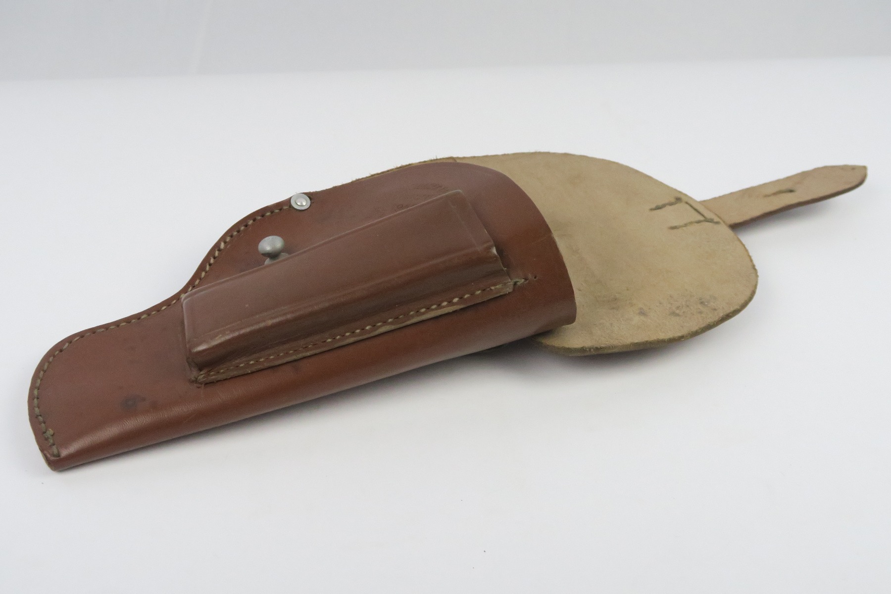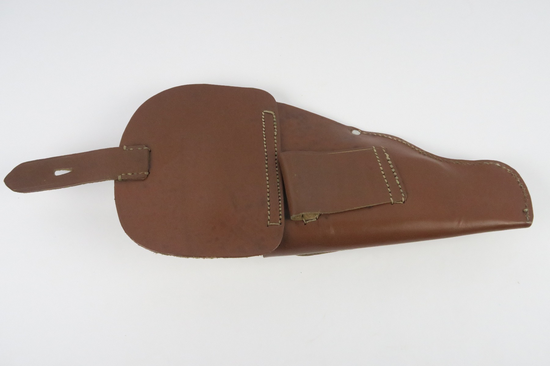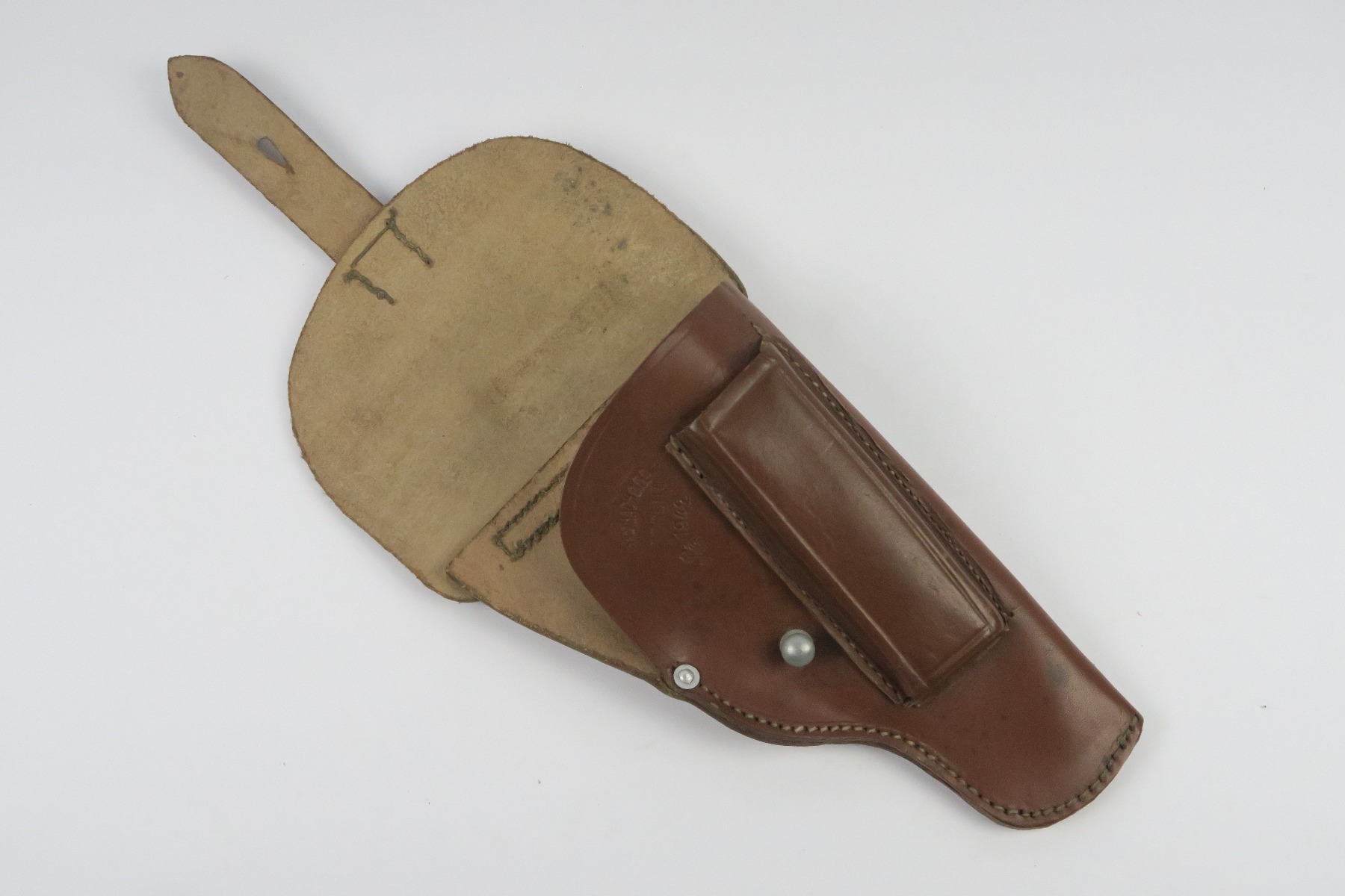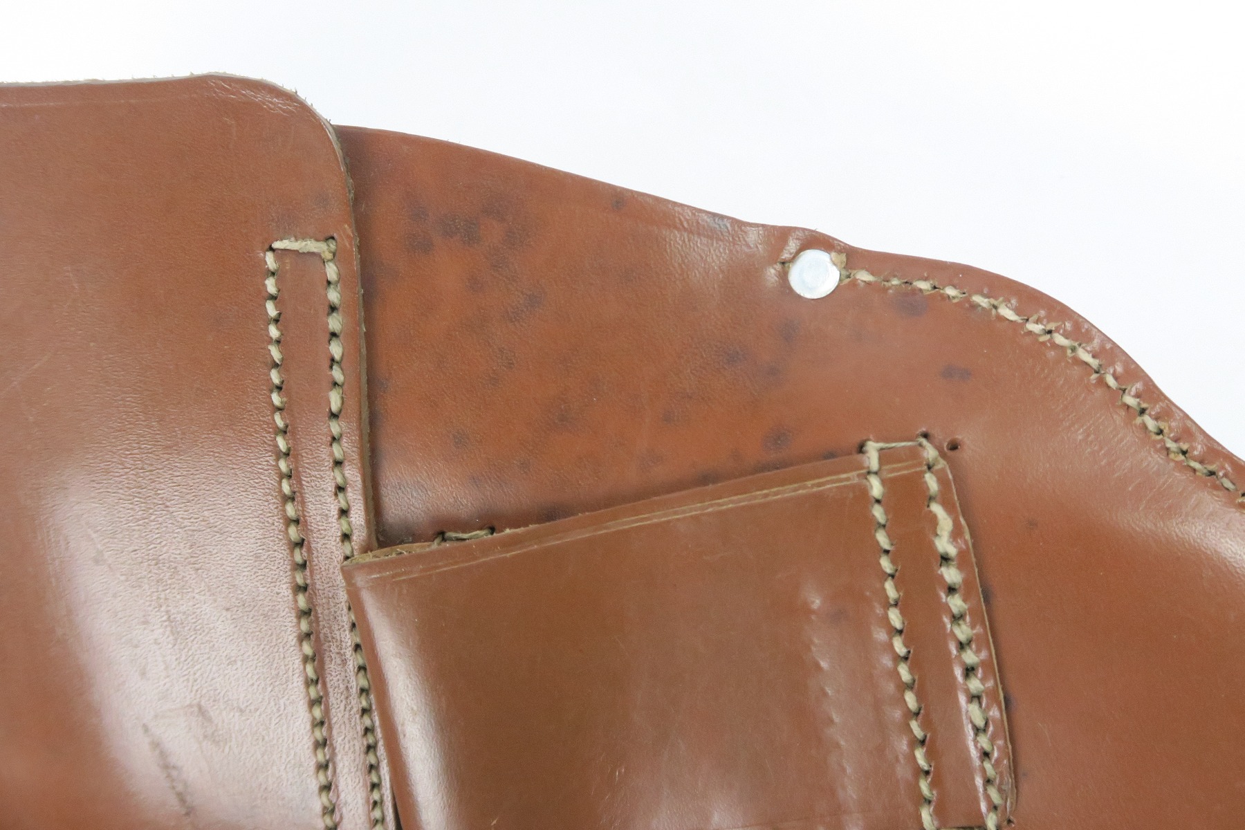 1/23/18 – This is an original WW2 production Police Walther PPk holster. The holster has a maker stamp on the front leather by SCHAMBACH & Co. and is 1942 dated with a police eagle proof stamp. There are no other markings. The holster is in unissued condition with very firm leather. The stitching is all tight and original with no missing stitches. The leather is very clean, but the backside does have some dark spots. A Walther PPk does fit, but it’s very snug and the leather needs to stretch a little. Guaranteed original.