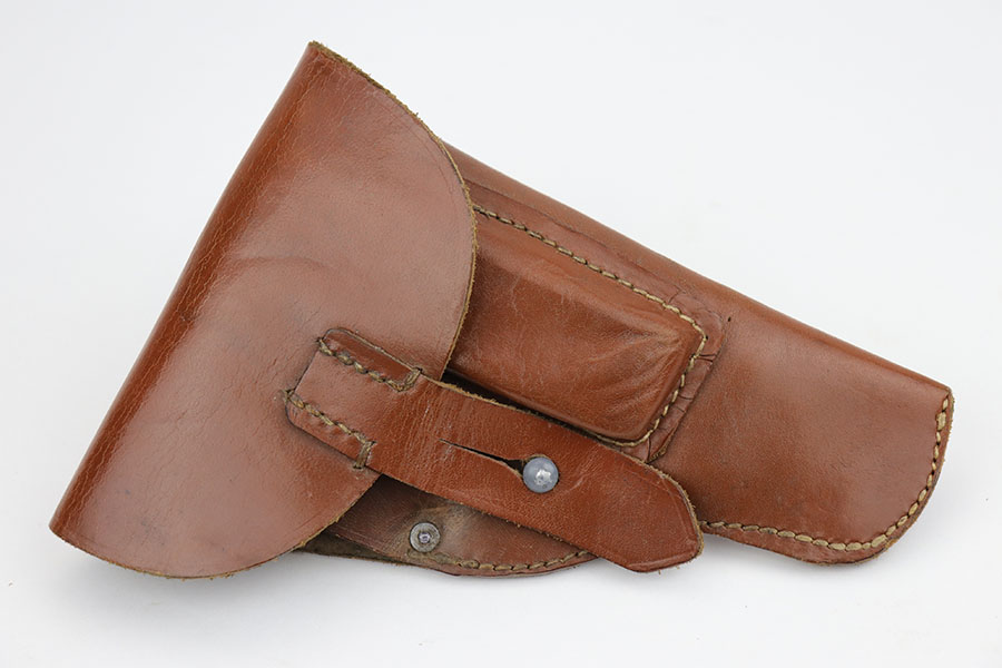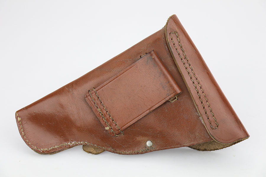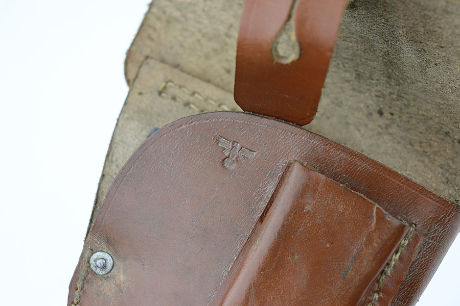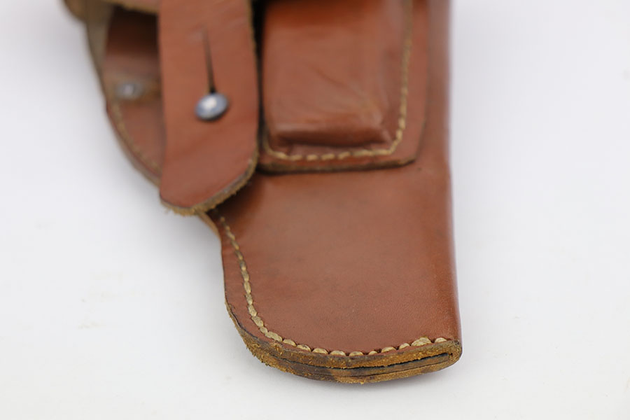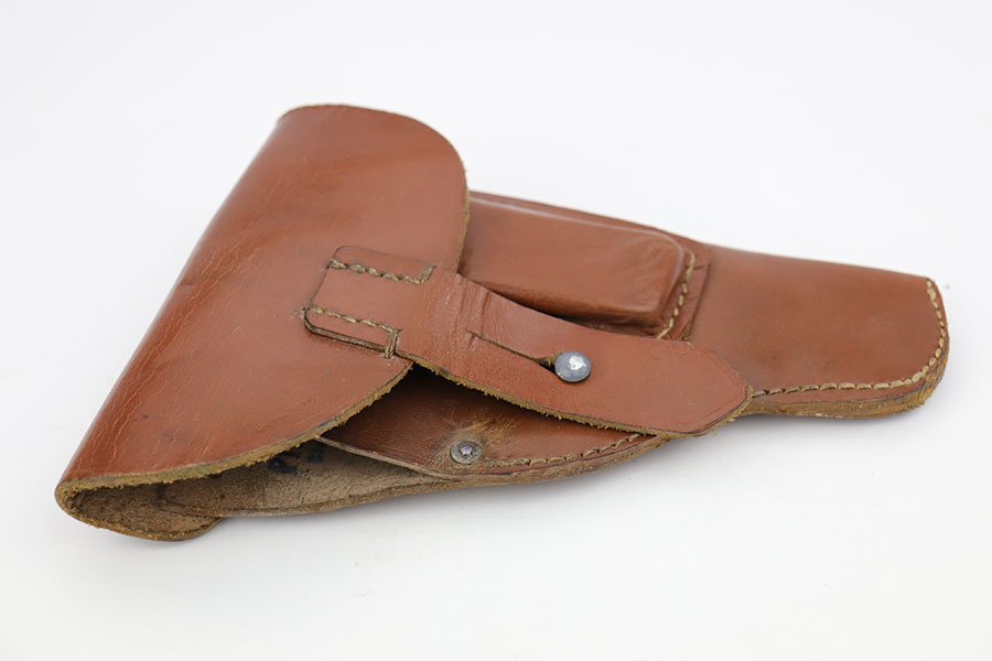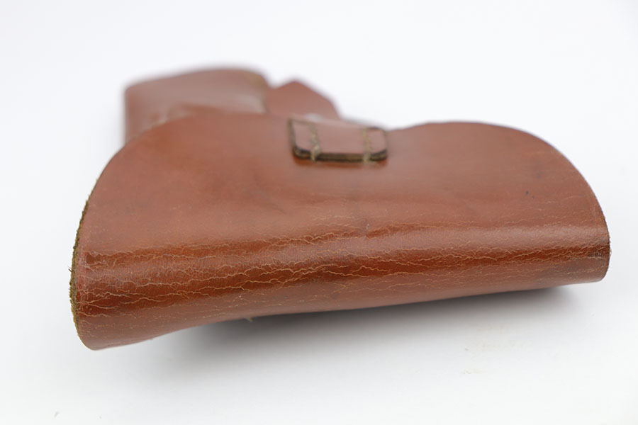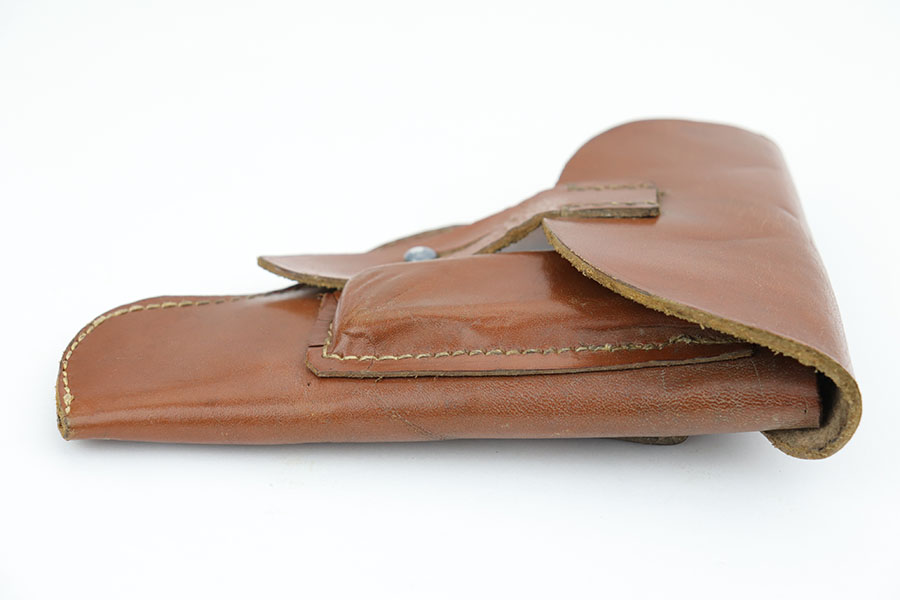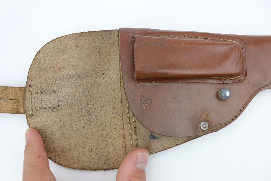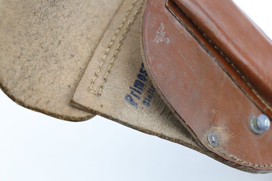 9/30/19 – This is a police style Walther PPK holster. This holster would also suit a WW2 era Sauer or Mauser police pistol. The holster is only marked with a police eagle stamp under the closure strap. There’s an interior “Primosa Stuttgart” ink stamp on the leather as well (place of manufacture). The holster has excellent strong leather and stitching all in tact. Very clean and almost unissued condition. Getting a pistol to fit in this would be tough, but that’s to be expected on these old minty holsters.