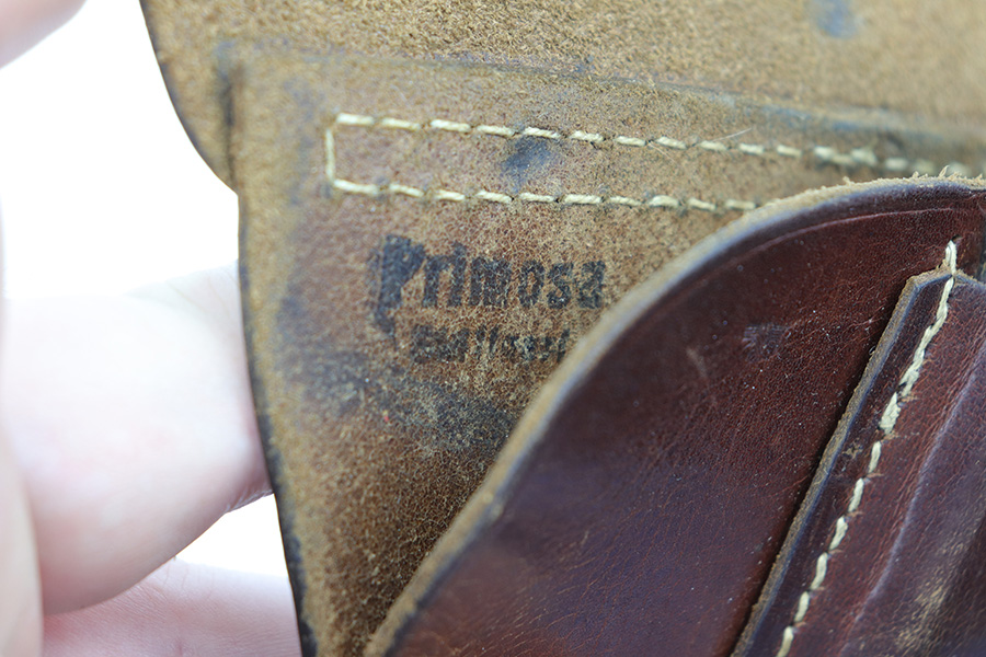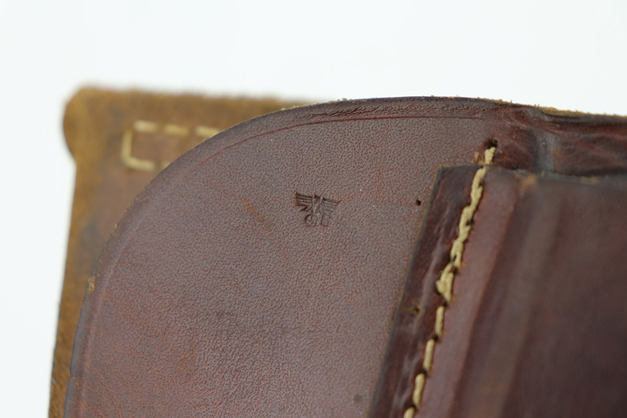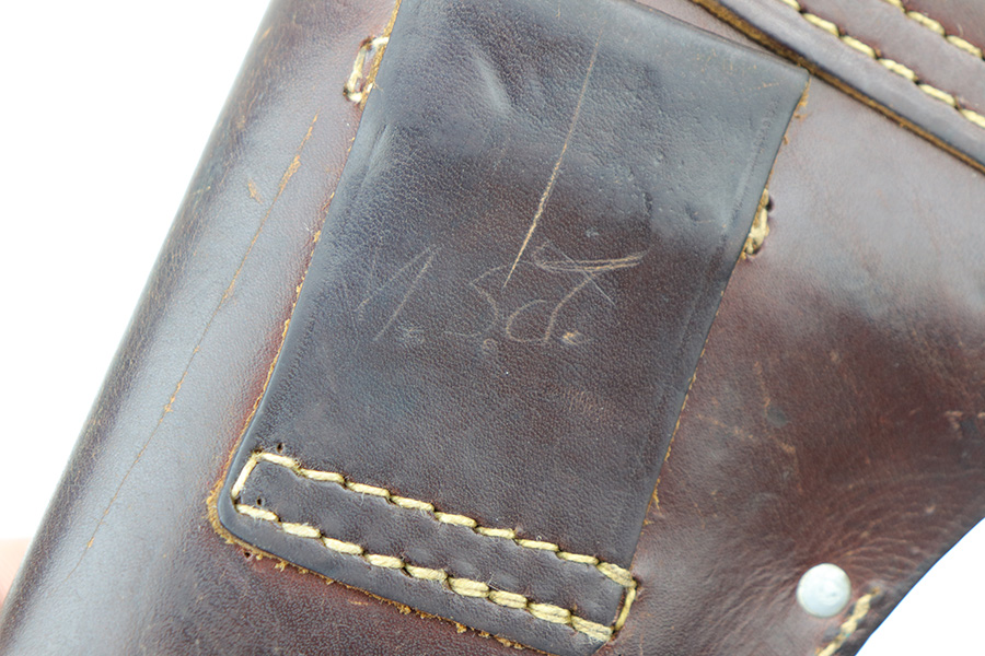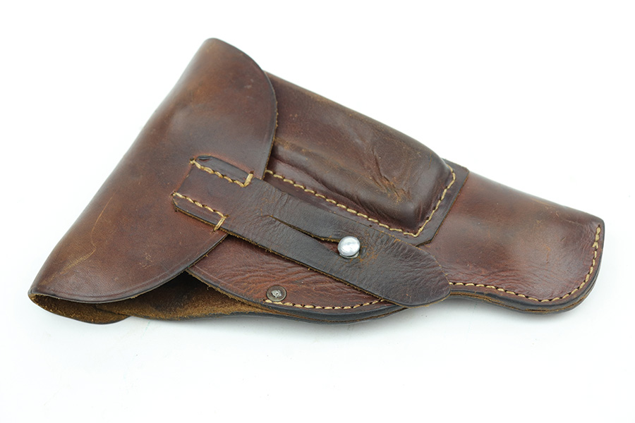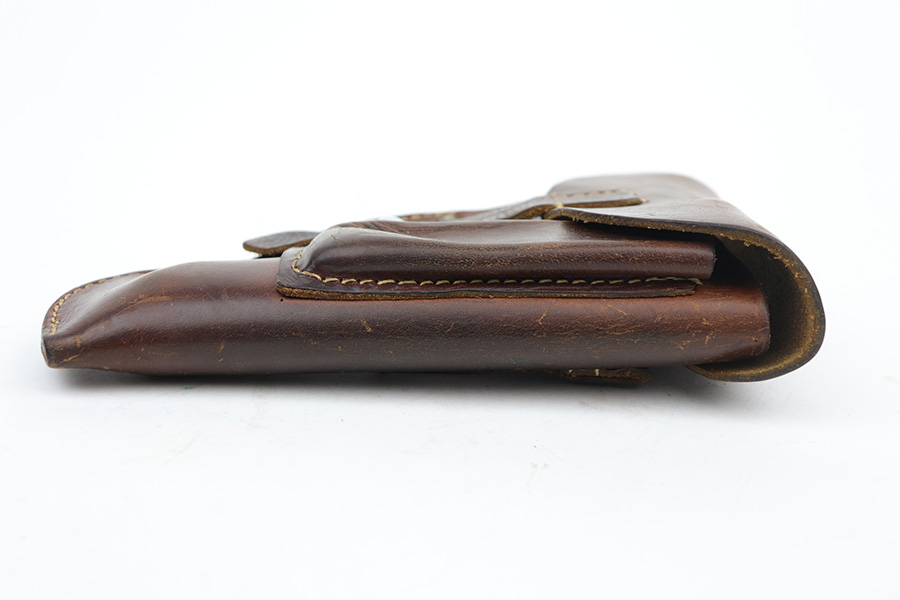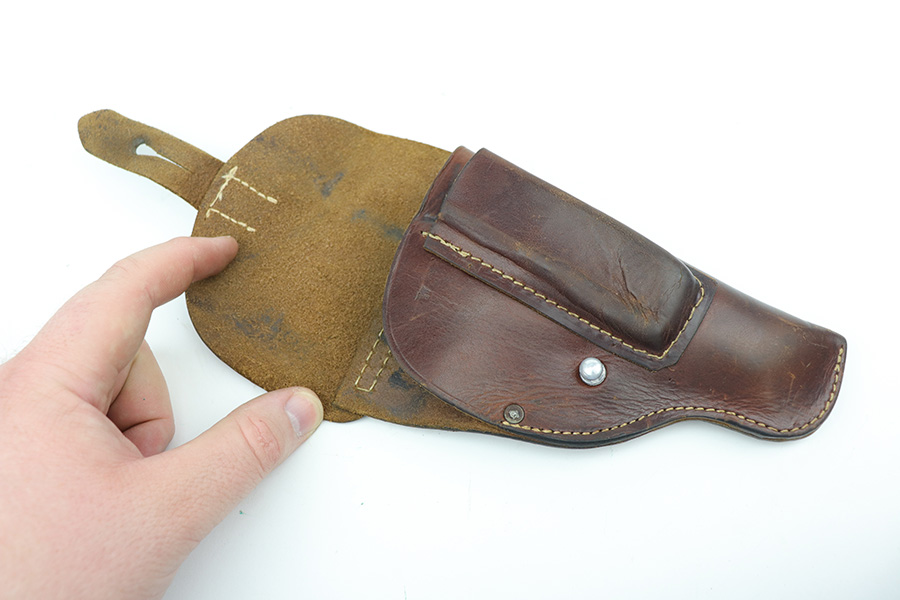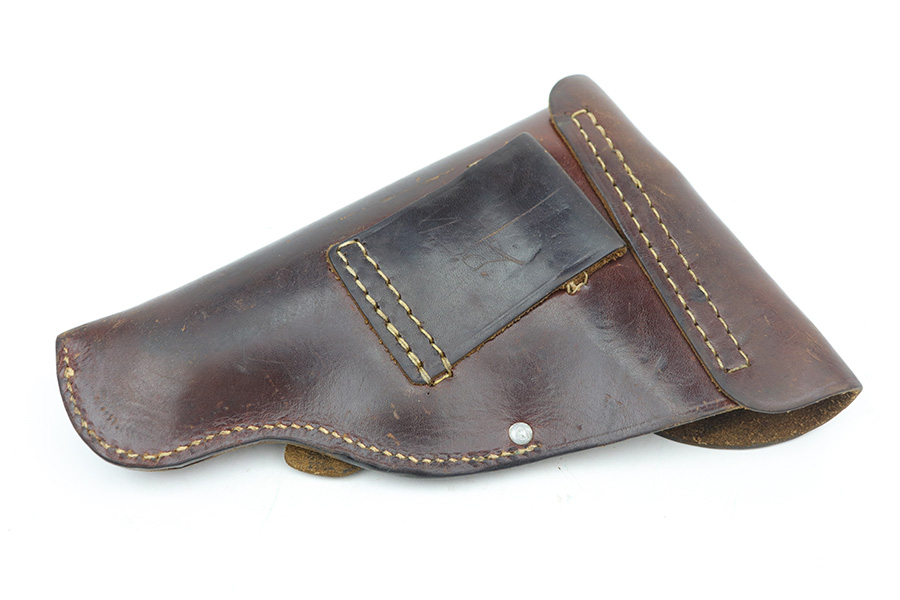 10/11/21 – This is an original WW2 production Walther PPK Police holster. The holster fits a Walther PPK, but not a Walther PP. the leather is police eagle/B proof stamped under the closure strap, and ink stamped on the interior leather “Primosa Stuttgart”. The leather shows normal pliability and typical signs of use with no excessive wear. All original stitching is in tact.