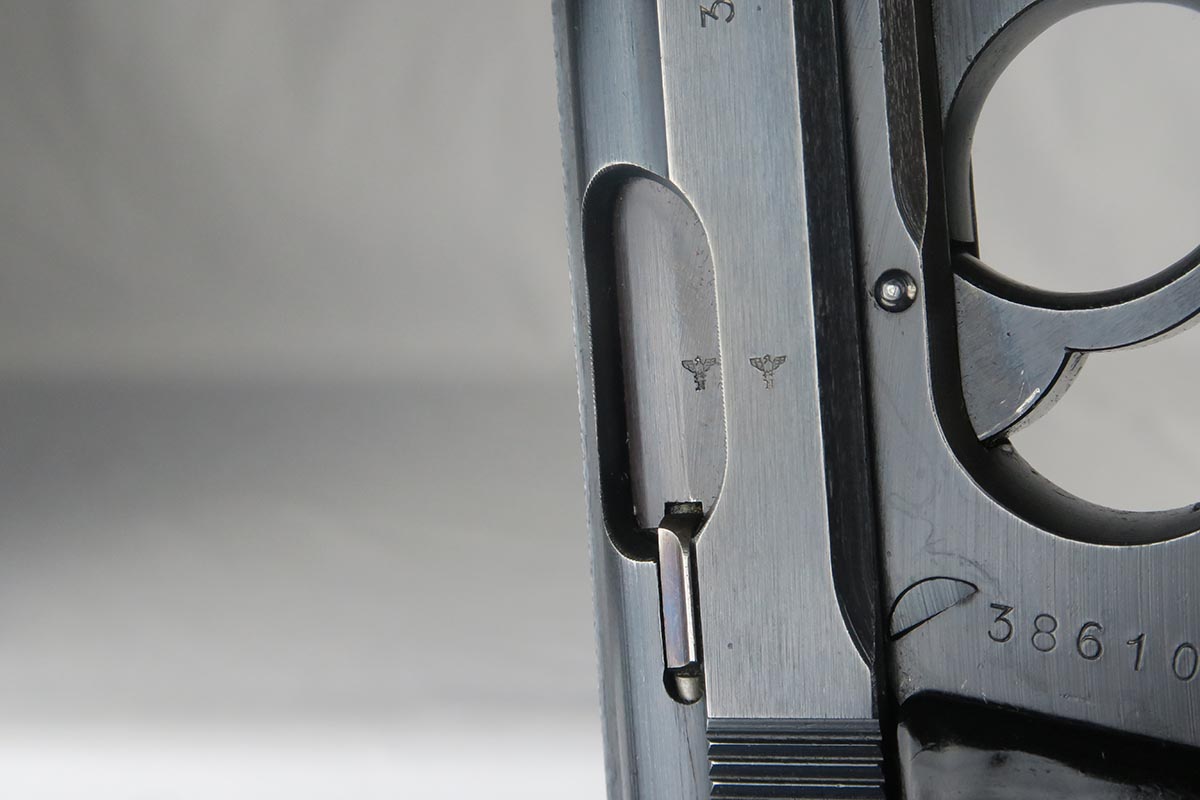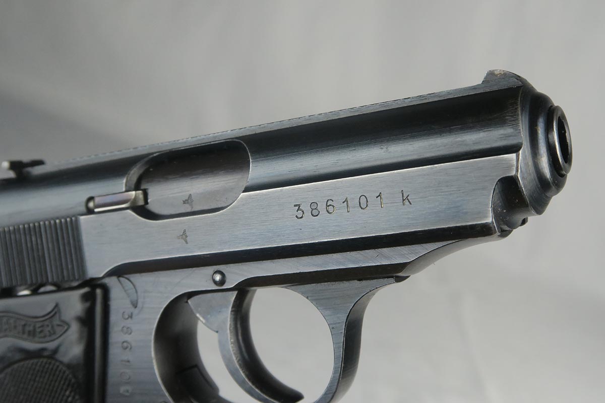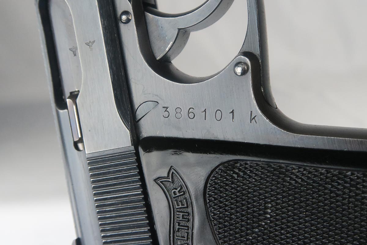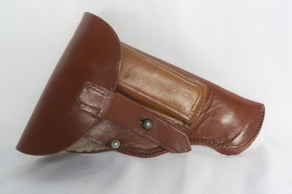 10/27/17 – This is an excellent police Walther PPK with similarly excellent police holster. The original military finish rates at about 98% with some thinning to the front strap and some muzzle wear on both sides of the slide. The police holster is 1942 dated and Berlin marked, and the serial of the pistol places it to the same year of manufacture. The black grip is excellent aside from a very thin hairline crack in the spine. Nice wartime magazine. Mint bore.