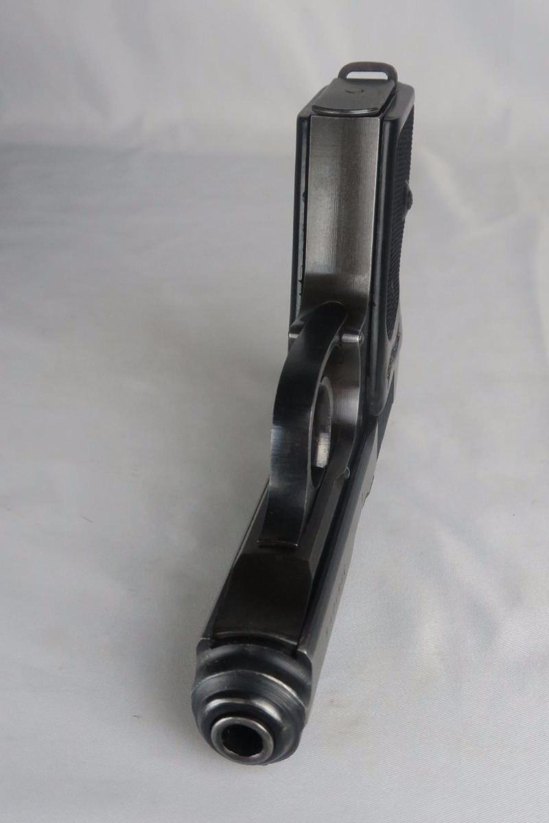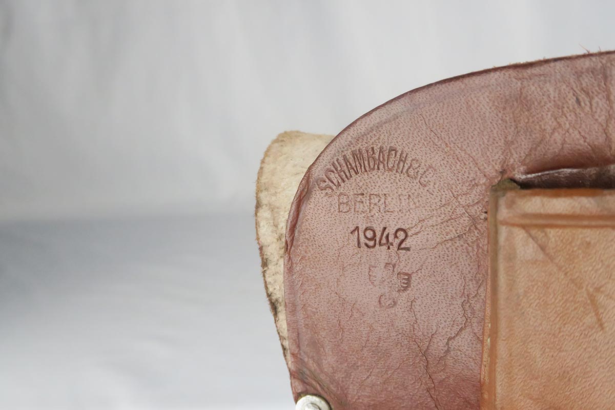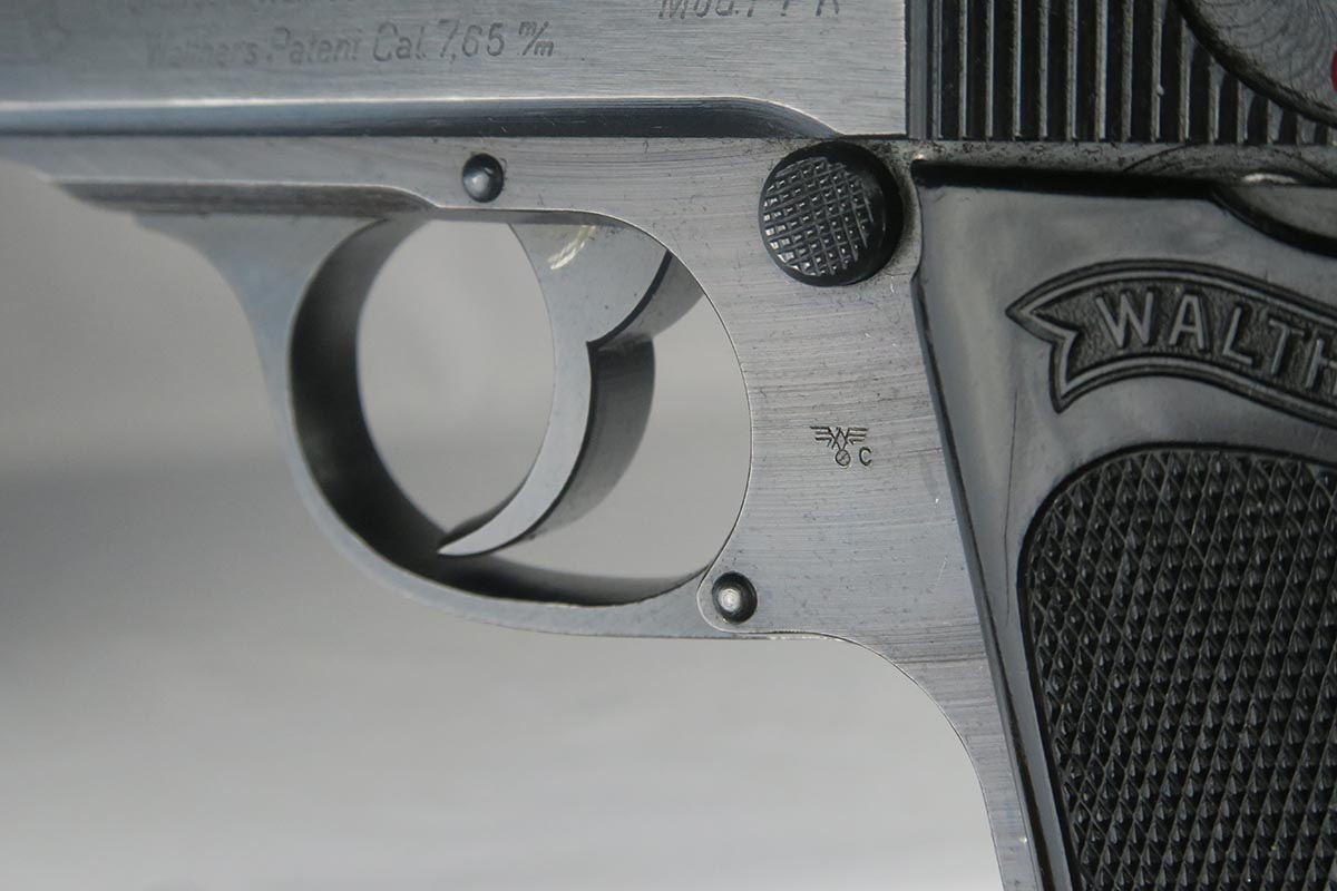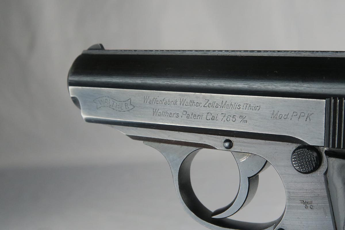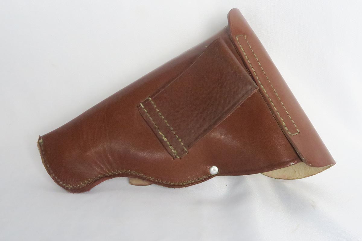 10/27/17 – This is an excellent police Walther PPK with similarly excellent police holster. The original military finish rates at about 98% with some thinning to the front strap and some muzzle wear on both sides of the slide. The police holster is 1942 dated and Berlin marked, and the serial of the pistol places it to the same year of manufacture. The black grip is excellent aside from a very thin hairline crack in the spine. Nice wartime magazine. Mint bore.
