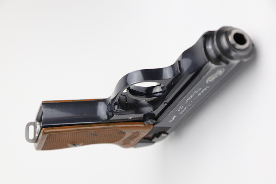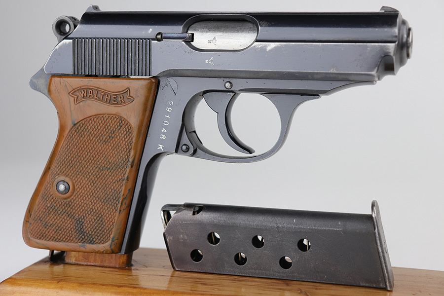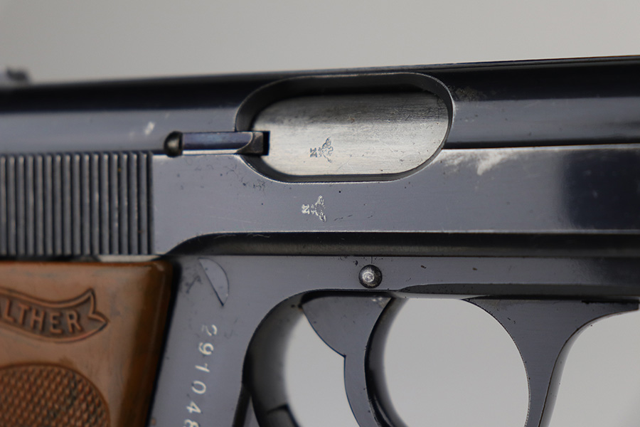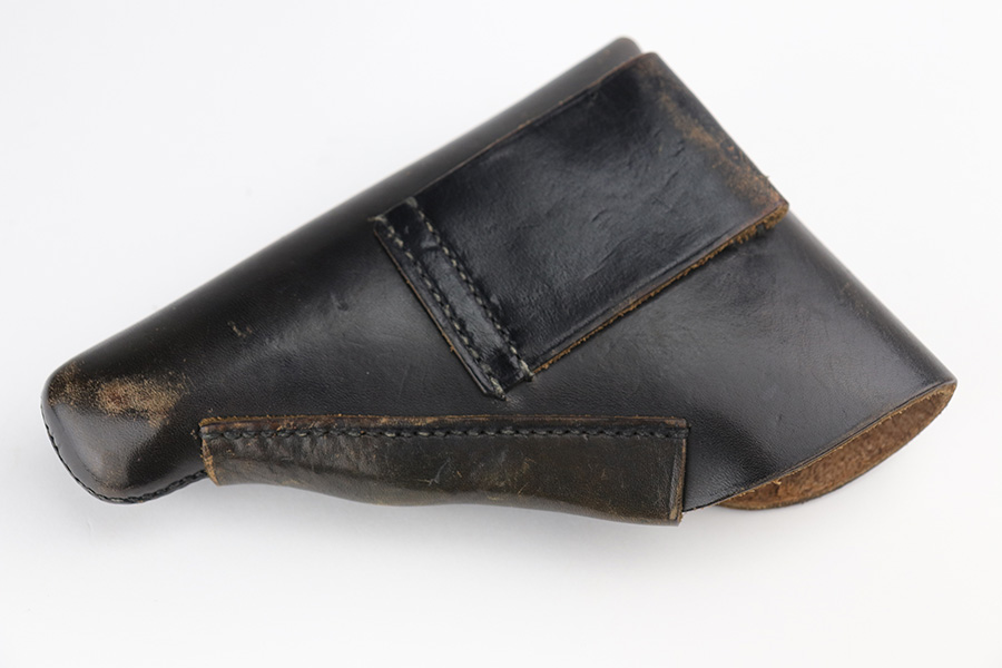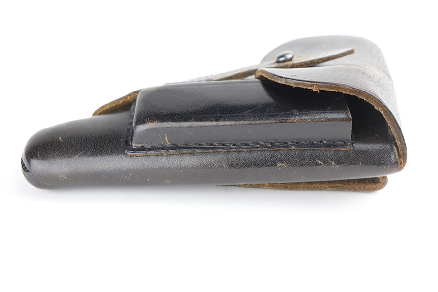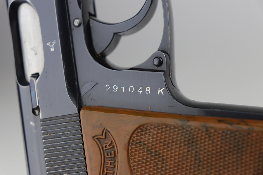 8/20/21 – This is a complete police-issued Walther PPK rig from 1940. The pistol is all original with maybe 90% of the original, high-polish blue remaining. Visible holster wear on both sides of the slide, most pronounced on rear left side of slide, left side muzzle and near the ejection port. Minty bore. Original grip has a small crack on each side. Rig includes two original magazines. Completed by a black PPK holster with fairly crisp internal Walther PPK insktamp.